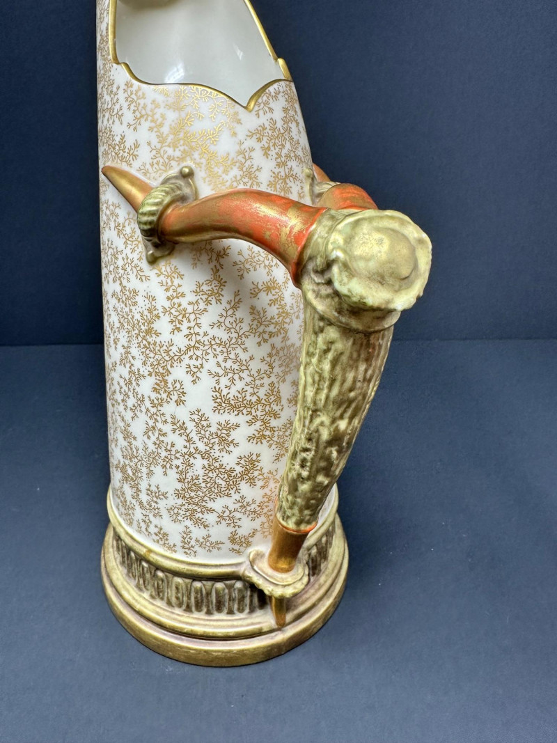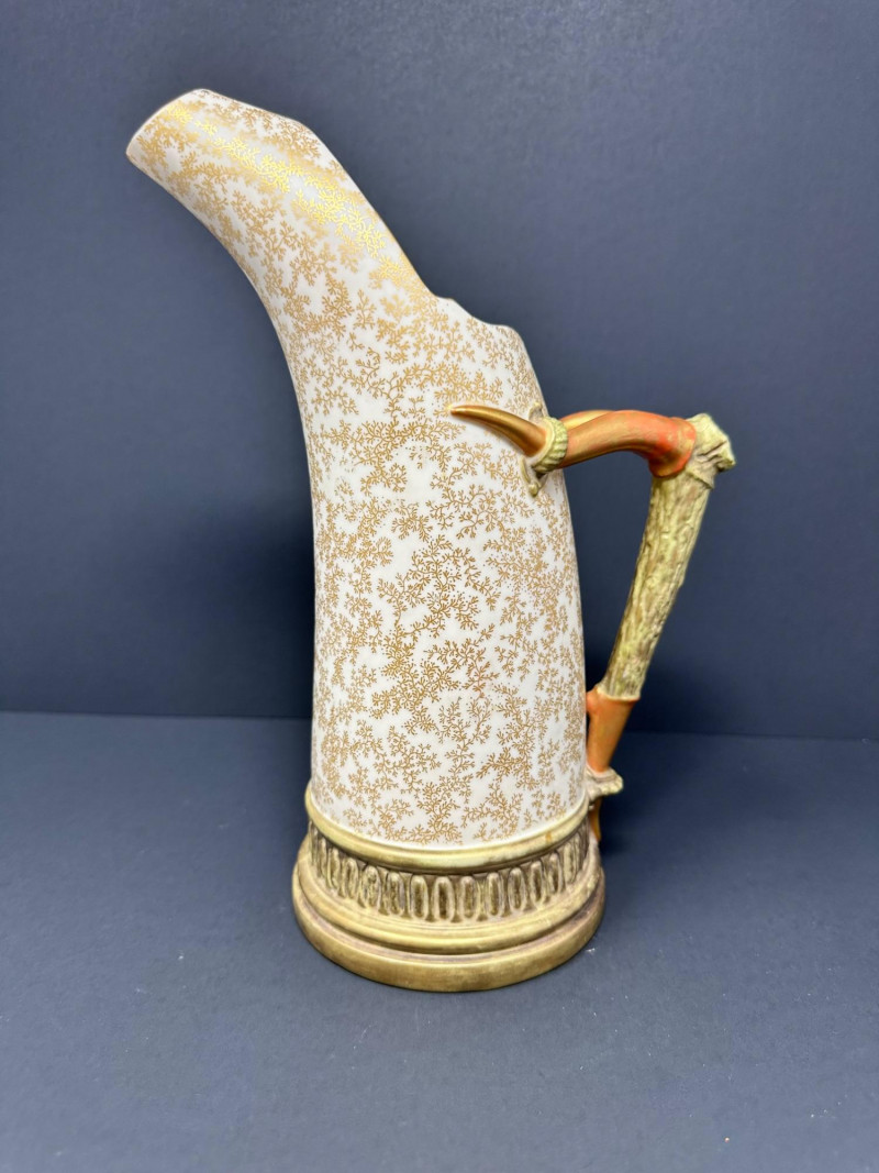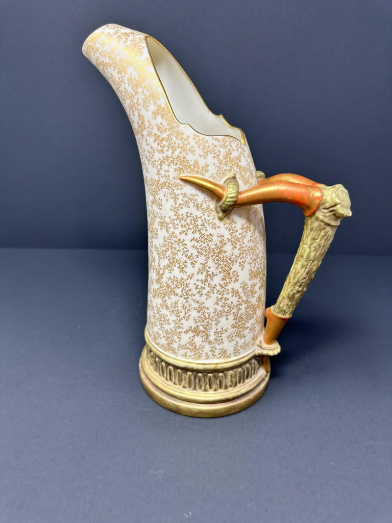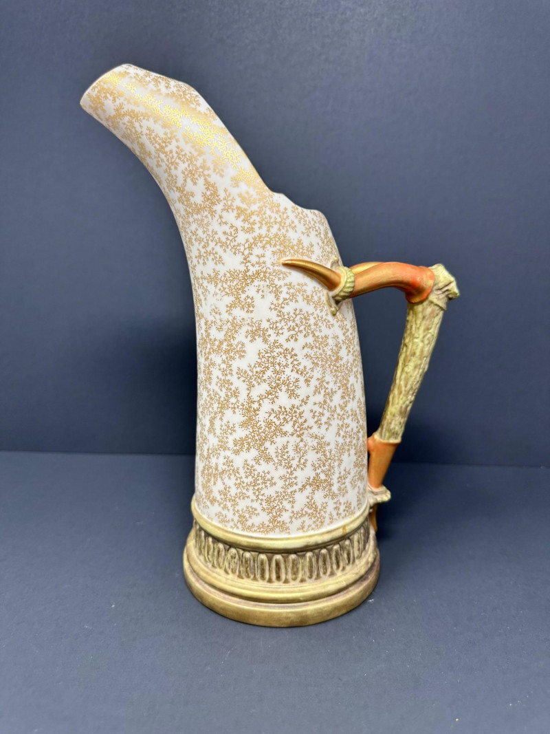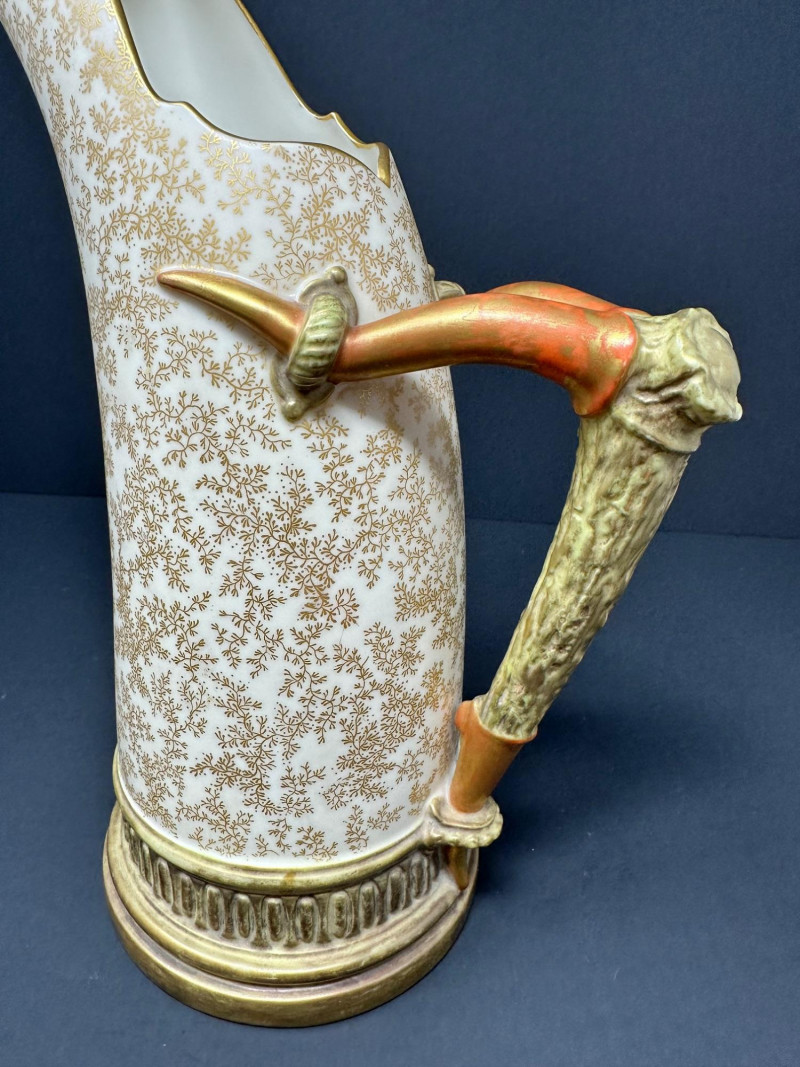 This is a Royal Worcester Blush Ivory Porcelain Pitcher, model number 1116, dating to circa 1888–1901. It features a hand-painted gilt floral motif on a soft ivory ground, with a distinctive antler-style handle glazed in earthy tones. The pitcher’s elegant silhouette and richly textured base band reflect Royal Worcester’s late Victorian design sensibilities. Pieces from this era are highly collectible, especially signed examples in excellent condition