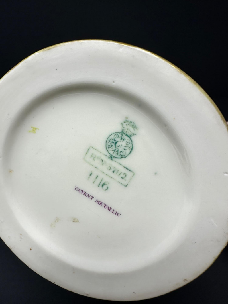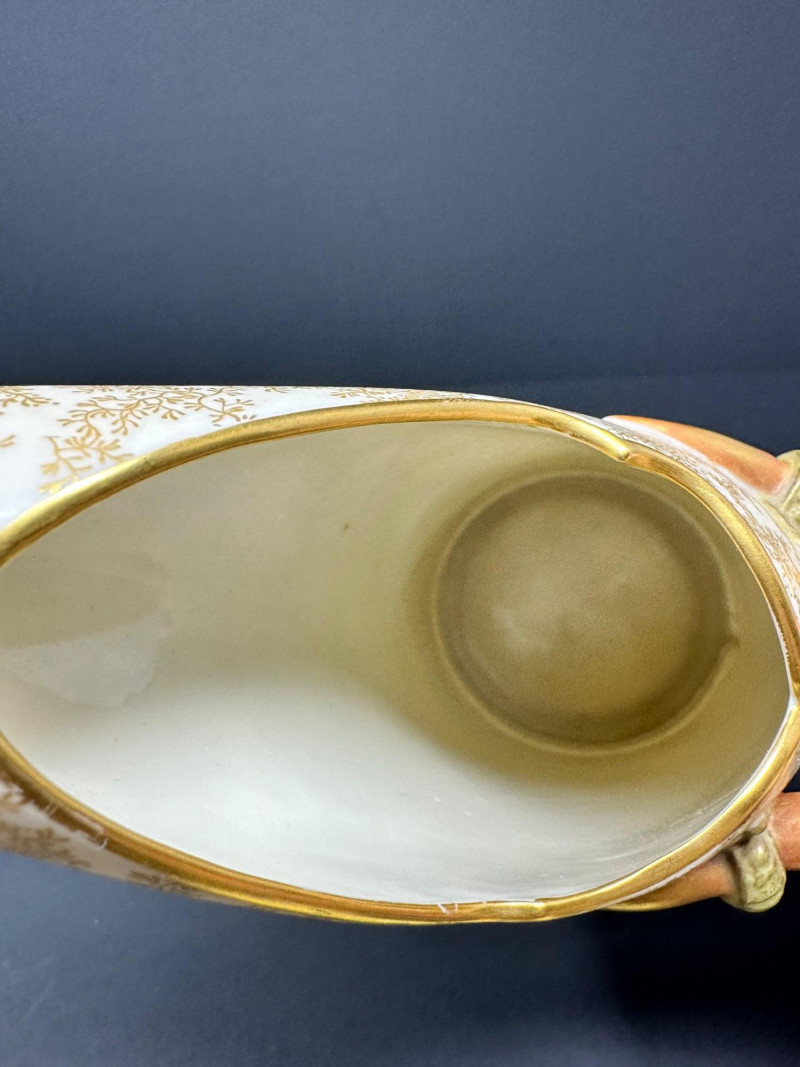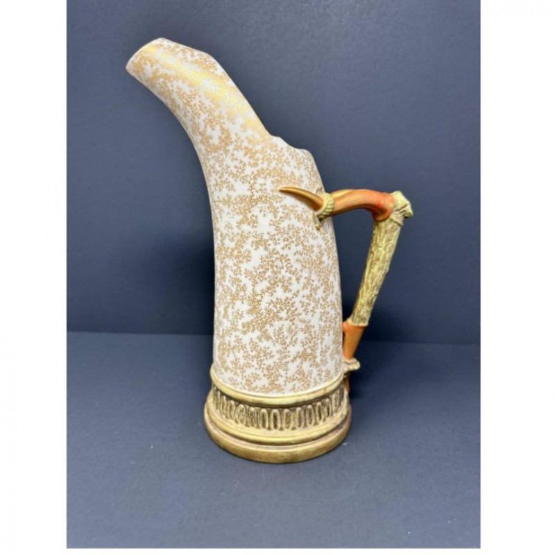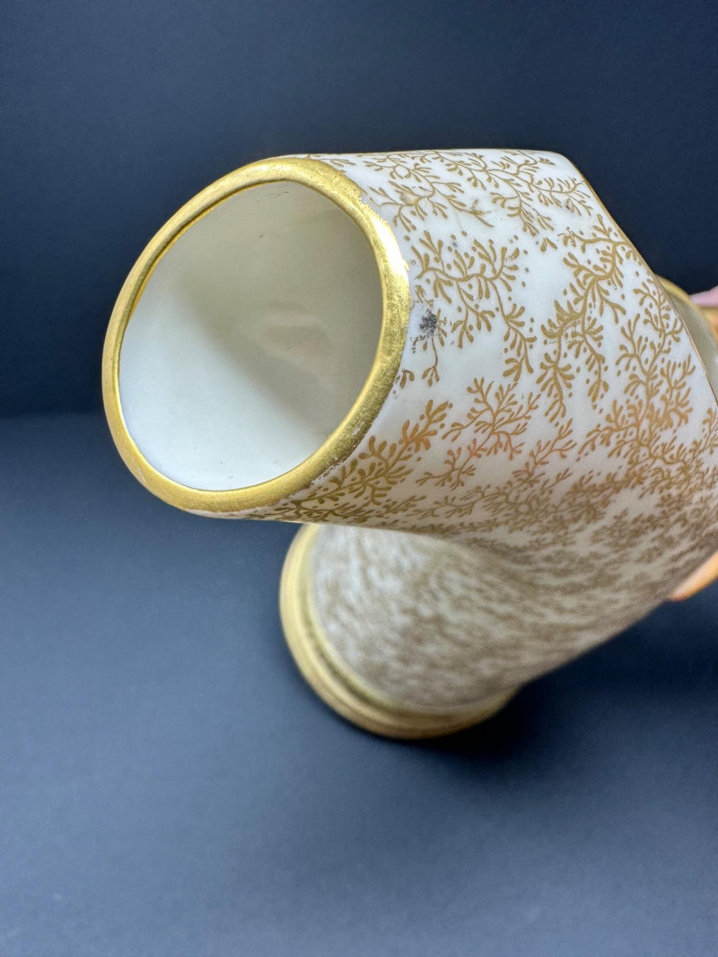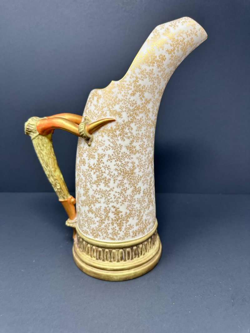 This is a Royal Worcester Blush Ivory Porcelain Pitcher, model number 1116, dating to circa 1888–1901. It features a hand-painted gilt floral motif on a soft ivory ground, with a distinctive antler-style handle glazed in earthy tones. The pitcher’s elegant silhouette and richly textured base band reflect Royal Worcester’s late Victorian design sensibilities. Pieces from this era are highly collectible, especially signed examples in excellent condition