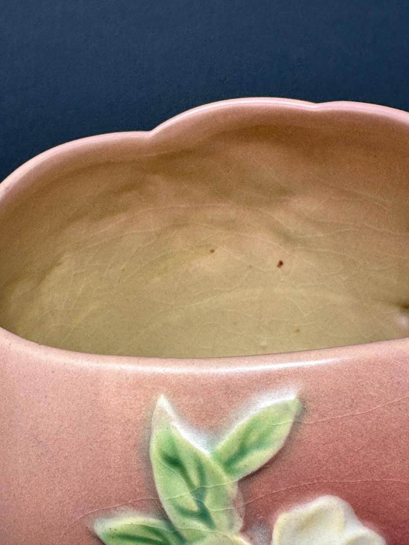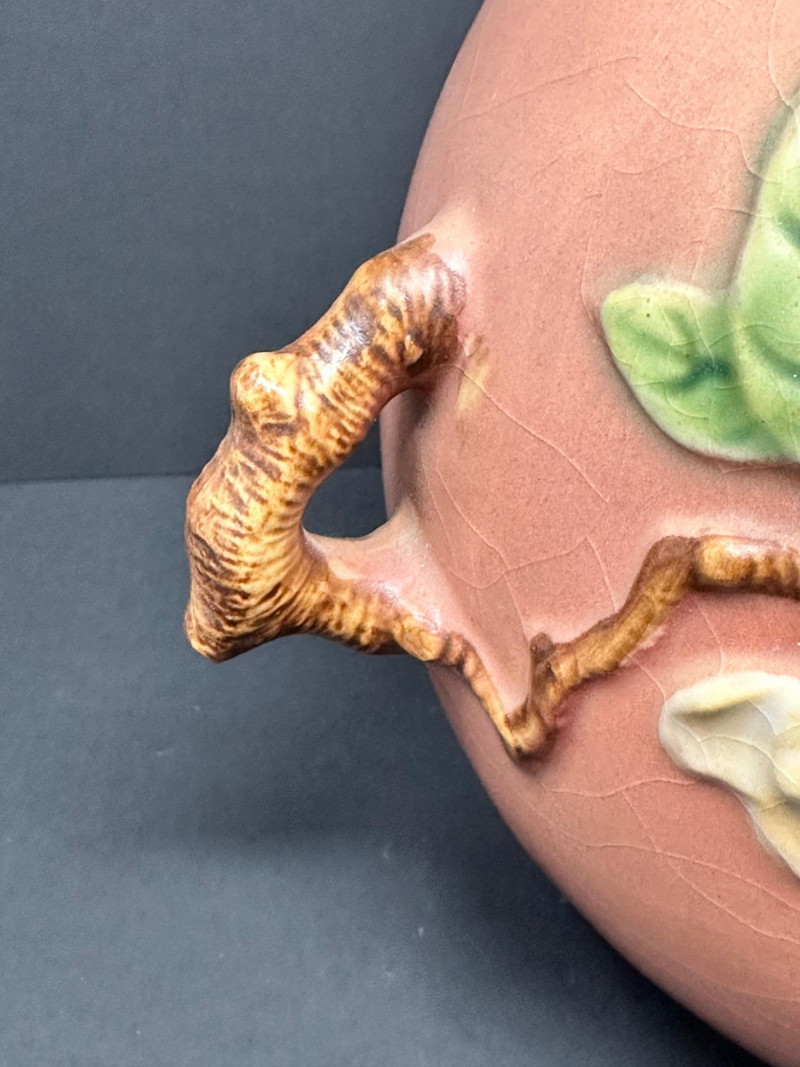 A charming example of Roseville Pottery’s Apple Blossom line, introduced circa 1949. This double-handled vase features a rounded body with sculptural branch-style handles and raised floral decoration. The surface is adorned with soft yellow blossoms and green foliage against a warm reddish-brown background, finished in a glossy glaze with visible age-appropriate crazing. The Apple Blossom pattern is celebrated for its naturalistic motifs and organic forms, reflecting Roseville’s post-war shift toward more sculptural and expressive designs. This piece embodies the line’s rustic elegance and American Art Pottery appeal — ideal for collectors of mid-century ceramics or floral-themed decorative ware.