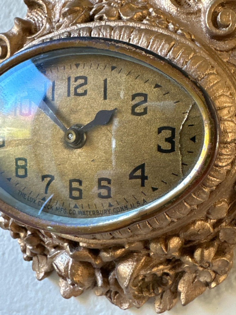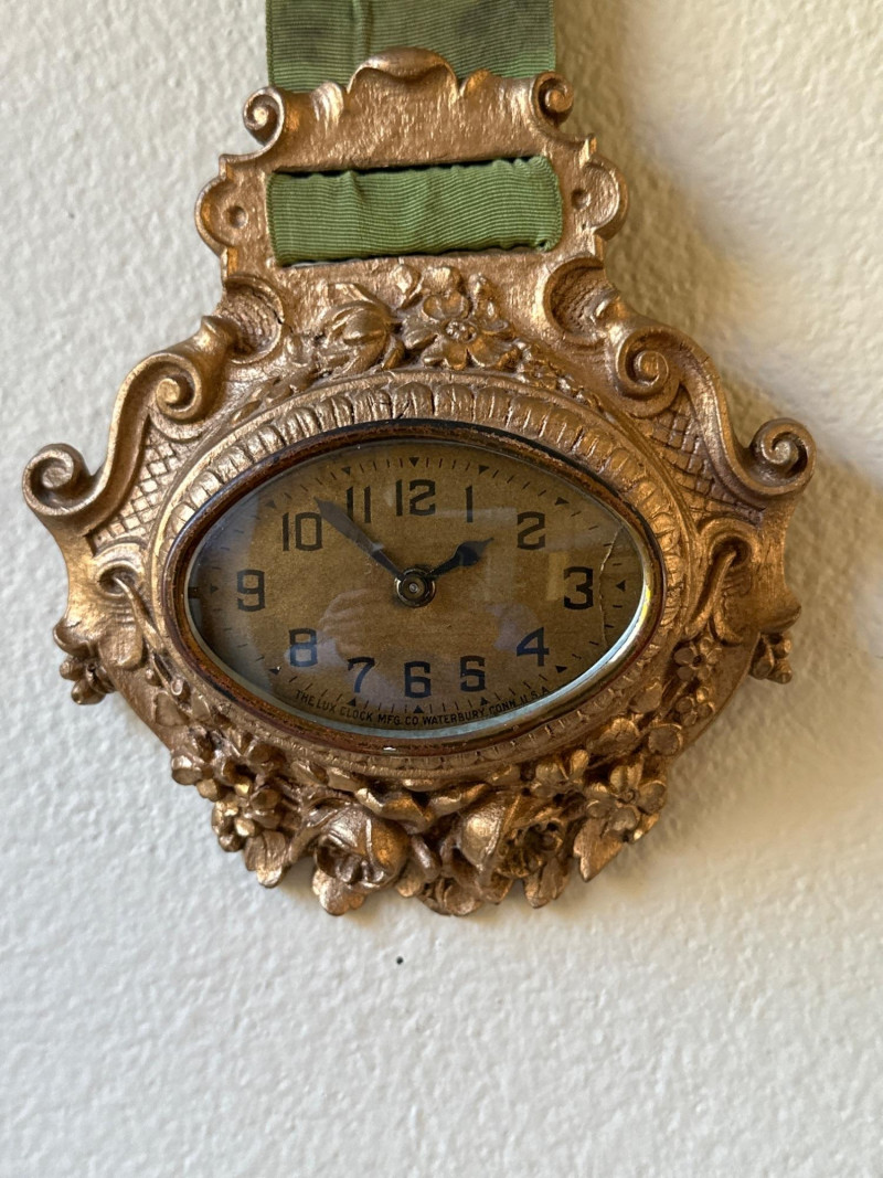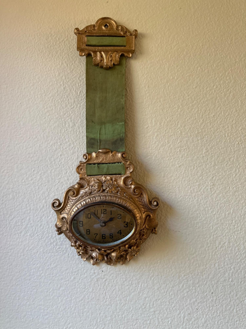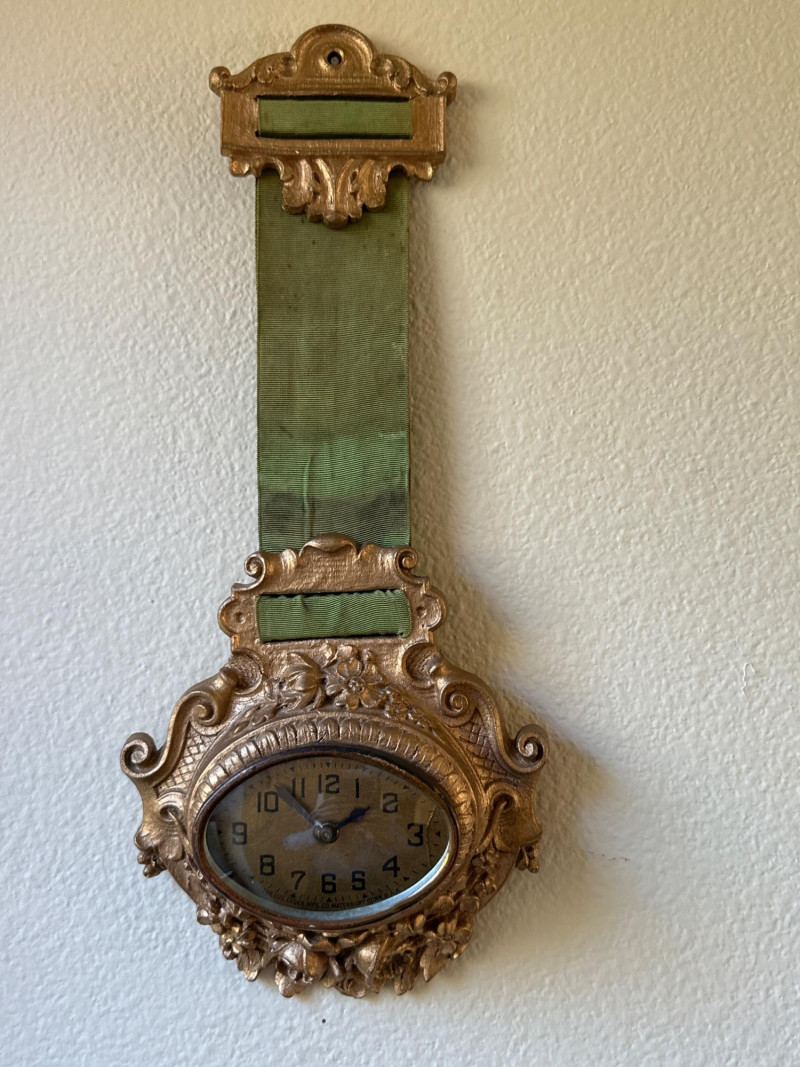 Elegant vintage wall clock by De Luxe Clock and Mfg. Co., crafted in the Louis XVI style. Features an ornate gold-tone frame with floral and scrollwork detailing, set against a green ribbon-like backing. The oval dial displays black Arabic numerals and spade hands, housed within a decorative mount designed for wall display. Measuring approximately 14" L × 6.5" W, this piece blends classical French design with mid-20th-century American craftsmanship, ideal for collectors of decorative timepieces. Has staining on ribbon. The clock face backdrop has some creases.