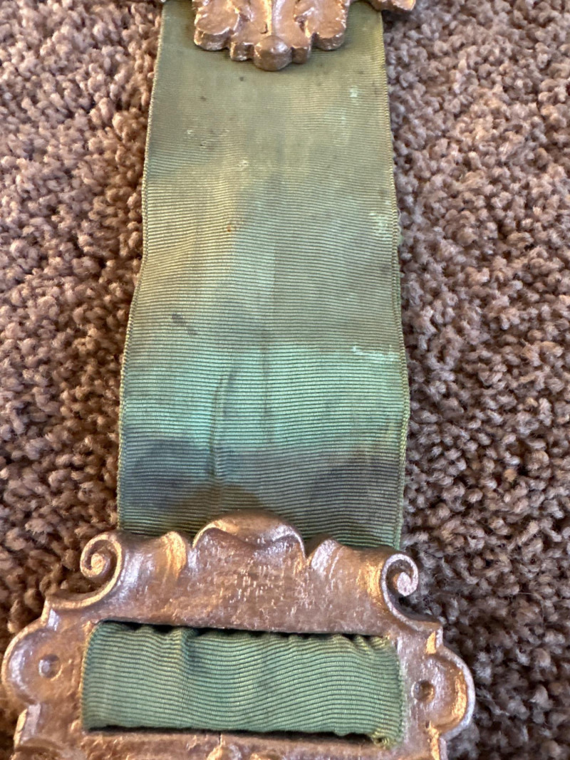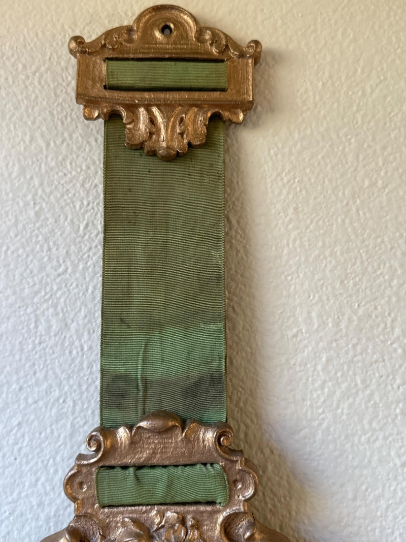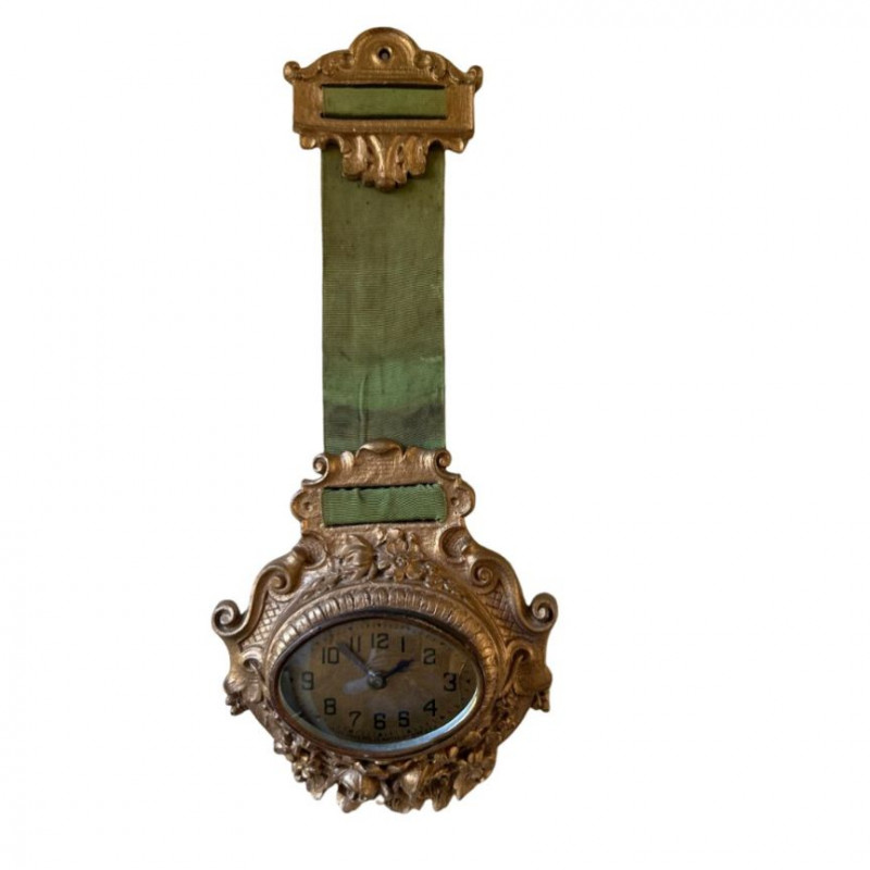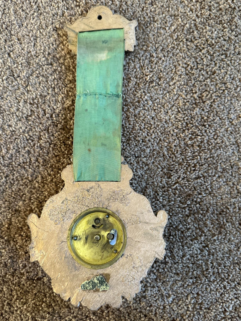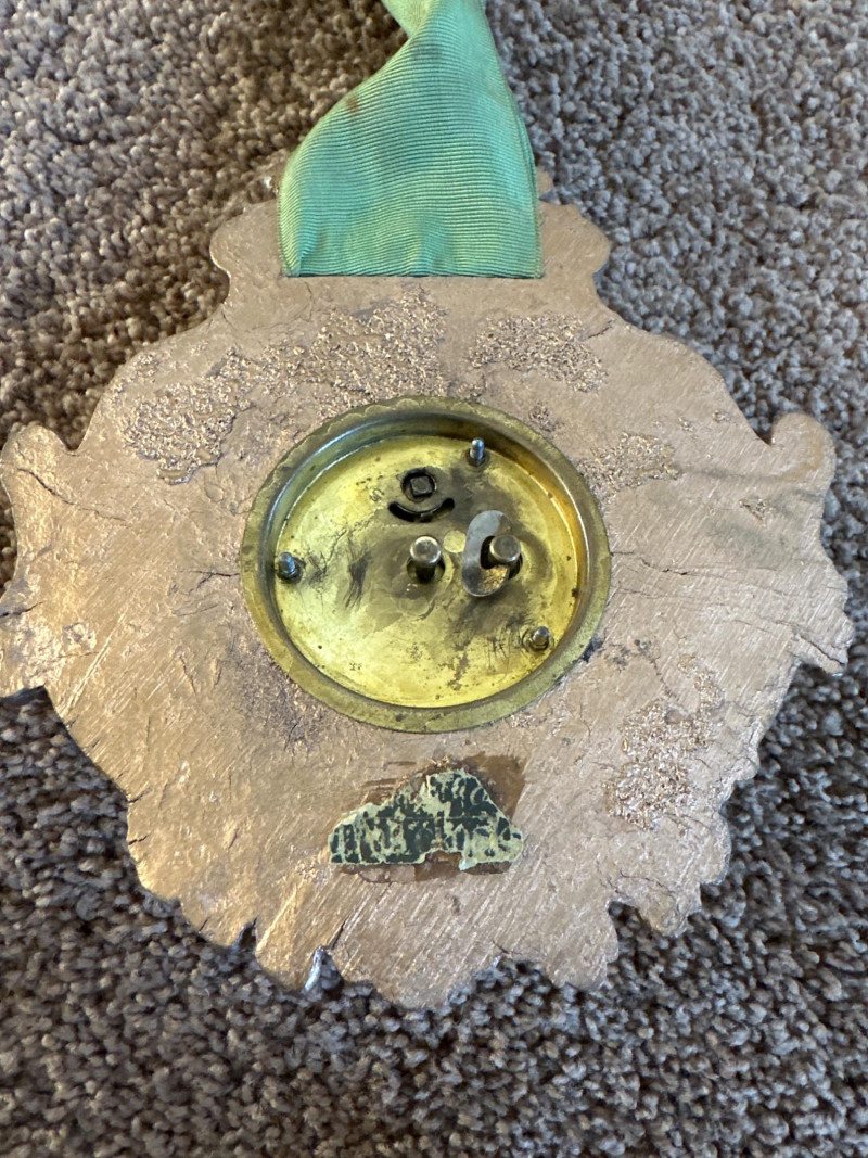 Elegant vintage wall clock by De Luxe Clock and Mfg. Co., crafted in the Louis XVI style. Features an ornate gold-tone frame with floral and scrollwork detailing, set against a green ribbon-like backing. The oval dial displays black Arabic numerals and spade hands, housed within a decorative mount designed for wall display. Measuring approximately 14" L × 6.5" W, this piece blends classical French design with mid-20th-century American craftsmanship, ideal for collectors of decorative timepieces. Has staining on ribbon. The clock face backdrop has some creases.
