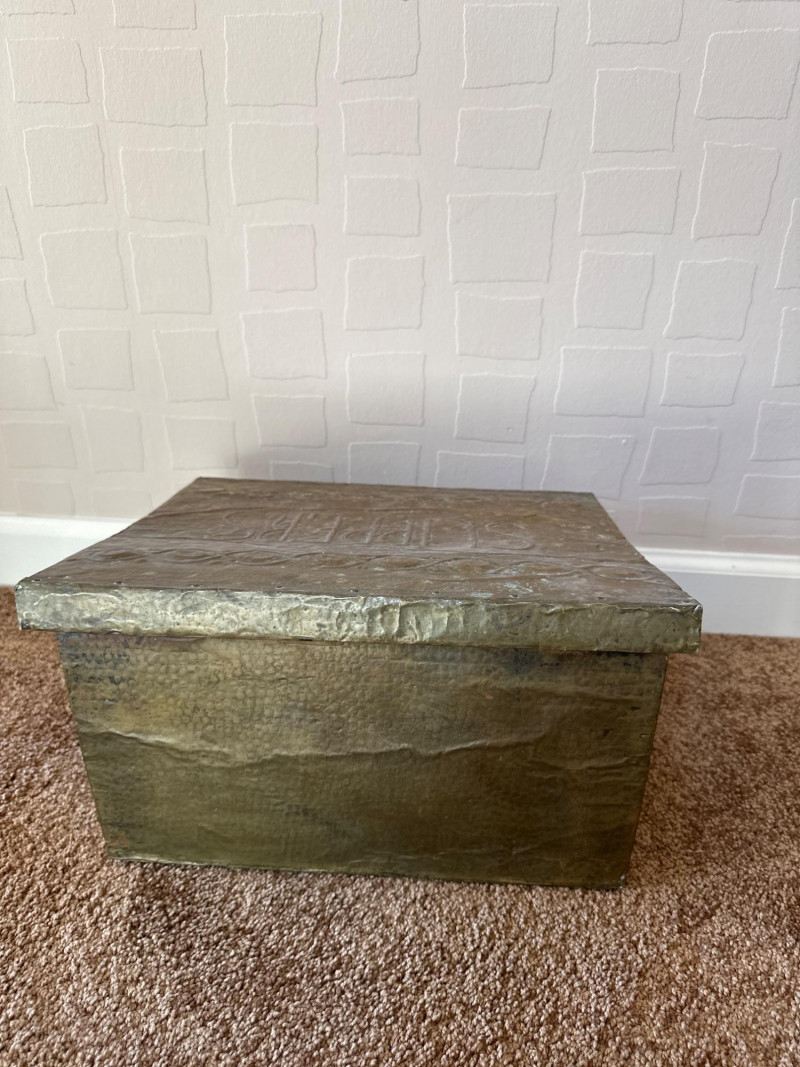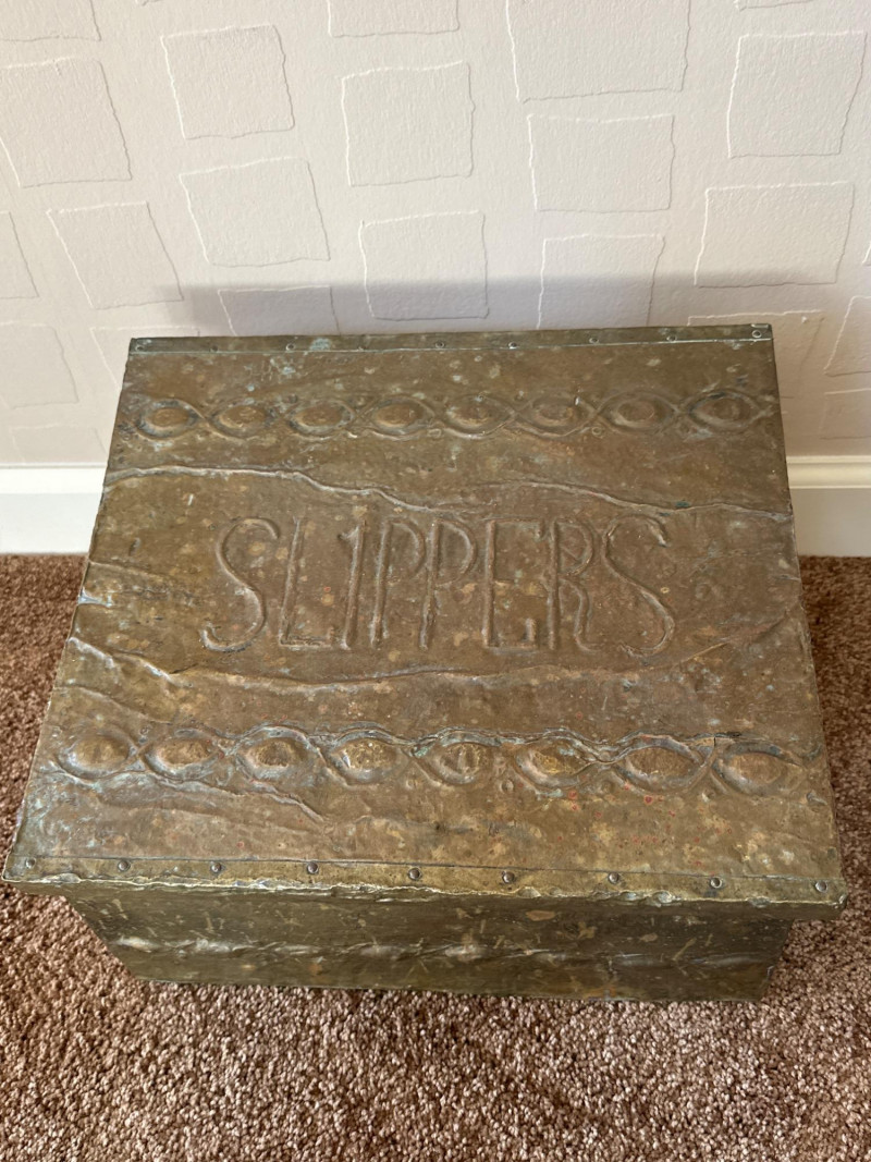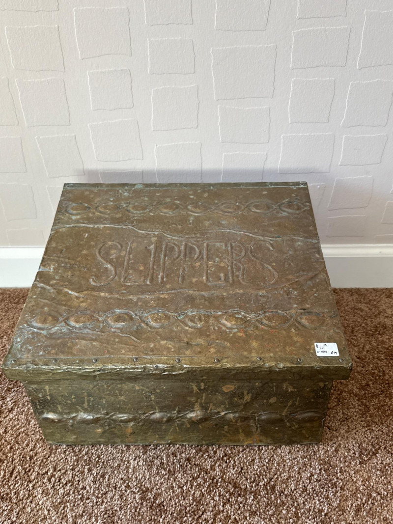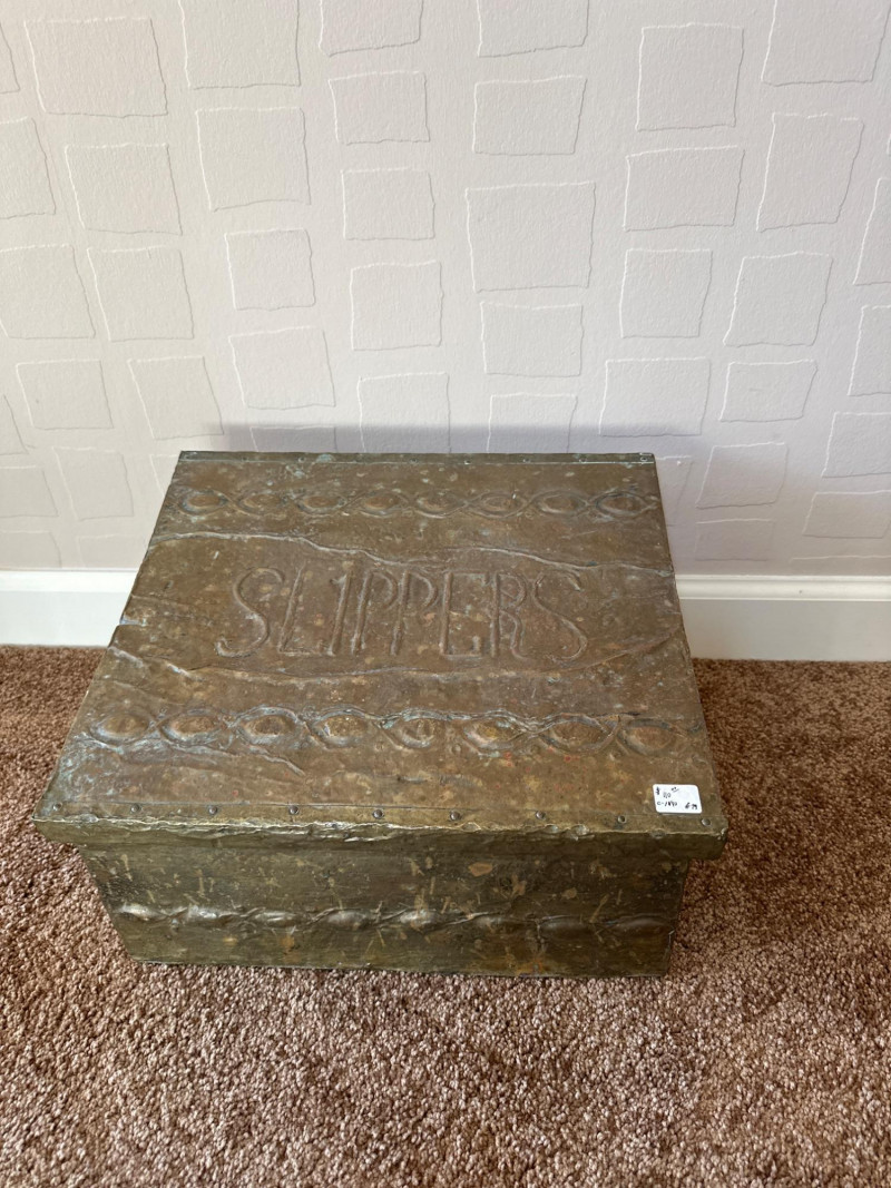 Early 20th-century metal slipper box featuring embossed “SLIPPERS” lettering on the lid and a decorative border motif. Constructed from pressed tin with a hinged top, this piece was designed for tidy storage of house slippers near the entryway. Its utilitarian charm is enhanced by aged patina and period styling, making it a collectible example of domestic metalware from the Edwardian era. Likely British origin.