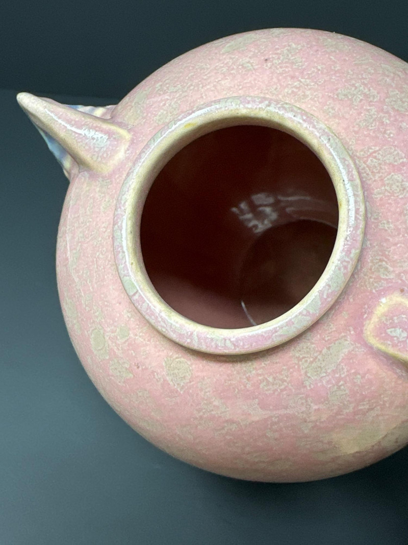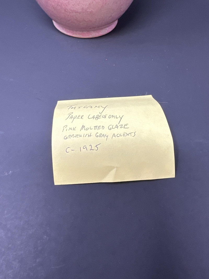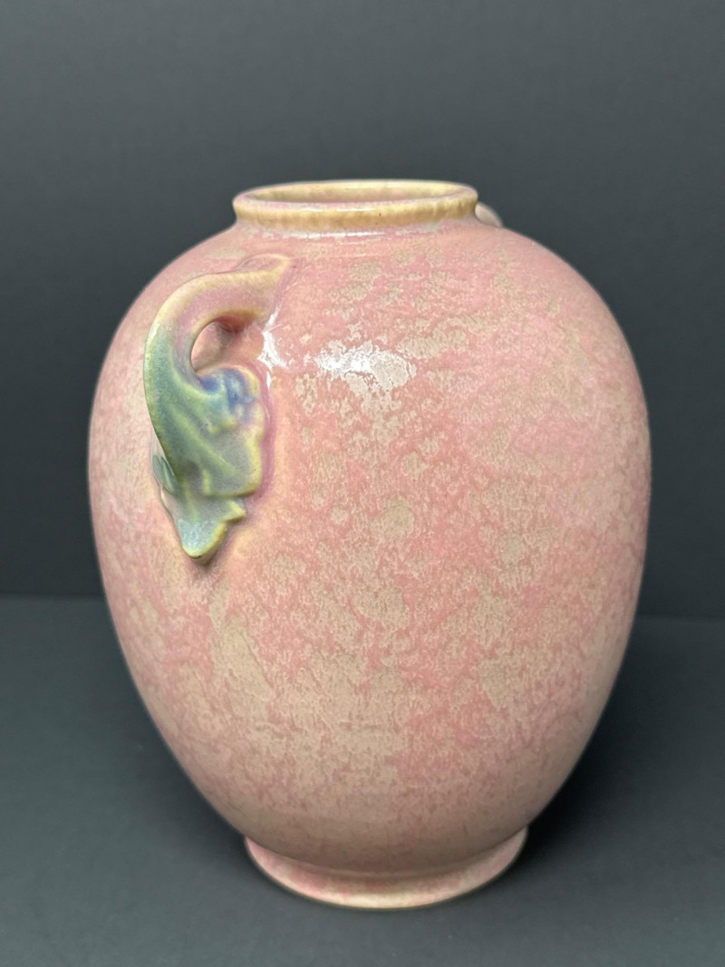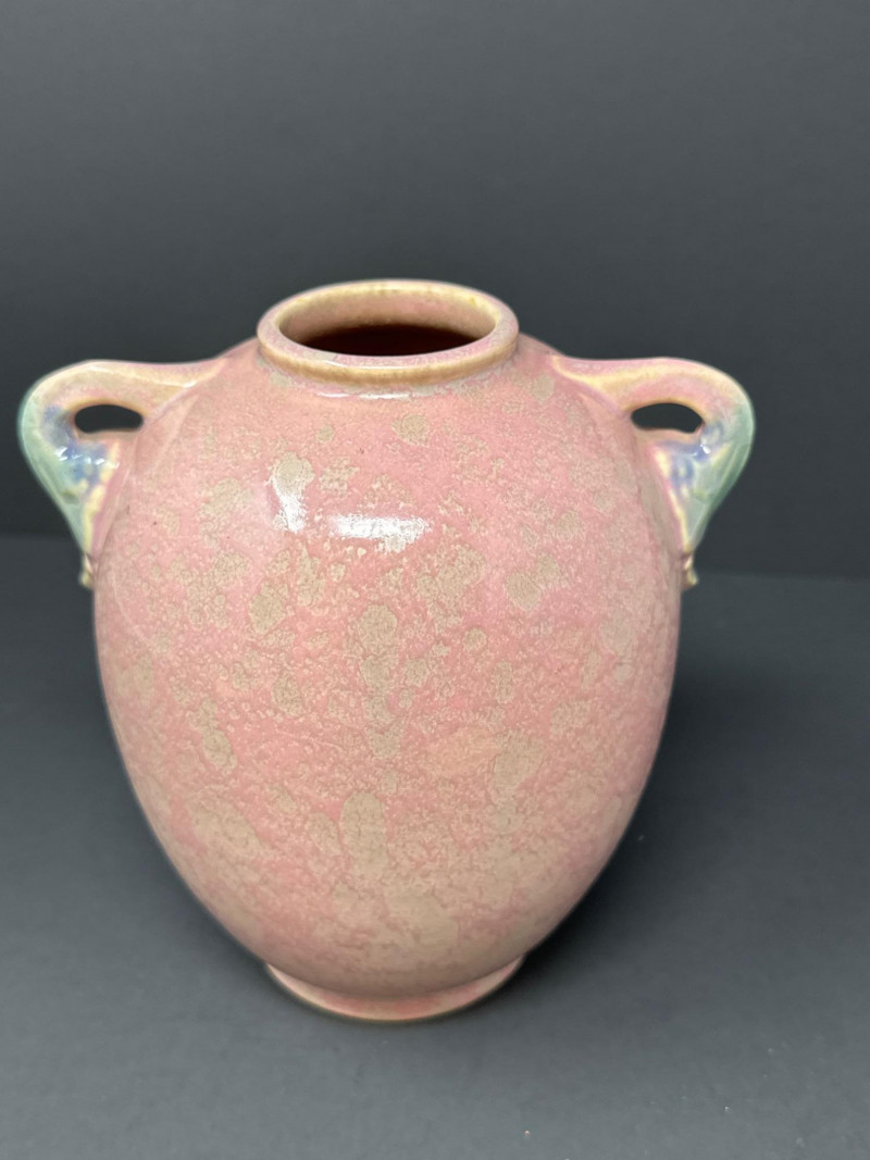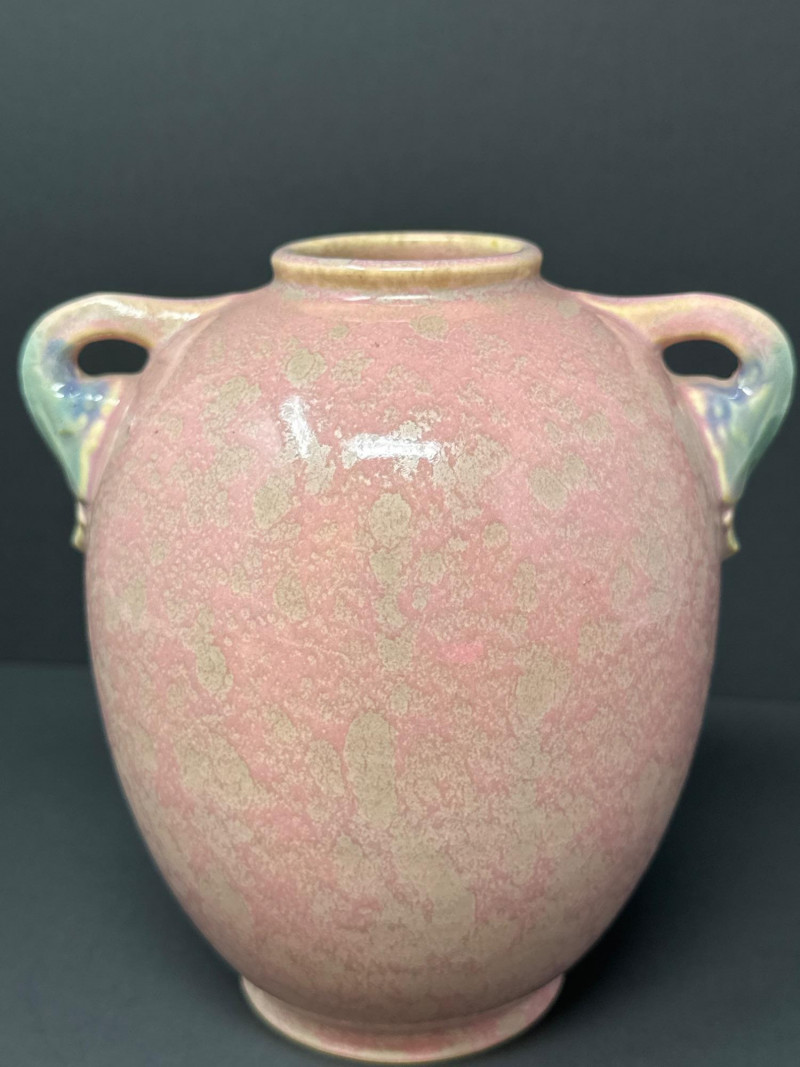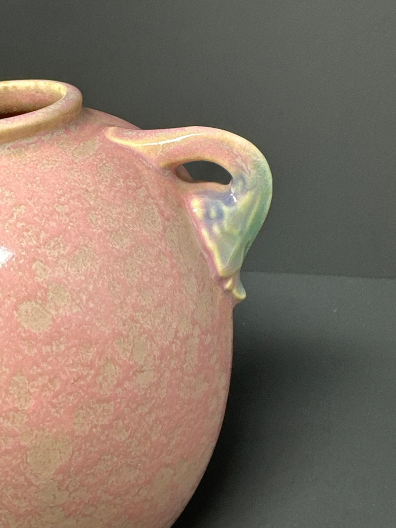 Early Roseville Pottery Tuscany vase featuring a soft pink mottled glaze with subtle greenish gray accents. The two-handled form is balanced and symmetrical, with a gently flared rim and base. Crafted circa 1925, this piece reflects Roseville’s transitional styling between Arts & Crafts and Art Deco influences. The muted palette and organic glaze variation highlight the studio’s mastery of understated elegance in American art pottery.