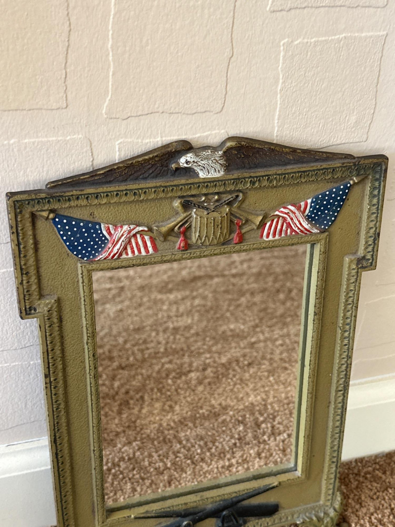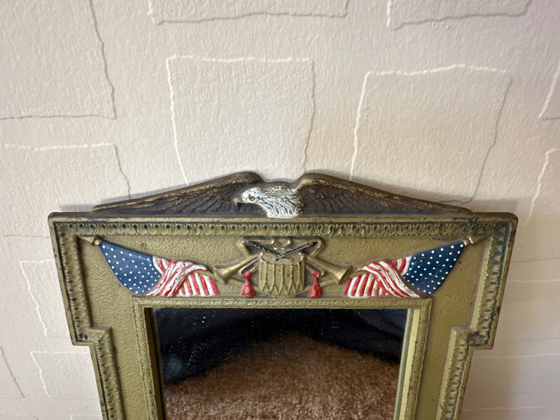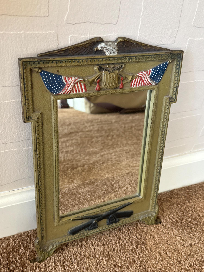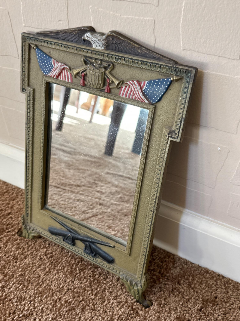 Striking World War I-era cast iron mirror featuring a deeply patriotic motif. The ornate frame showcases a sculpted American bald eagle with wings spread at the crest, flanked by crossed U.S. flags and a central shield with red tassels. At the base, two crossed rifles add a military tribute, reinforcing the wartime symbolism. Finished in a rich bronze or gilt tone, this piece blends commemorative design with functional decor. A rare and evocative artifact of American heritage, ideal for collectors of military memorabilia or early 20th-century patriotic art.