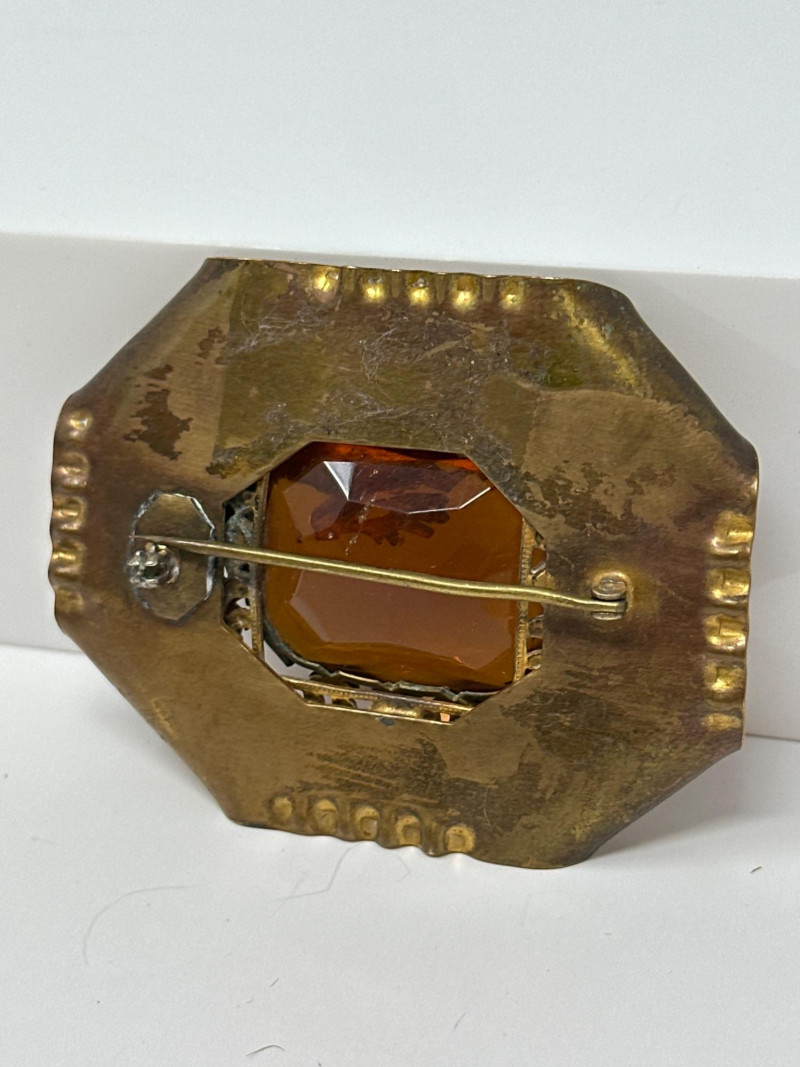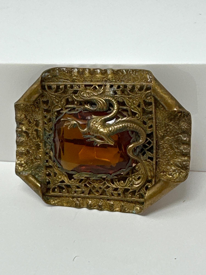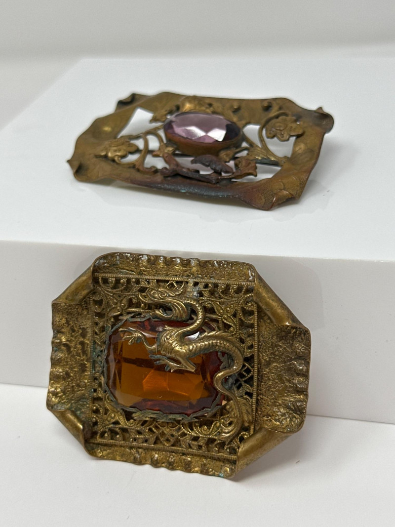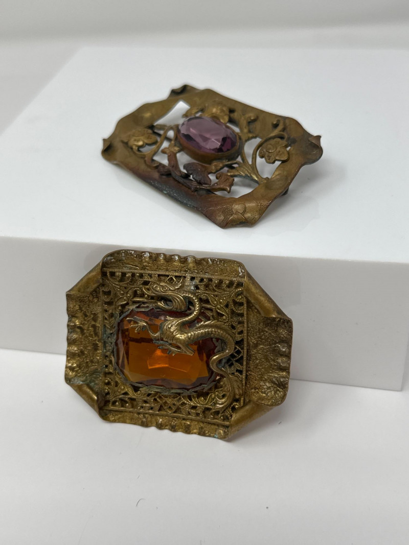 Ornate pair of late Victorian brooches, each showcasing intricate repoussé metalwork and bold central stones. Dragon Brooch: Rectangular with angled corners, featuring a coiled dragon motif wrapped around a large amber-colored faceted glass gem. The frame is detailed with filigree scrollwork and symbolic flourishes.