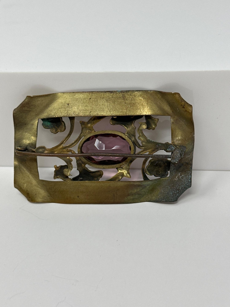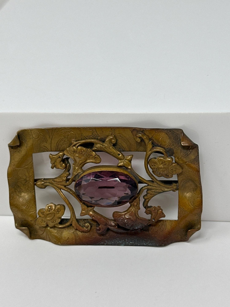 Approx. size: 2.25" x 1.5" Floral Brooch: Irregular rectangular form with raised leaf and blossom motifs surrounding a rich purple faceted stone. The design reflects the Aesthetic Movement’s embrace of nature and asymmetry.