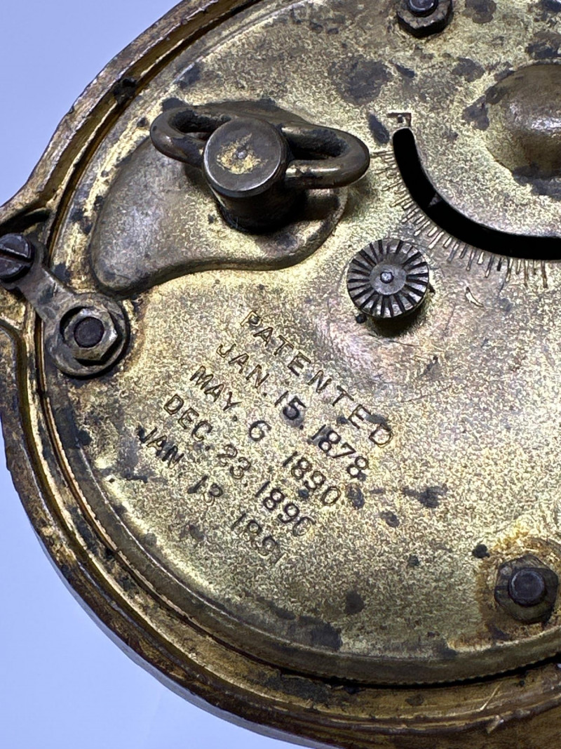 Elegant early 20th-century Waterbury mantel clock in French Rococo revival style, featuring a gilt-painted case with ornate leaf scrollwork and sculptural cherubs supporting the clock face. The circular dial displays black Arabic numerals and decorative floral detailing at center. Crafted with cast metal and finished in antique gold, this piece reflects Waterbury’s blend of American clockmaking precision and European-inspired artistry.