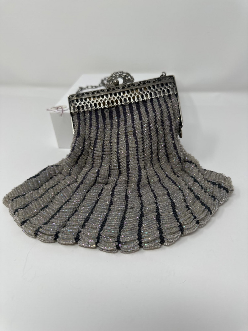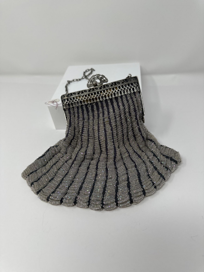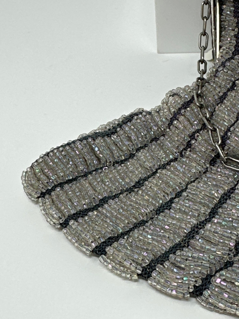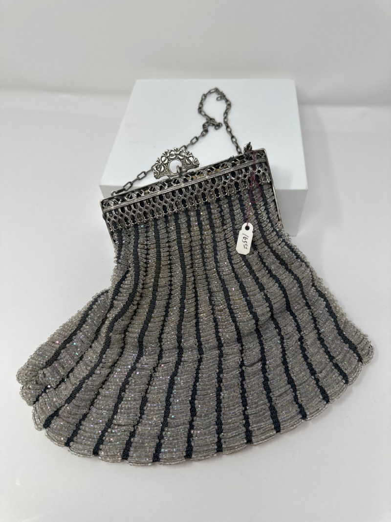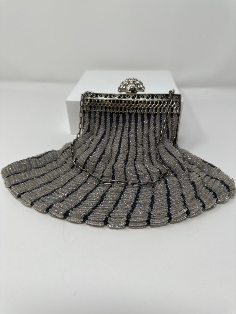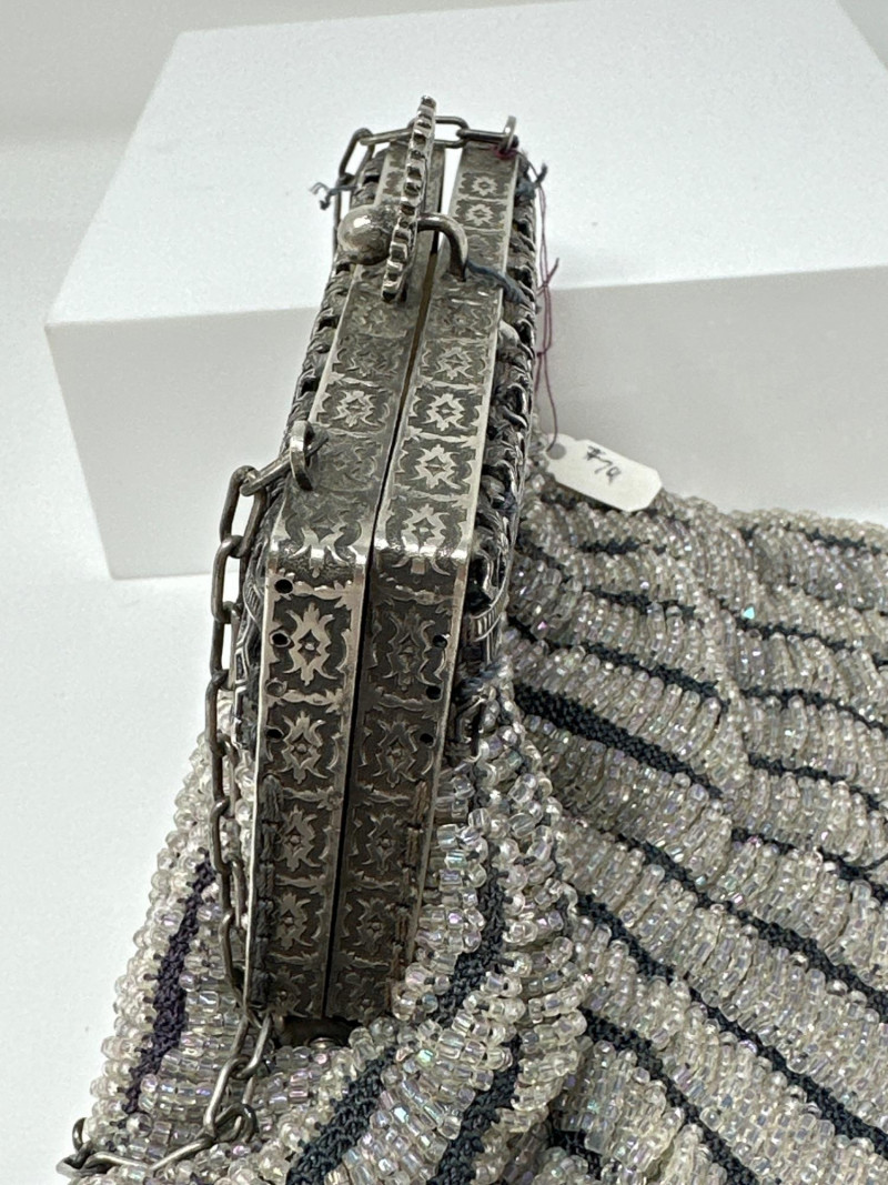 Elegant 1920s beaded evening purse featuring vertical stripes of shimmering silver and charcoal glass beads. The metallic frame is adorned with intricate floral repoussé detailing and a decorative clasp, complemented by a delicate chain handle. Lined interior with soft fabric, typical of flapper-era accessories. This piece reflects the Art Deco fascination with geometric contrast and ornate craftsmanship, making it a standout in vintage fashion collections. Approximate Measurements for the Era: Width: 5.5"–6" Height (excluding chain): 6"–7" Chain Drop: 5"–6"