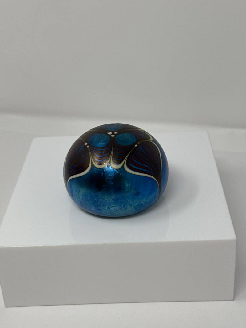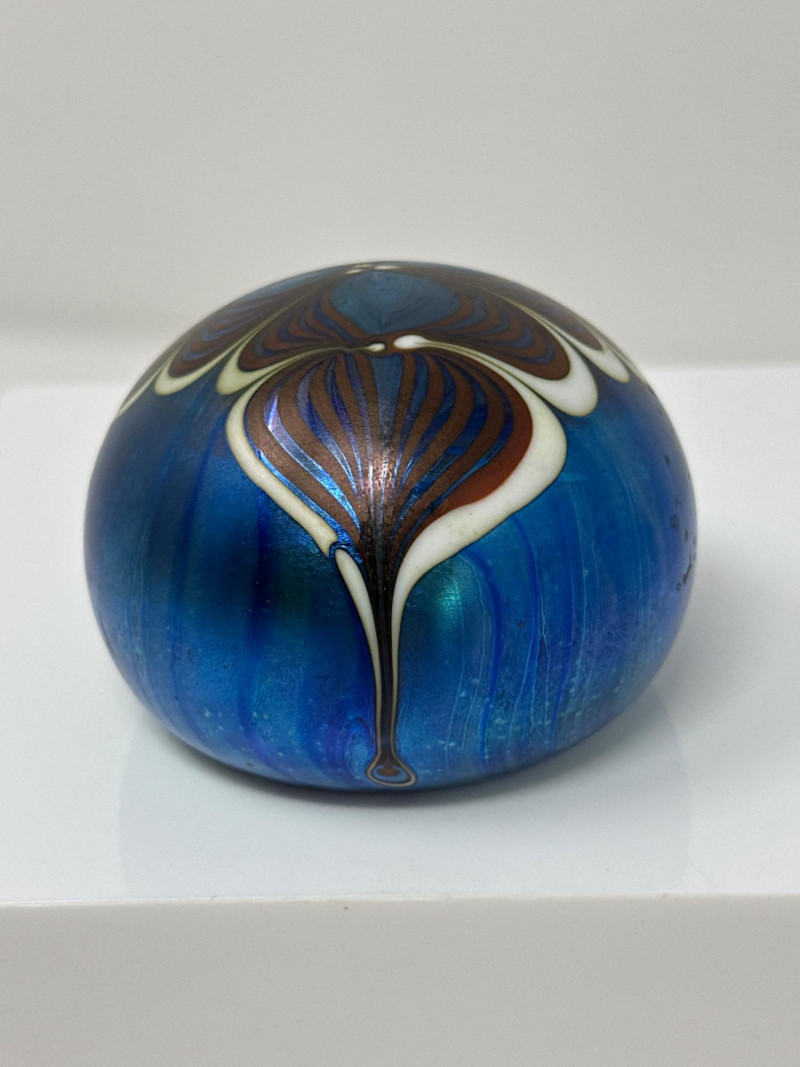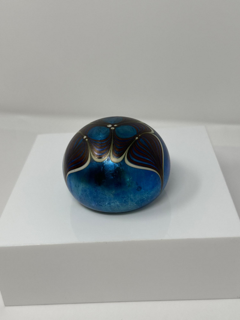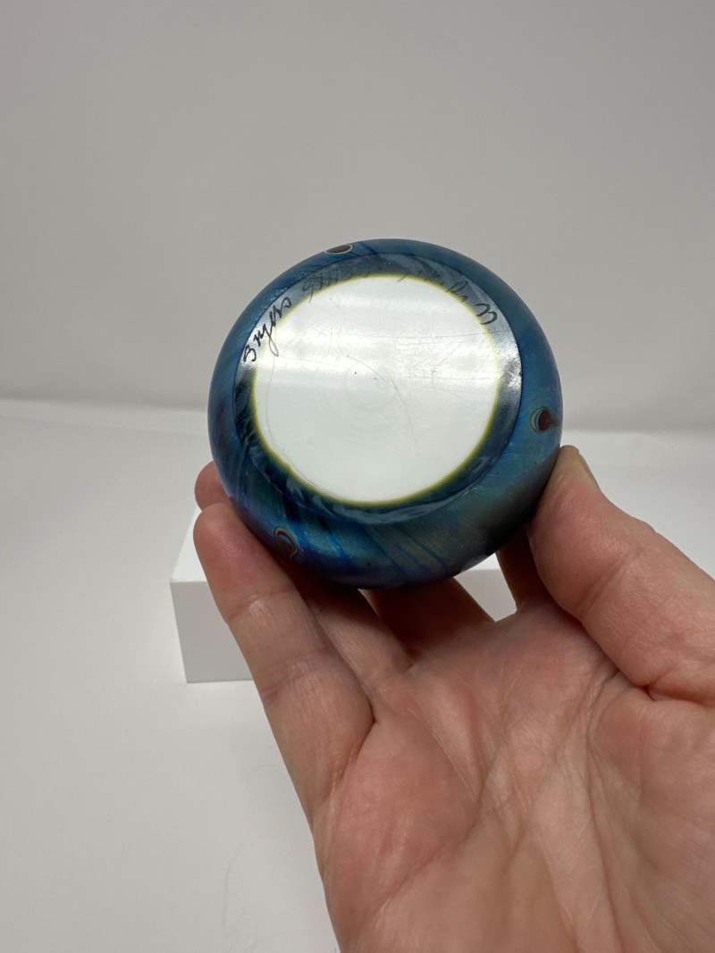 Lot # 72 - Steven Smyers Art Glass Paperweight – Iridescent Blue W/Feather Cane