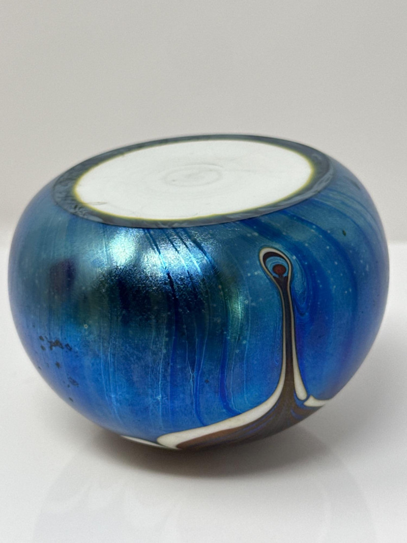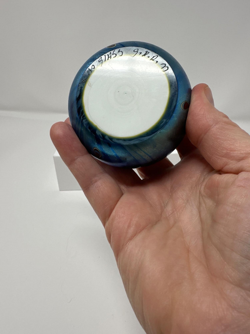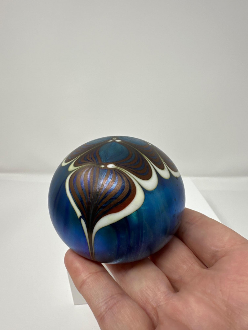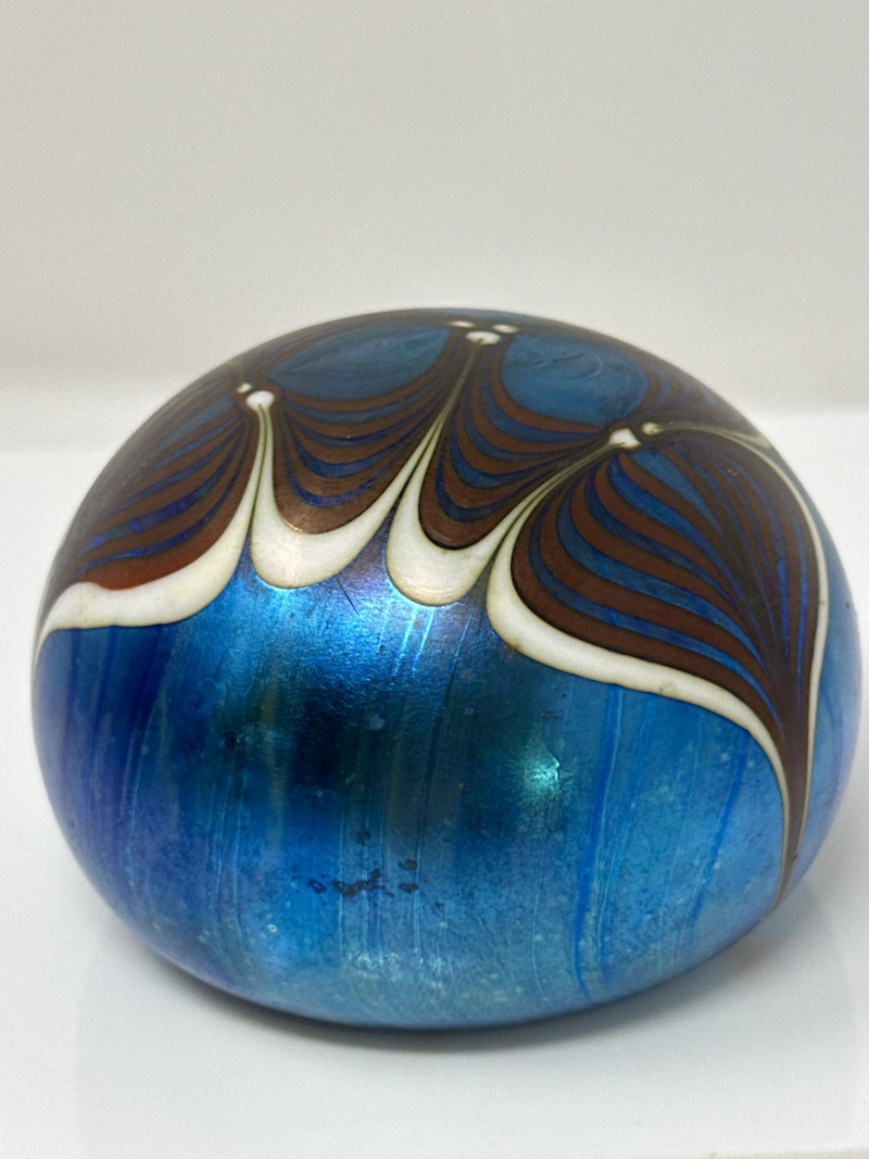 Lot # 72 - Steven Smyers Art Glass Paperweight – Iridescent Blue W/Feather Cane