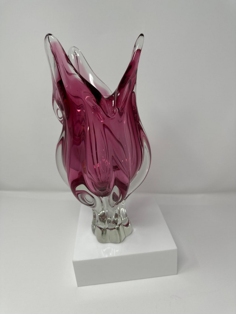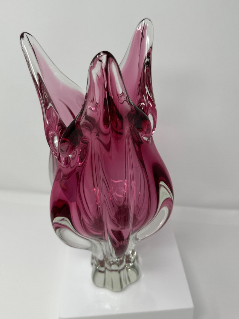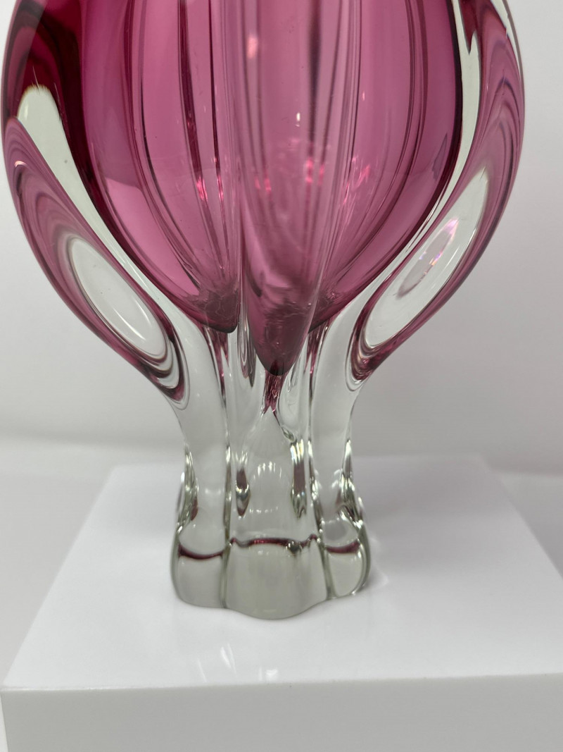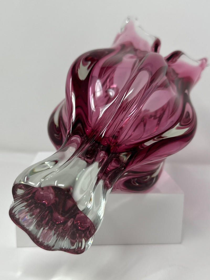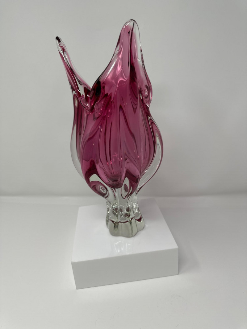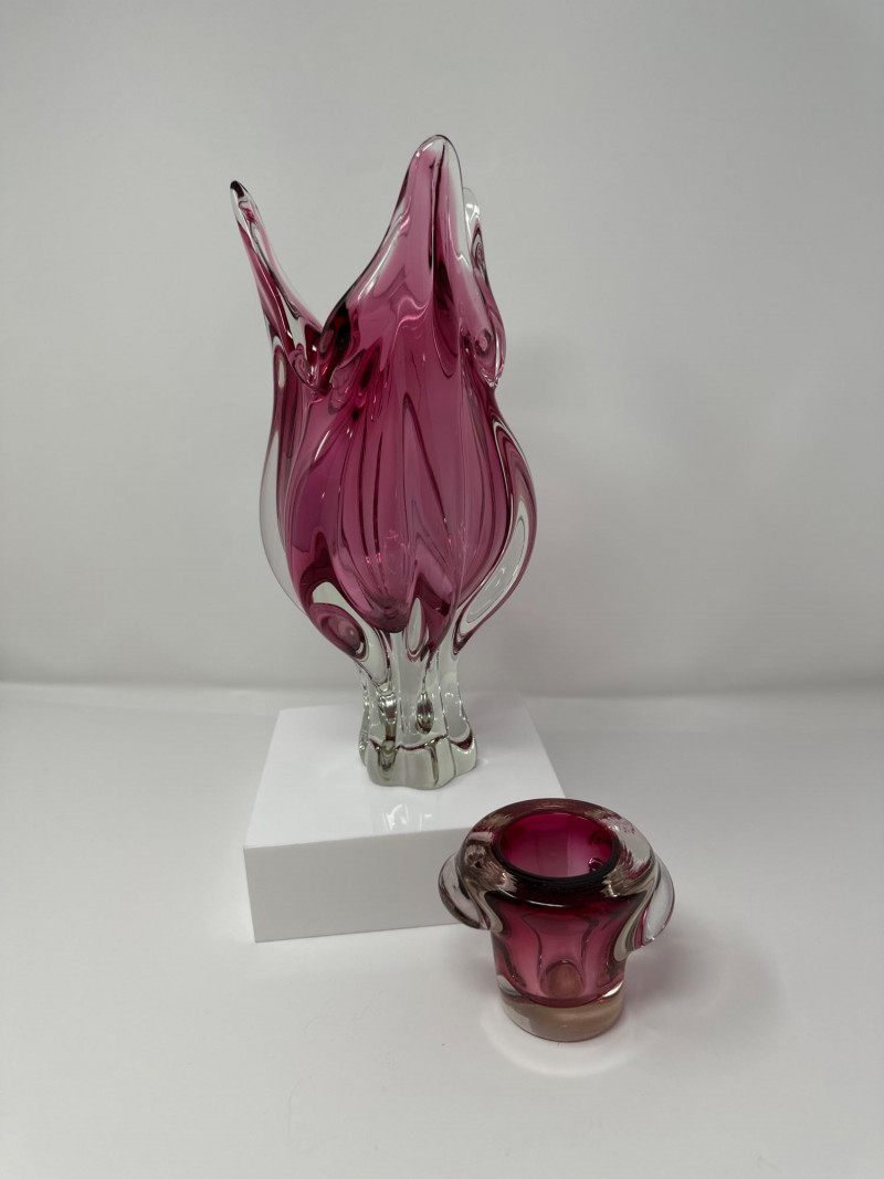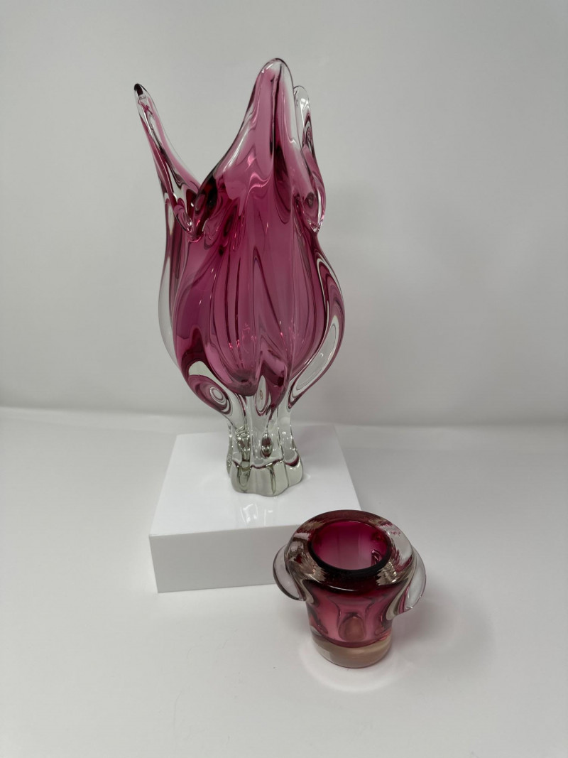 Elegant pair of Murano hand-blown glass pieces in vibrant pink with clear glass accents, showcasing the fluid artistry of mid-century Italian design. Vase: Sculptural freeform vase with flowing organic curves and rich pink coloration. Clear glass ribbons swirl around the body, enhancing its dimensionality and light play. A striking centerpiece with classic Murano flair. 11.5 T x 4 W