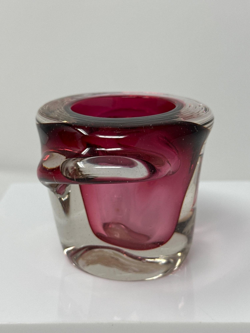 Toothpick Holder: Petite companion piece with rounded form and matching pink-and-clear palette. Likely intended as a toothpick holder or small bud vase, echoing the vase’s color and style in miniature. 3 x 3