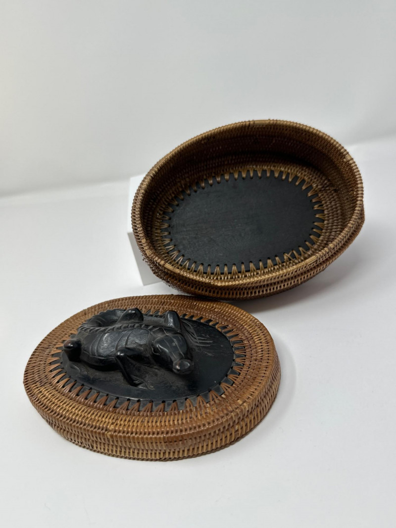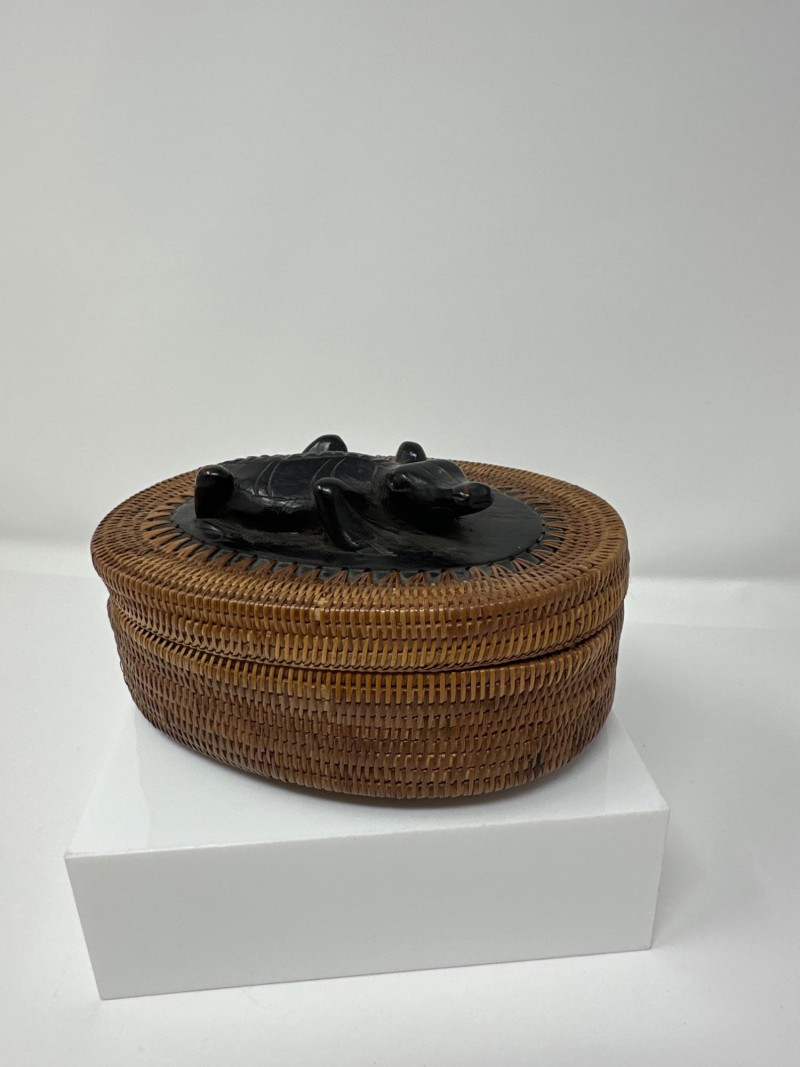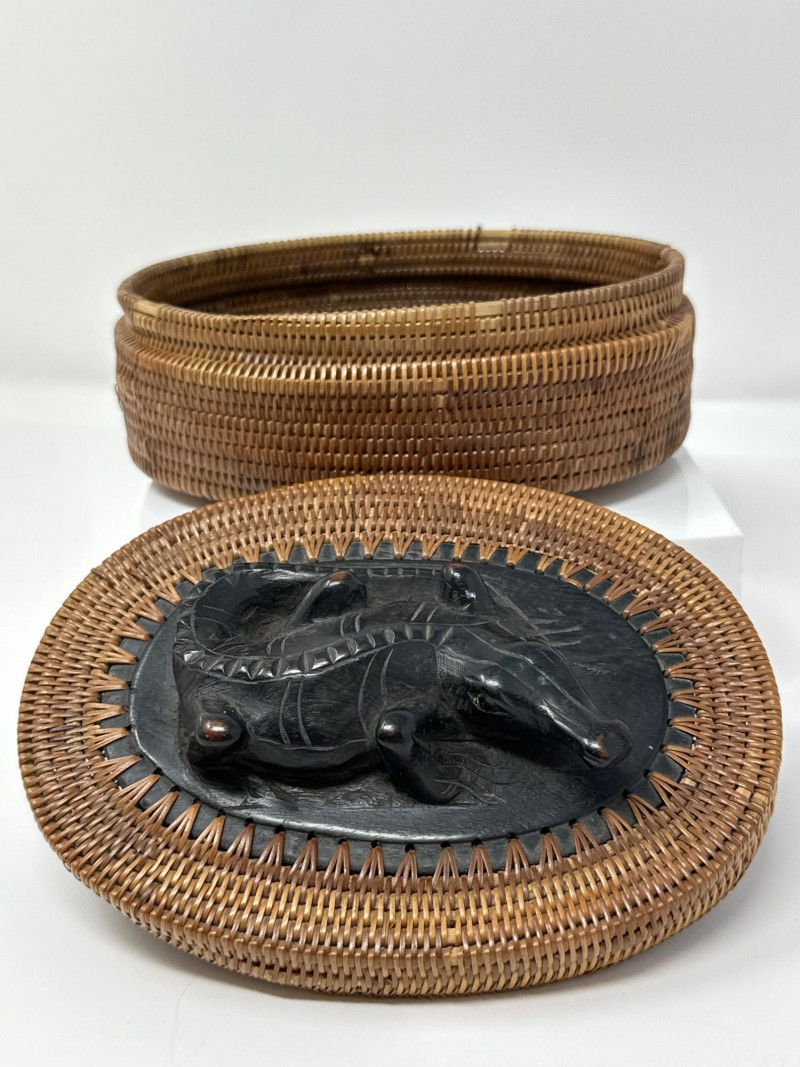 Lot # 75 - African Hand-Woven Reed Basket with Carved Wood Alligator Lid