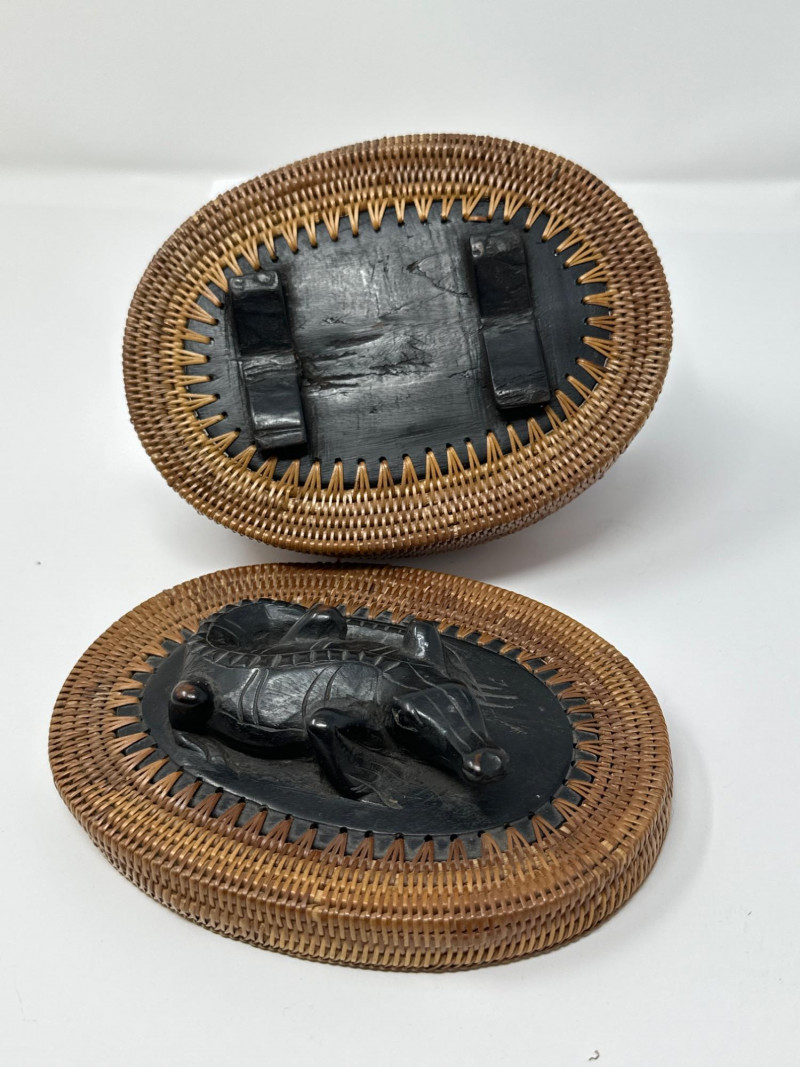 Striking hand-woven oval reed basket featuring a sculptural black wood lid with a raised alligator carving and a carved footing beneath the base. The basket’s natural reed body showcases traditional coiling and weaving techniques, while the lid and base reflect regional woodcarving artistry. Likely crafted in West or Central Africa, this piece blends utilitarian form with symbolic animal motifs, often associated with protection and strength in tribal lore. A compelling example of functional folk art with cultural resonance.