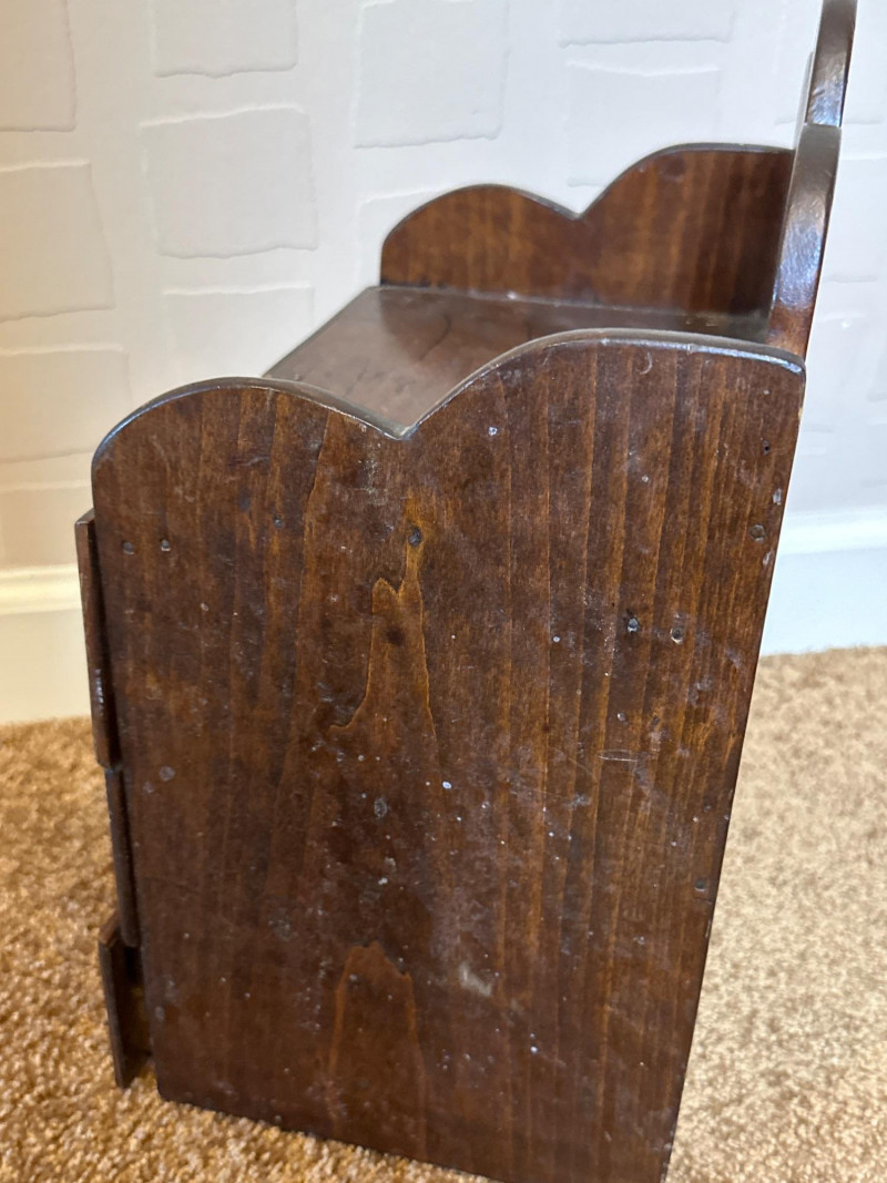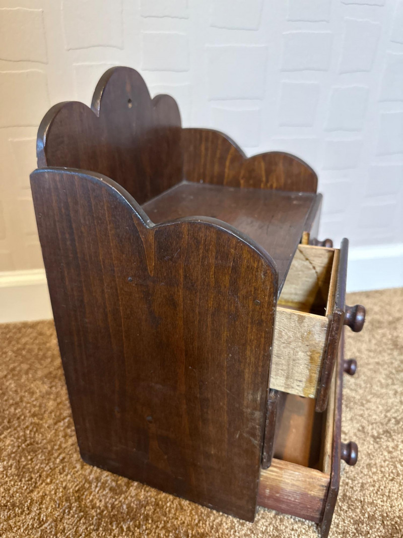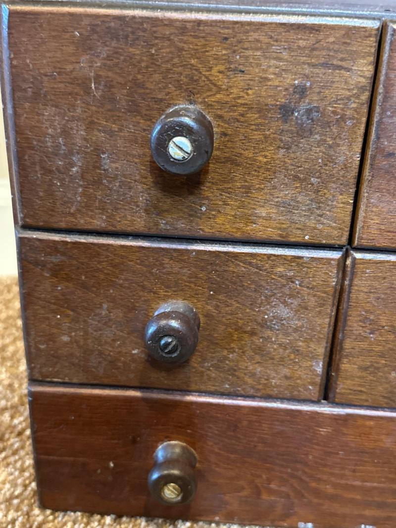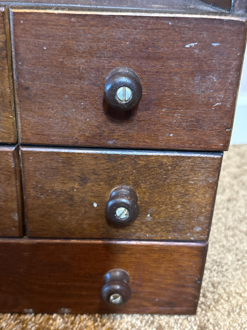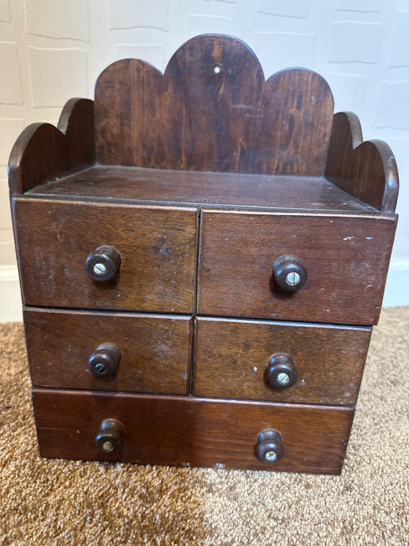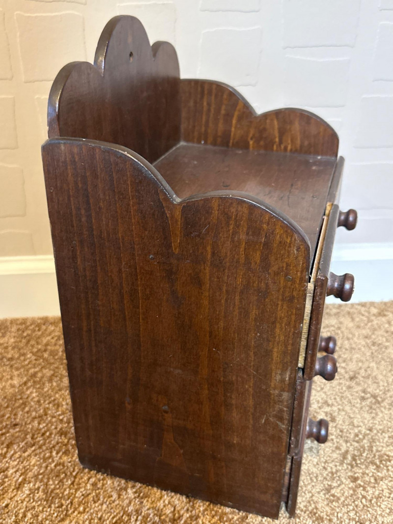 Charming antique miniature dresser chest featuring six drawers arranged in three rows, each fitted with round wooden knobs. Crafted from dark-stained wood with visible age wear and patina, the piece includes a decorative scalloped backboard and raised side panels, adding a handcrafted folk-art appeal. Likely dating to the early 1900s, this petite chest was used for storing jewelry, sewing notions, or keepsakes, and reflects traditional American cottage or primitive style.
