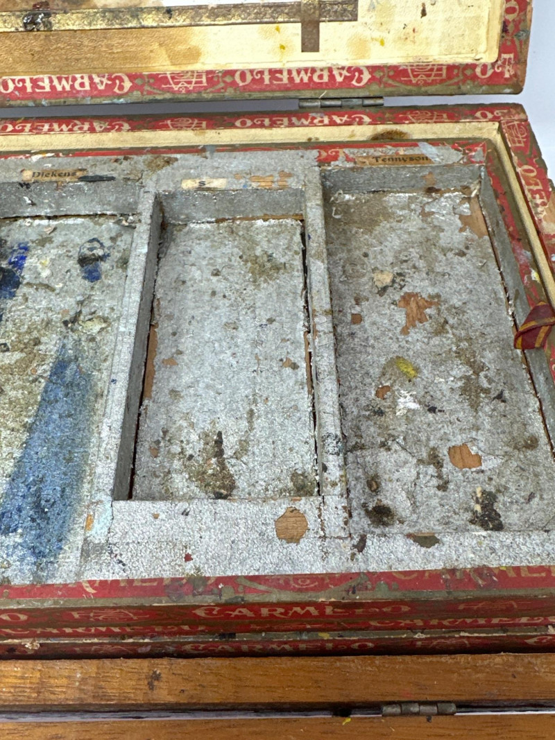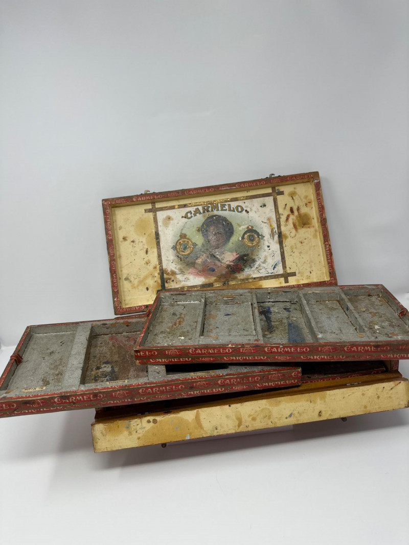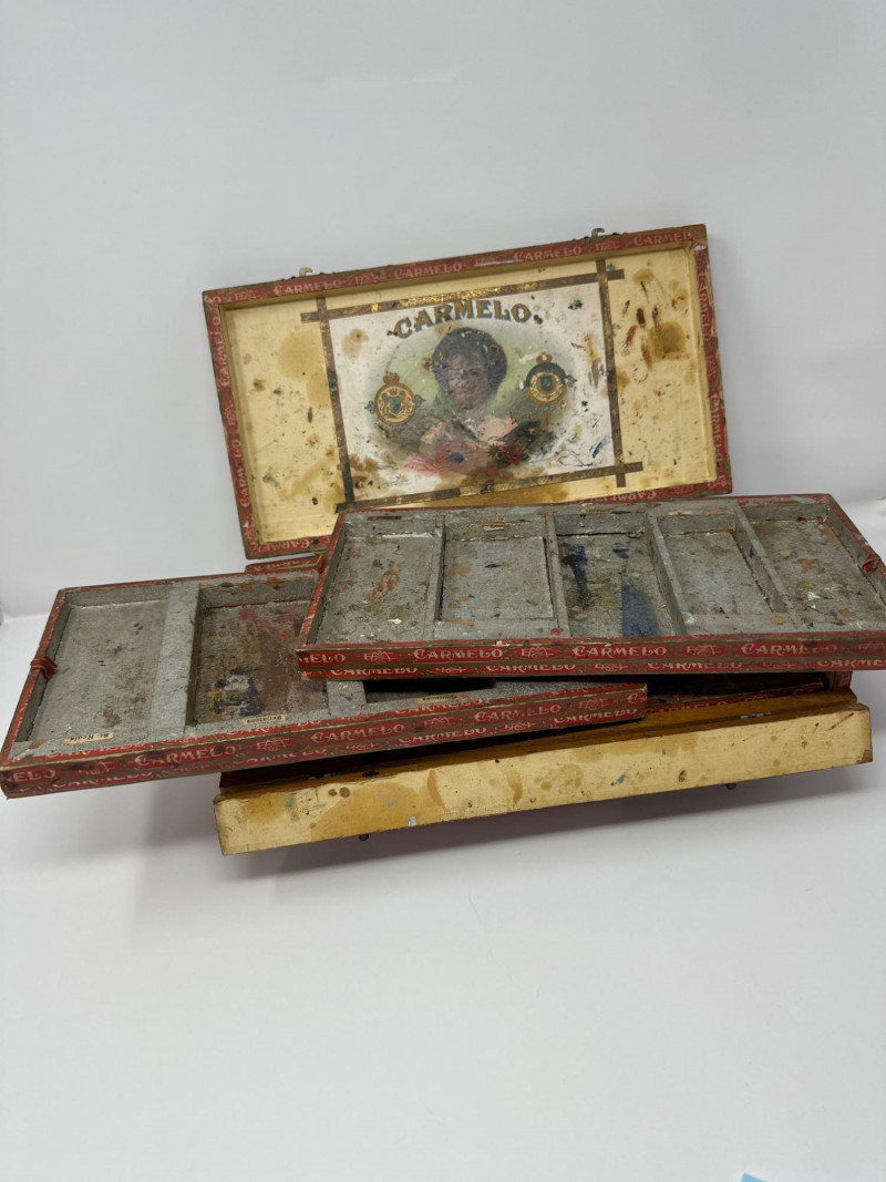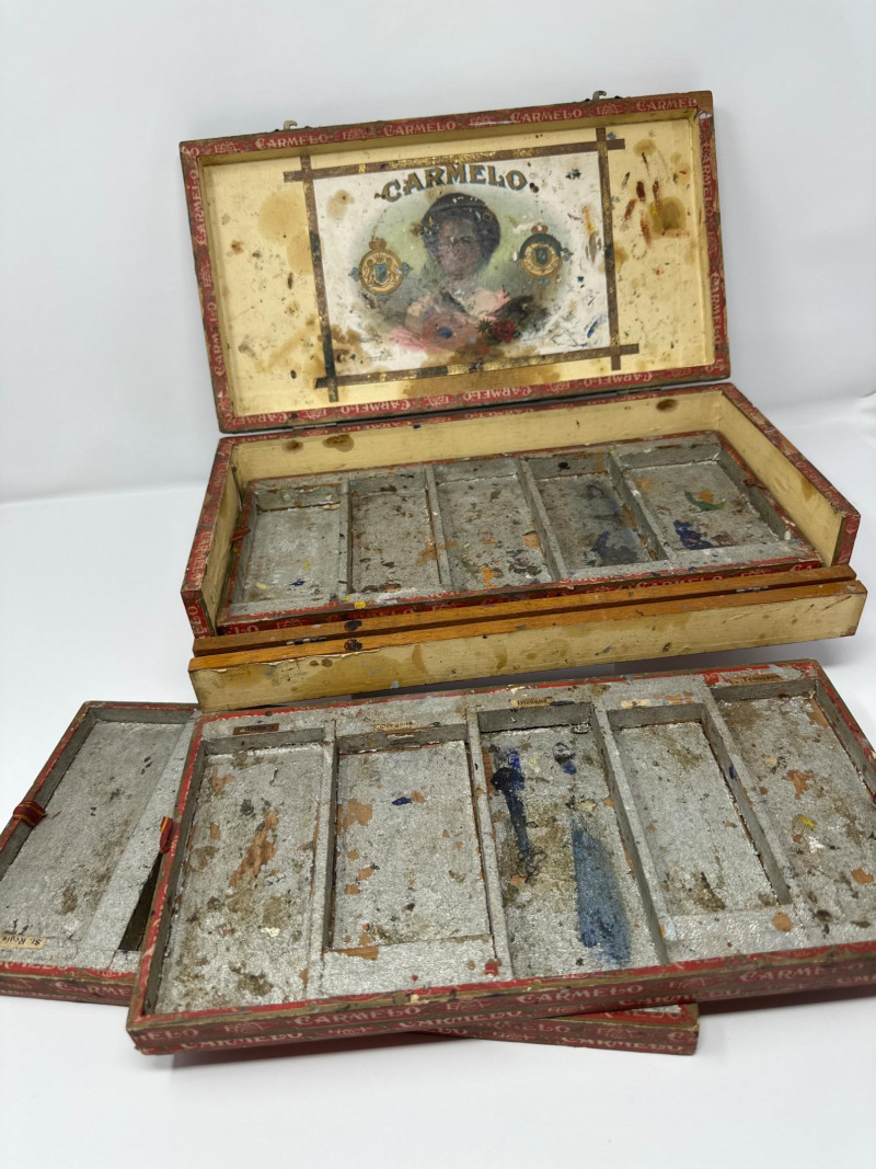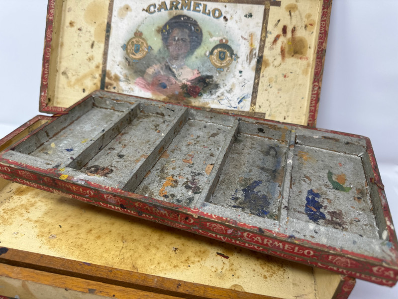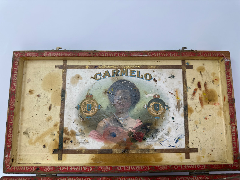 Vintage Carmelo wood cigar box repurposed as an artist’s paint case, featuring three removable wooden insert trays. The lid displays vibrant lithographed branding with a central figure playing guitar, flanked by circular emblems and bordered by repeating “CARMELO” logos. The interior trays are compartmentalized and show signs of pigment use, suggesting a second life as a painter’s mixing and storage box. A rare crossover artifact blending early 20th-century cigar merchandising with folk art utility. Length: 11"–12" Width: 7"–8" Height (with trays inside): 3.5"–4"