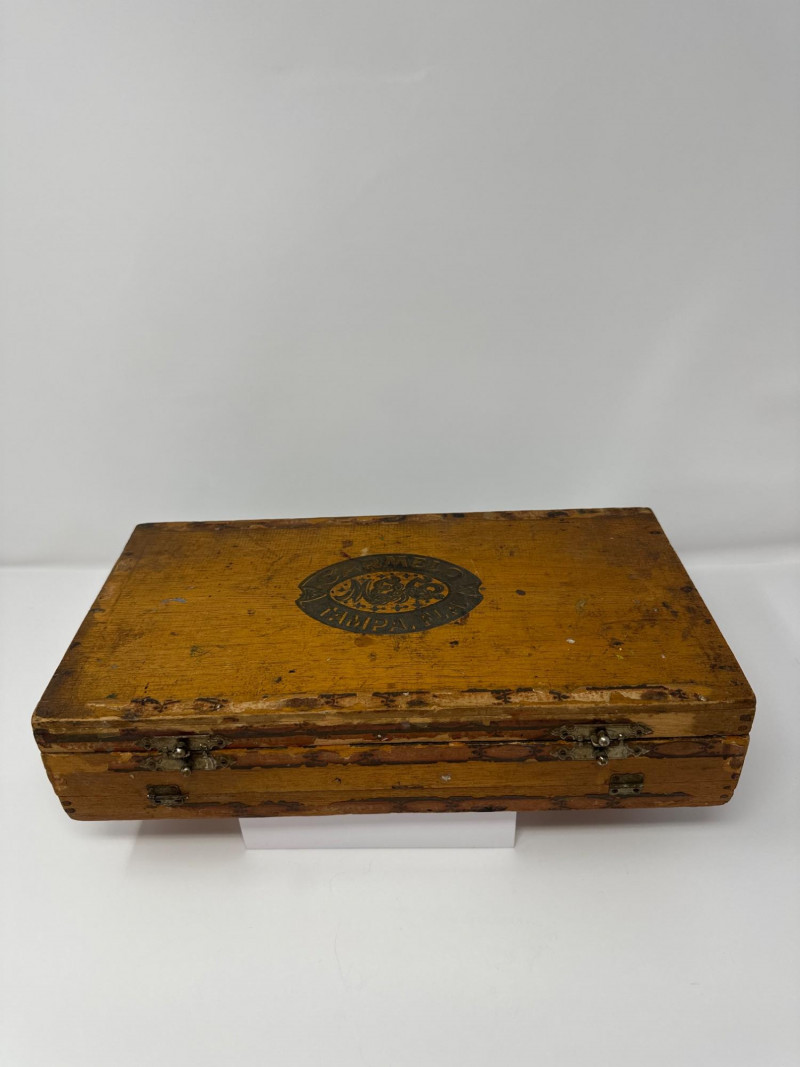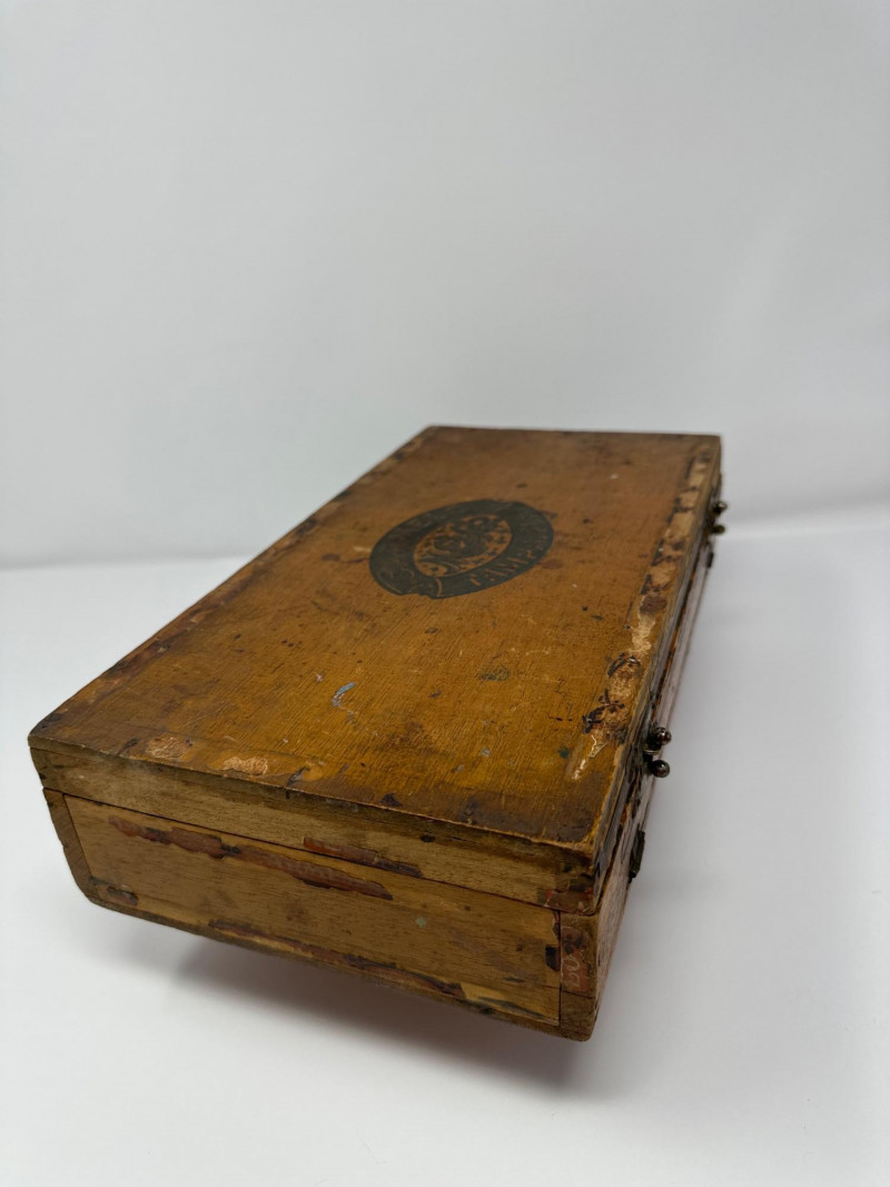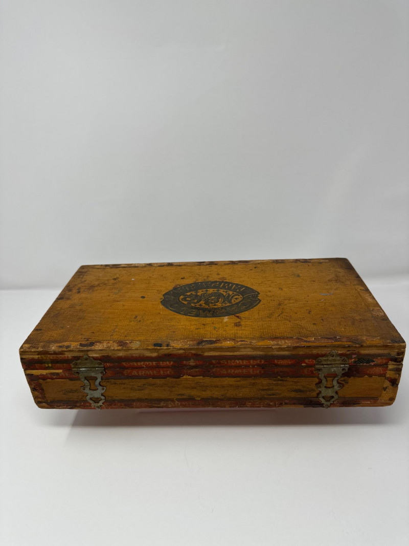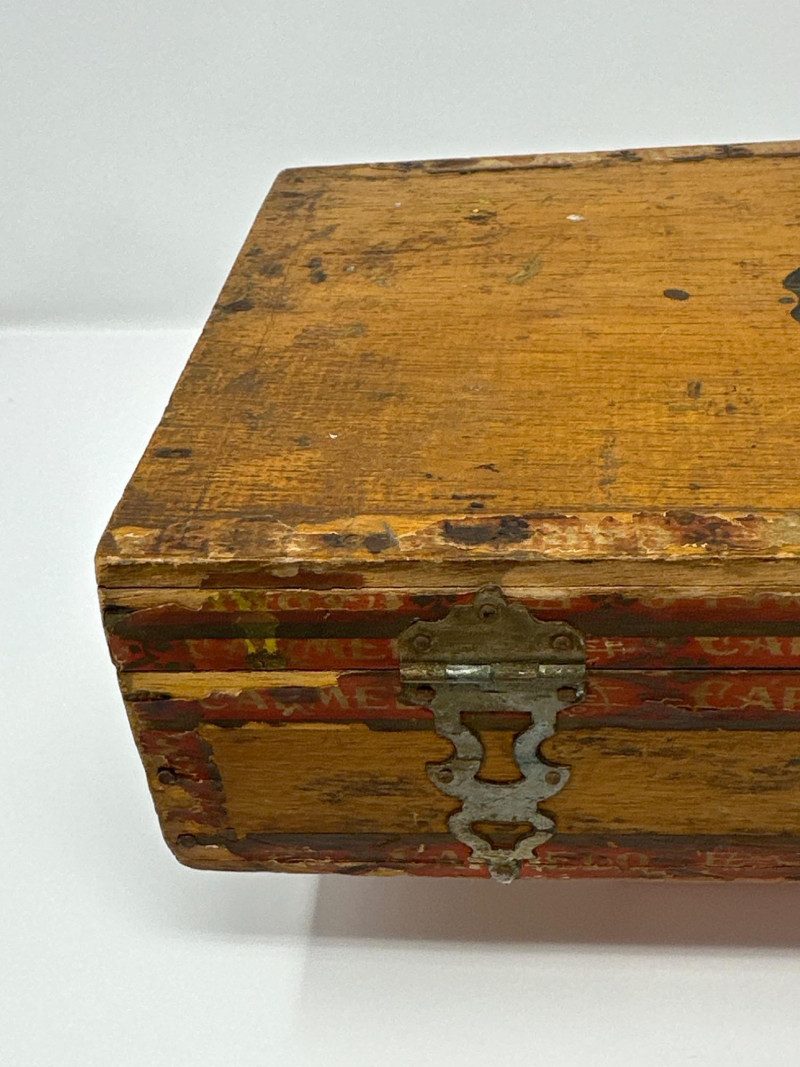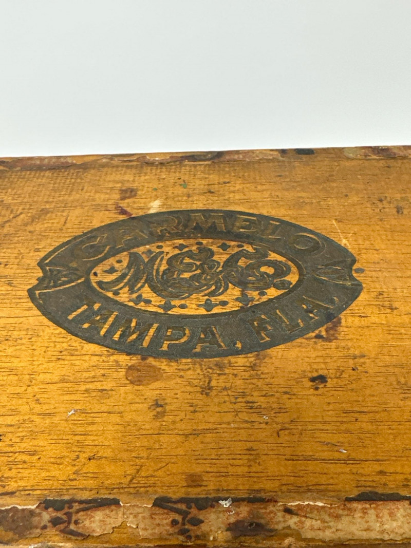 Vintage Carmelo wood cigar box repurposed as an artist’s paint case, featuring three removable wooden insert trays. The lid displays vibrant lithographed branding with a central figure playing guitar, flanked by circular emblems and bordered by repeating “CARMELO” logos. The interior trays are compartmentalized and show signs of pigment use, suggesting a second life as a painter’s mixing and storage box. A rare crossover artifact blending early 20th-century cigar merchandising with folk art utility. Length: 11"–12" Width: 7"–8" Height (with trays inside): 3.5"–4"