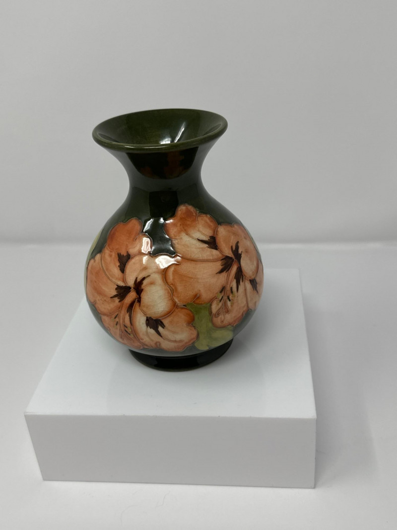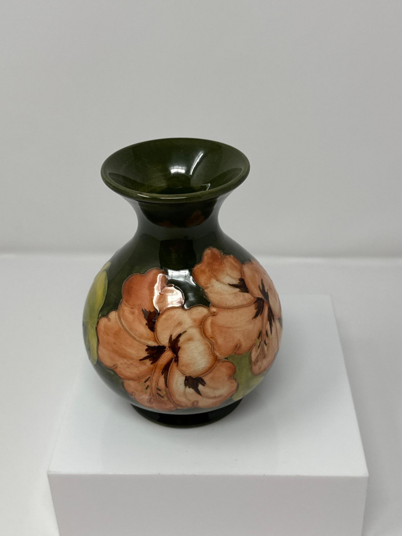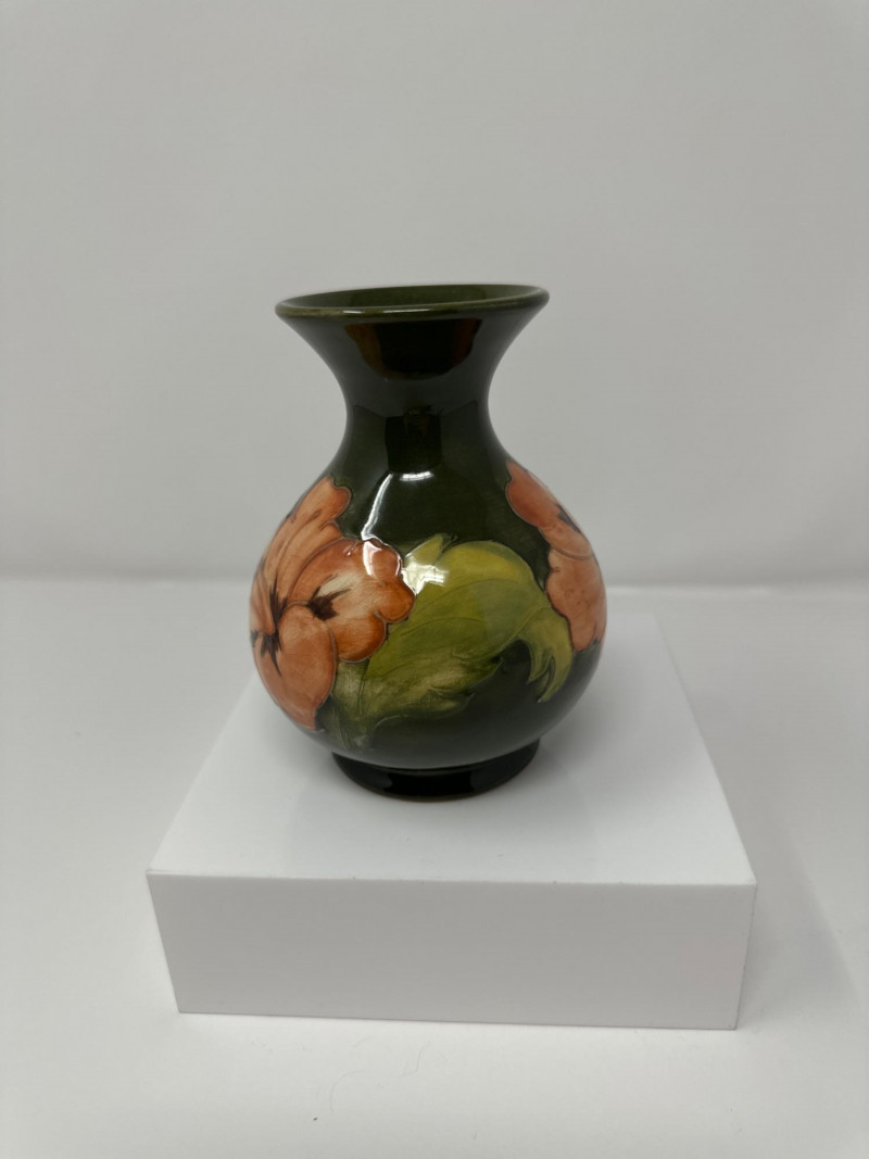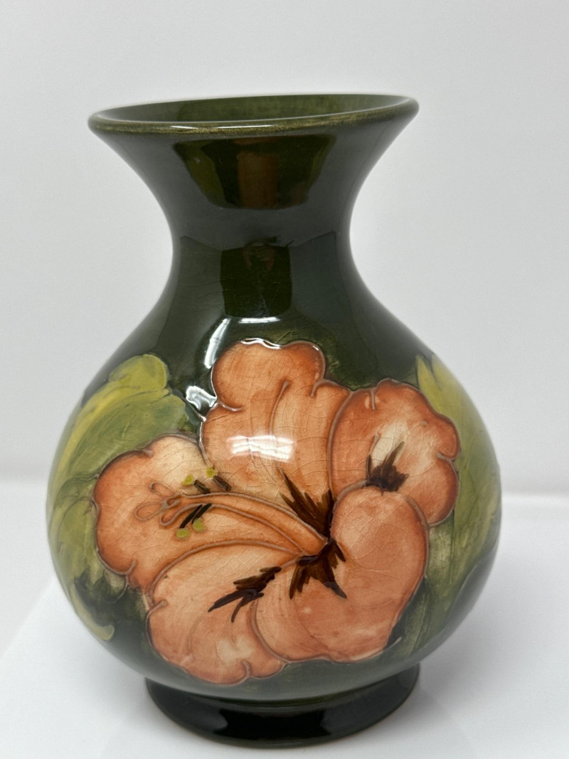 A classic Moorcroft art pottery vase featuring the iconic Hibiscus pattern, hand-painted in rich tones of peach, green, and brown. The bulbous body is glazed in deep forest green and adorned with a large peach-colored hibiscus bloom with dark stamens and lush green leaves, rendered in Moorcroft’s signature tubelined technique. The flared rim adds elegance to the silhouette, while the glossy glaze and painterly detail reflect the studio’s renowned craftsmanship. Dating to the mid-20th century, this piece exemplifies Moorcroft’s tradition of expressive floral design and collectible British ceramics.