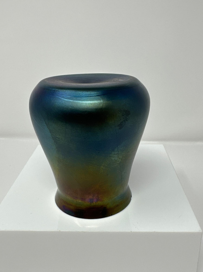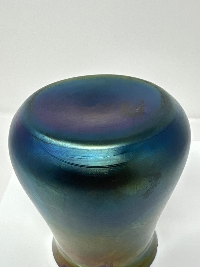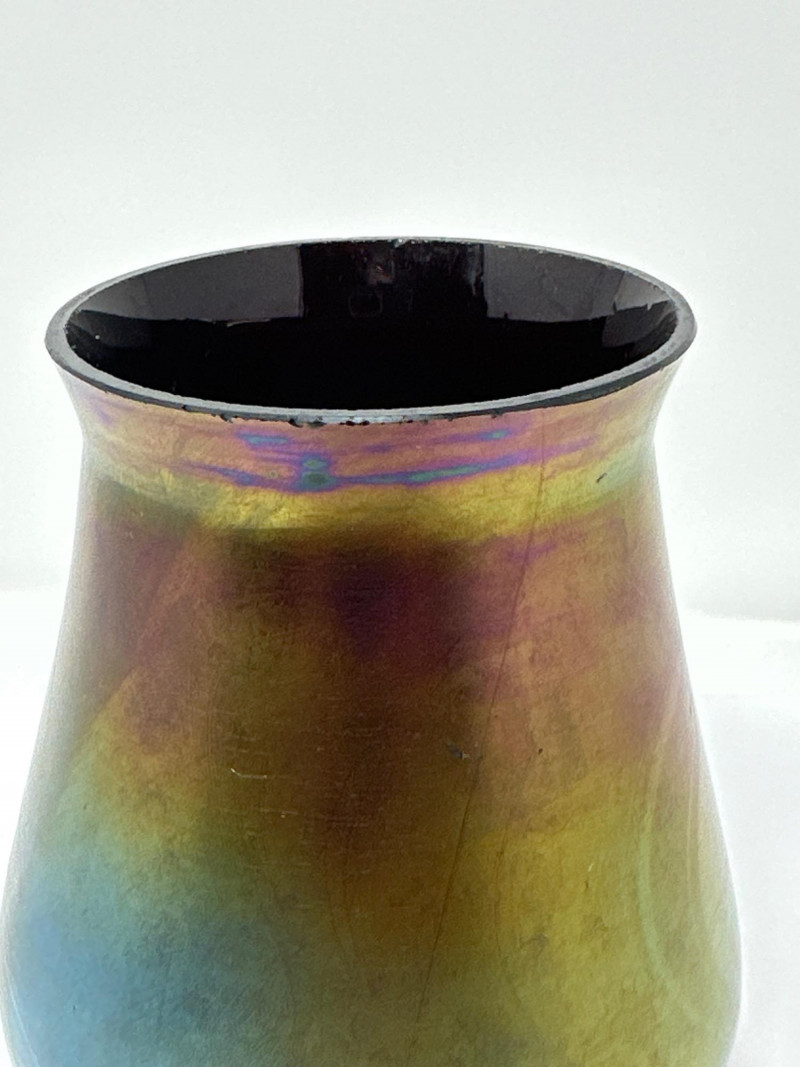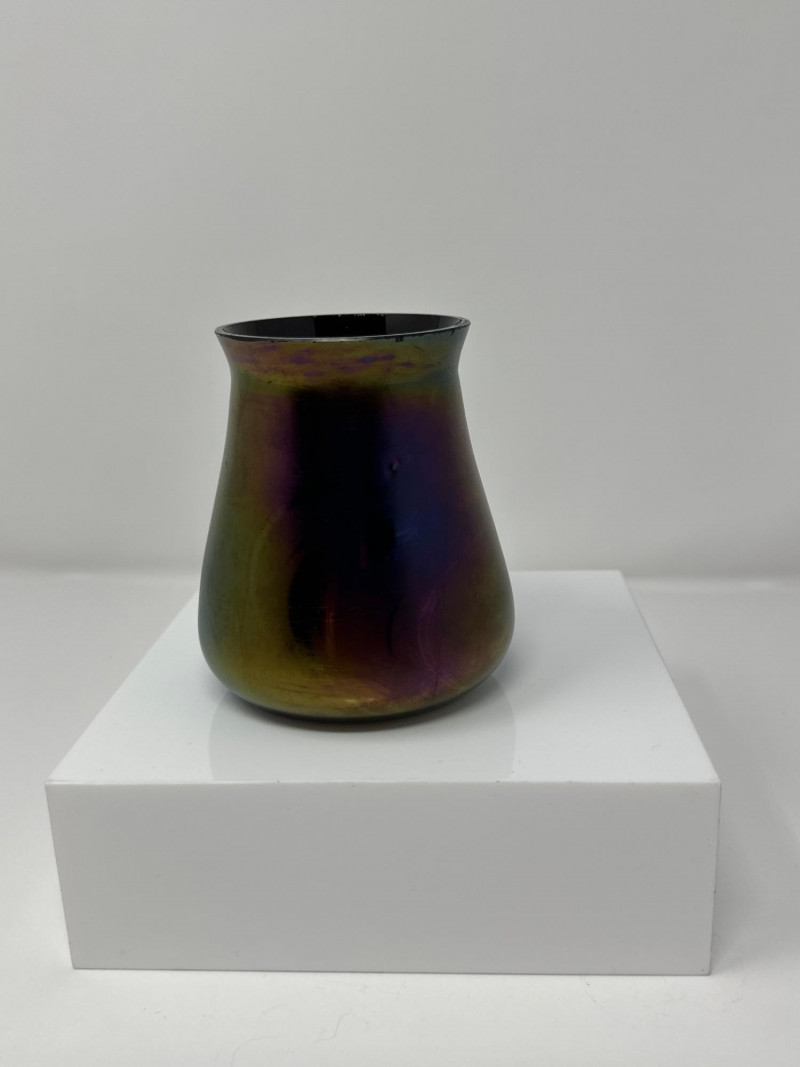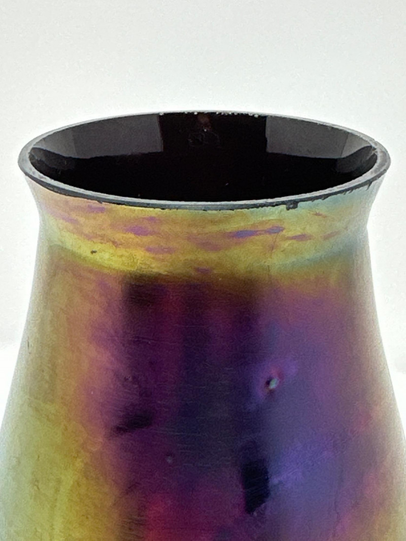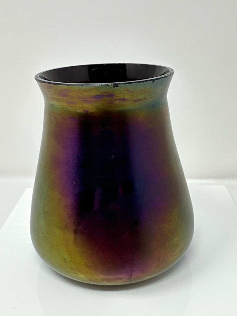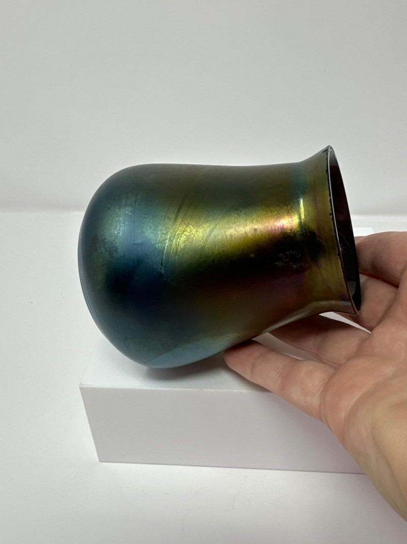 An exquisite Bohemian Czech art glass vase attributed to Loetz, featuring a wide base and gently flared rim. The surface is finished in a stunning iridescent glaze that shifts between violet, gold, green, and blue tones, creating a luminous, oil-slick effect characteristic of Loetz’s renowned craftsmanship. Likely dating to the early 20th century, this piece showcases the studio’s mastery of form and finish, with a smooth body and elegant silhouette that highlight the dynamic color play. Please note- there is some small flea bites (inperfections, chip like flaking on the upper rim) Clearly shown in the pictures. Description: