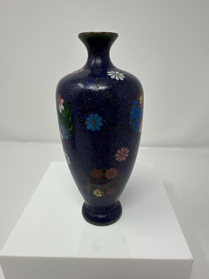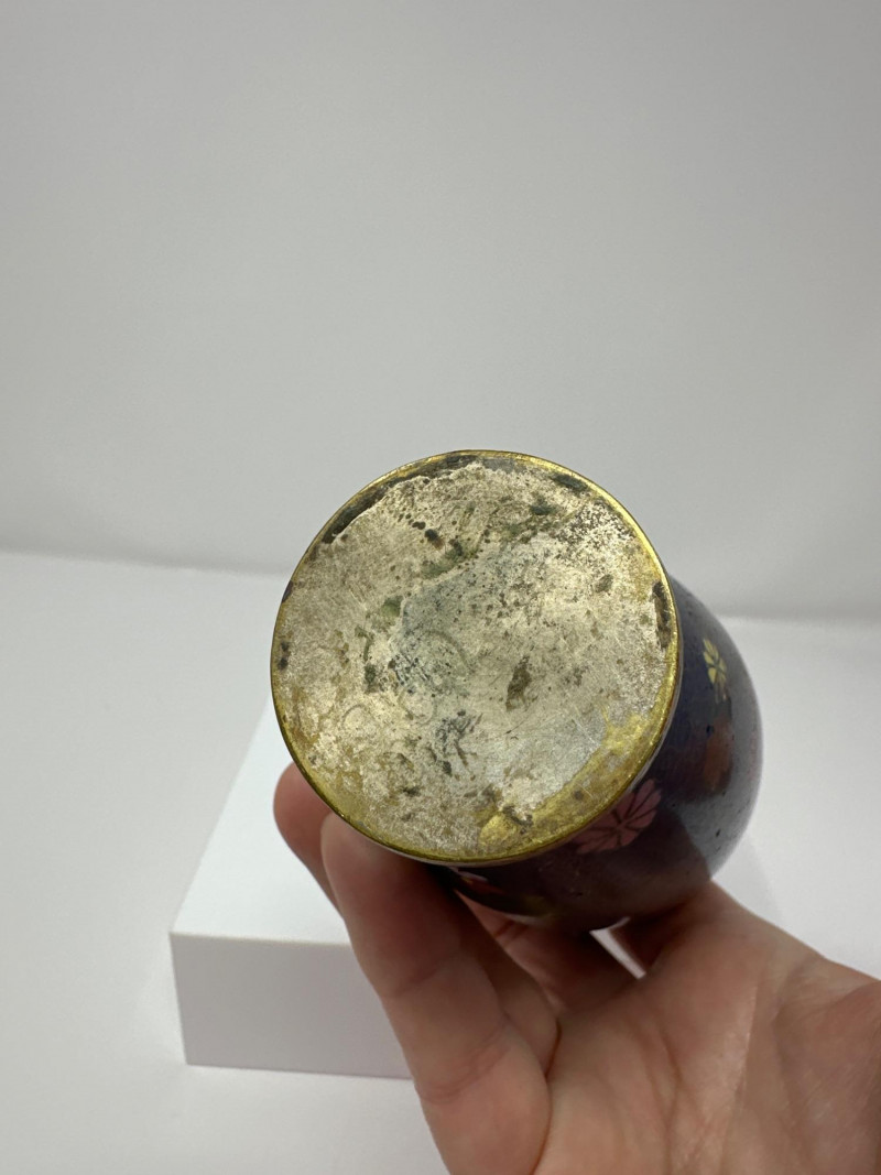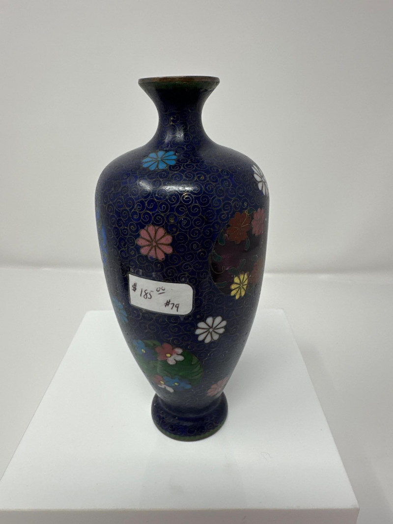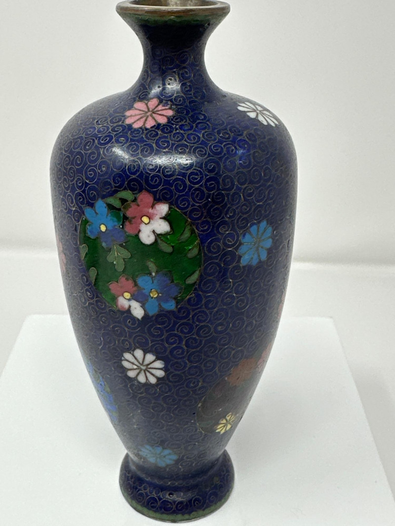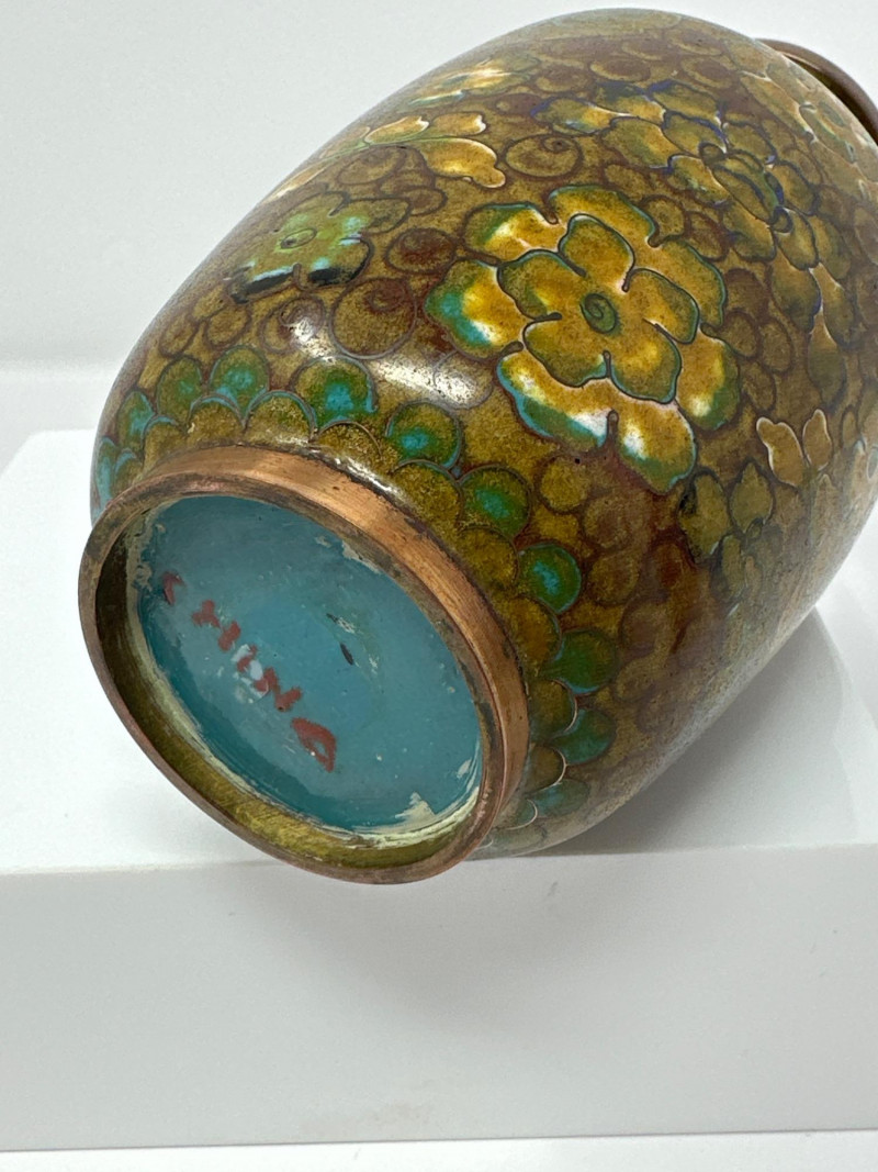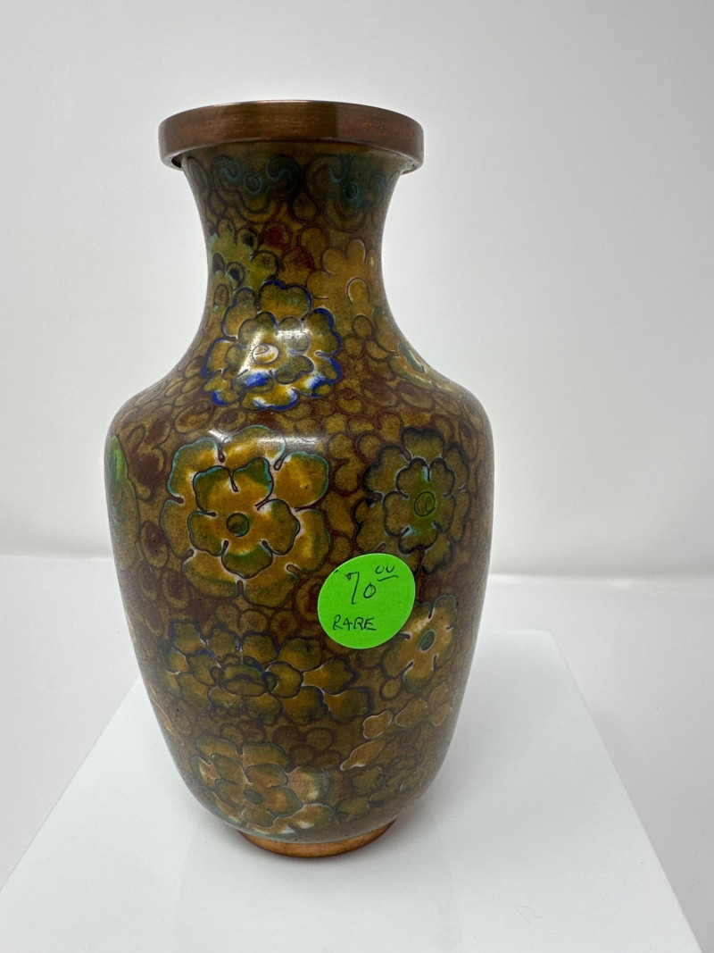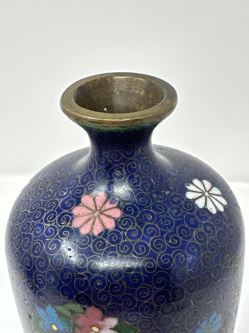 A striking pair of antique Chinese cloisonné vases, each showcasing intricate enamel work and vibrant floral decoration. Blue Vase A deep navy blue ground sets the stage for colorful enamel florals in pink, yellow, and green, framed by traditional scrolling accents. The body is bulbous with a gently flared neck, and the surface gleams with a high-gloss finish. A sculpted gilt handle in the form of a stylized dragon or phoenix adds dimensionality and symbolism, anchoring the piece in Chinese decorative tradition. 6.5 T x 3.5 W Green Vase This rare example features a warm brown enamel base with delicate floral sprays in soft pinks and greens. The form is slightly more slender, with a similar dragon-form handle rendered in gilt metal. The green “CU RARE” label suggests collector interest or provenance. 6.5 T x 3 W