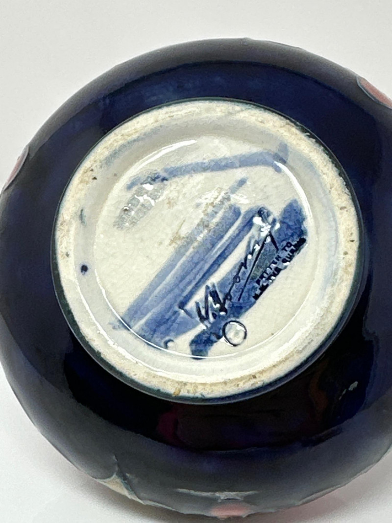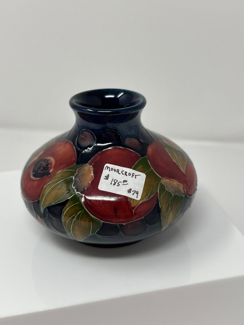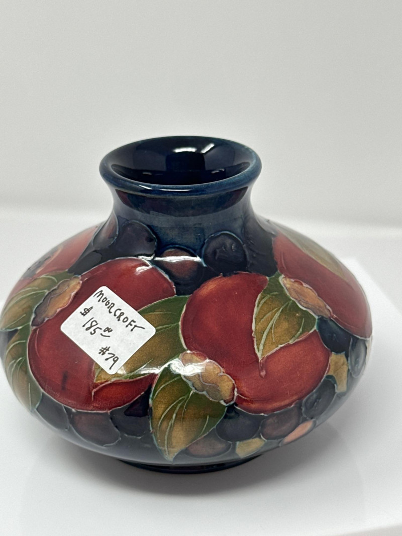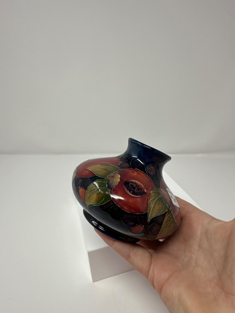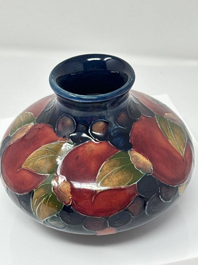 This vase is a beautiful example of Moorcroft pottery, renowned for its rich glazes, tube-lining technique, and vibrant, nature-inspired designs. The piece features a rounded body with a slender neck, showcasing a hand-painted motif of pomegranates and berries in deep reds, purples, and oranges, interwoven with lush green leaves. The glossy finish enhances the depth and richness of the colors, giving the artwork a luminous quality. Moorcroft ceramics are celebrated for their Art Nouveau and Arts and Crafts influences, and this vase exemplifies that tradition with its organic forms and flowing botanical imagery. The fruits and foliage are outlined in raised slip (tube-lining), a hallmark of Moorcroft craftsmanship, which adds texture and dimension to the design. Most Moorcroft vases with the classic pomegranate-and-berry design were produced between the mid‑1910s and the late 1930s