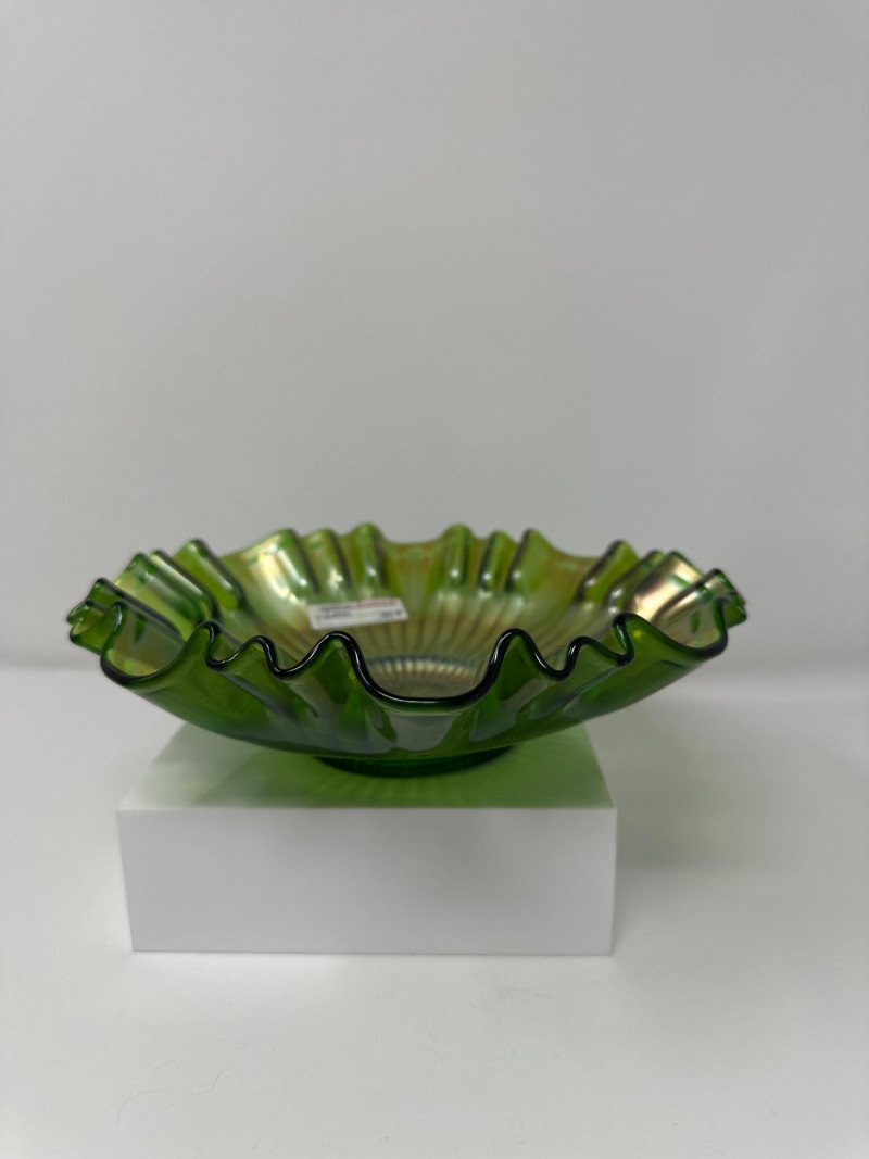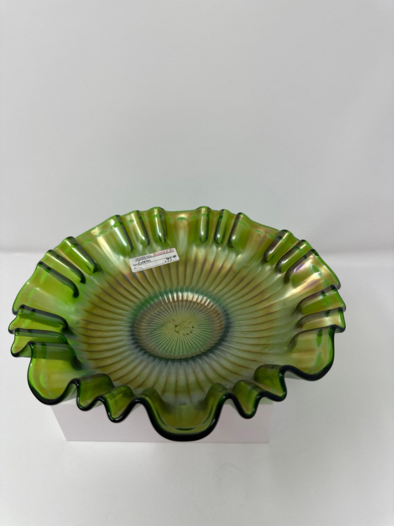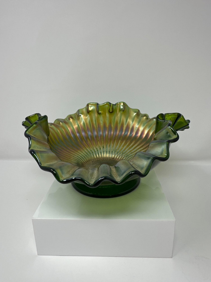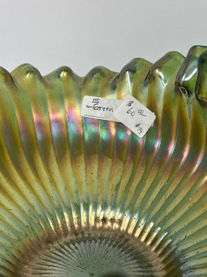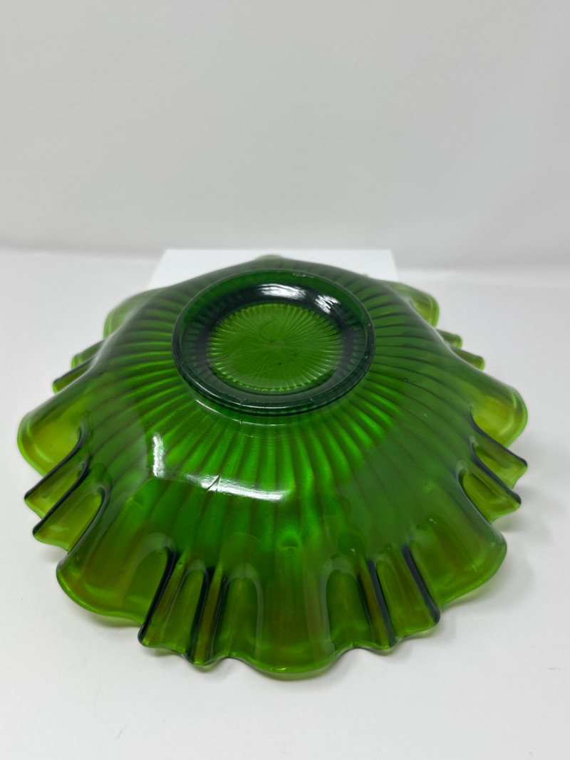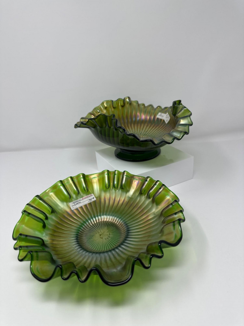 Vintage Fenton green carnival glass bowls, each showcasing a distinct pressed pattern and iridescent finish. Peacock Iridescent Bowl: Features the iconic peacock tail motif radiating from the center, with a high-gloss green base and vivid iridescence that shifts between gold, aqua, and violet. The ruffled edge adds movement and depth, making this a standout example of Fenton’s decorative artistry. 9 x 4 Stippled Rays 3-in-1 Ruffled Bowl: Displays a stippled radial pattern with crisp definition and a classic 3-in-1 ruffled edge — a form known for its sculptural elegance. The green carnival glass finish glows with subtle multicolor highlights, enhancing the texture and dimensionality of the bowl. 8.5 x 2.5