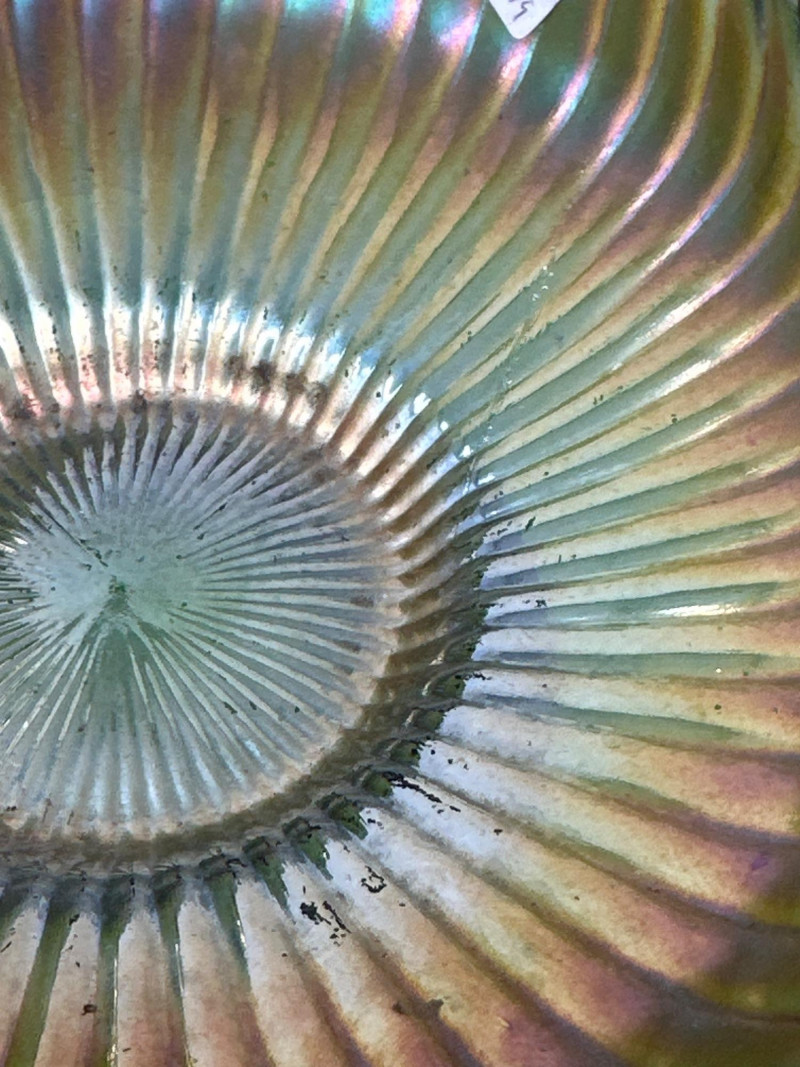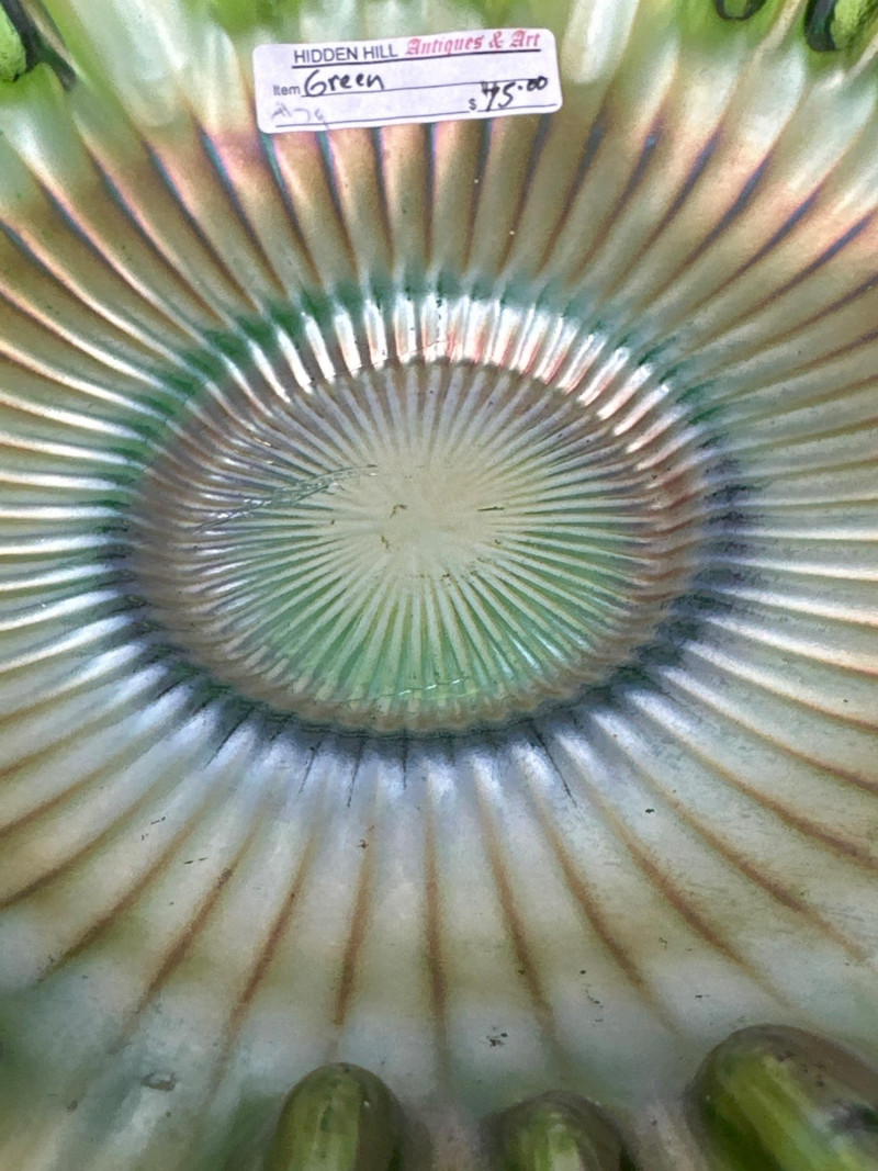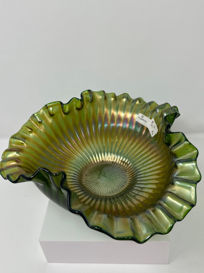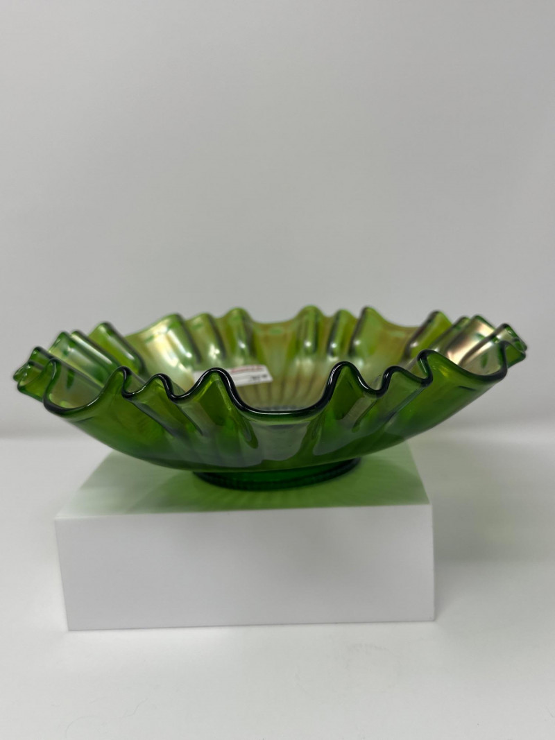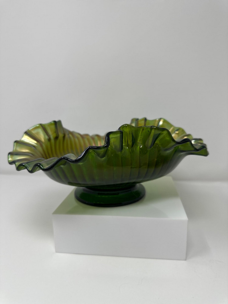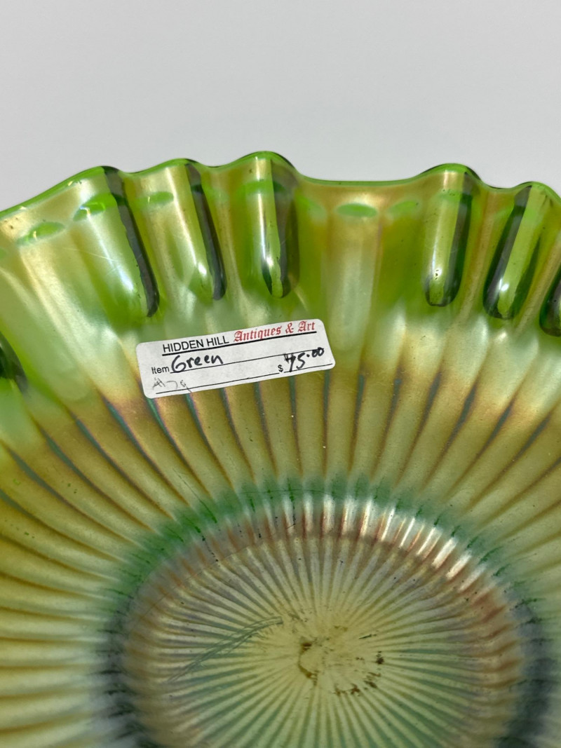 Vintage Fenton green carnival glass bowls, each showcasing a distinct pressed pattern and iridescent finish. Peacock Iridescent Bowl: Features the iconic peacock tail motif radiating from the center, with a high-gloss green base and vivid iridescence that shifts between gold, aqua, and violet. The ruffled edge adds movement and depth, making this a standout example of Fenton’s decorative artistry. 9 x 4 Stippled Rays 3-in-1 Ruffled Bowl: Displays a stippled radial pattern with crisp definition and a classic 3-in-1 ruffled edge — a form known for its sculptural elegance. The green carnival glass finish glows with subtle multicolor highlights, enhancing the texture and dimensionality of the bowl. 8.5 x 2.5