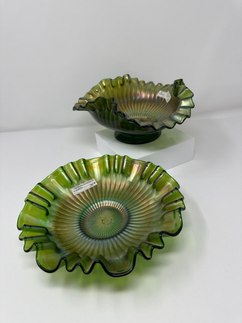 Lot # 94 - Fenton Green Carnival Glass Bowls – Peacock Iridescent & Stippled Rays