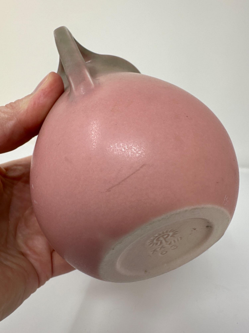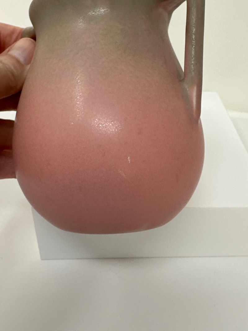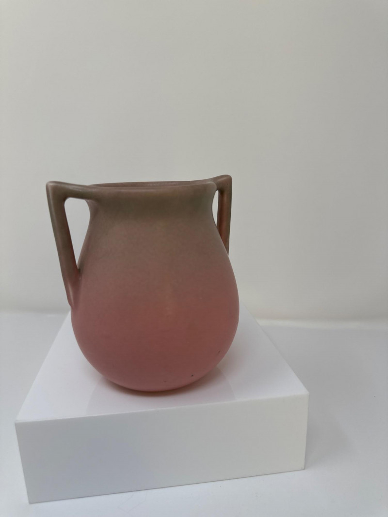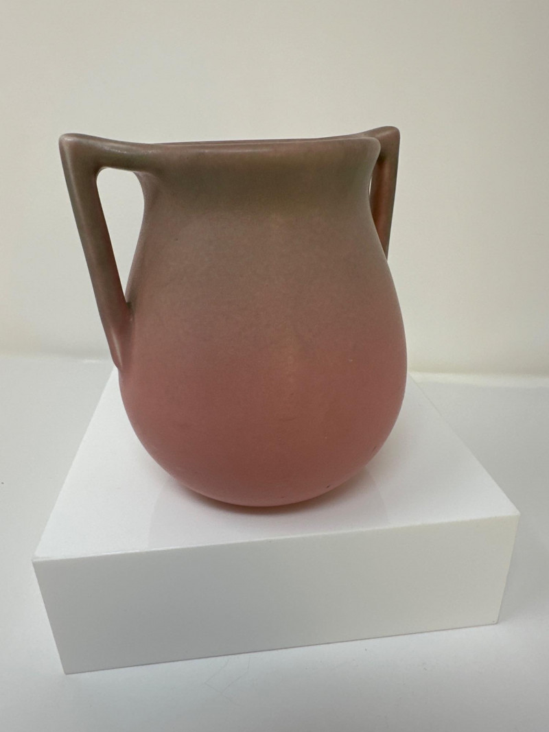 Elegant Rookwood Pottery vase featuring a rounded body with sharply angular handles extending from rim to shoulder. The glaze transitions from muted olive green at the top to soft rose pink at the base, showcasing Rookwood’s mastery of subtle matte finishes. The clean lines and restrained form reflect early 20th-century American Arts & Crafts sensibilities, while the dual handles add architectural interest. Likely produced in the 1920s, this piece exemplifies Rookwood’s commitment to refined craftsmanship and timeless design.