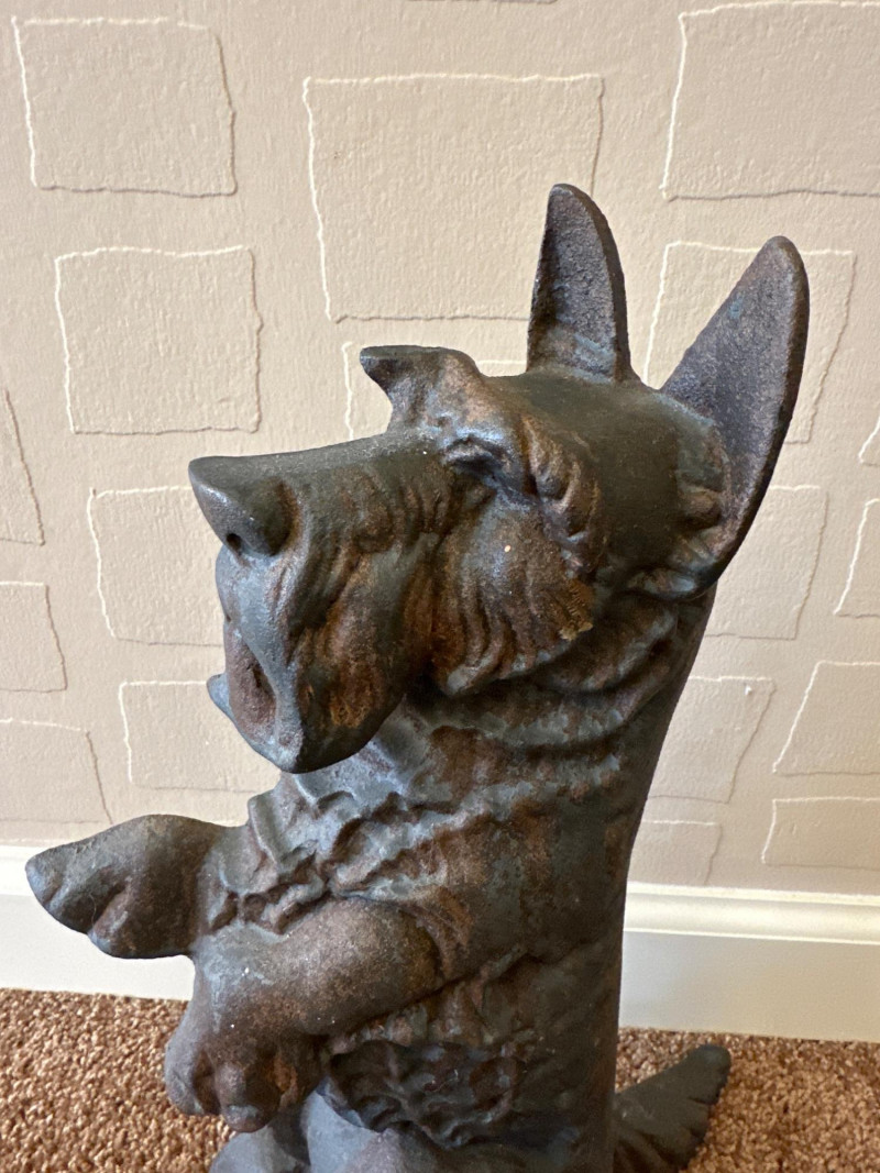 Vintage cast iron doorstop modeled as a Scottish Terrier in a charming upright begging pose, with front paws raised and head tilted attentively. The sculpture captures the breed’s distinctive features—textured fur, pointed ears, and stout body—with crisp casting and lifelike detail. Likely produced in the early to mid-20th century, this piece served both decorative and functional roles, anchoring doors while adding a touch of whimsy to the home. The blackened finish and solid weight reflect traditional ironwork craftsmanship.