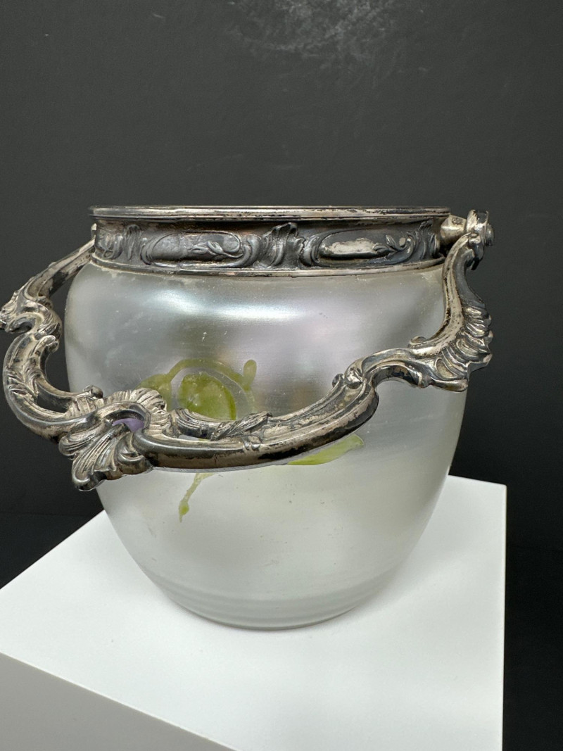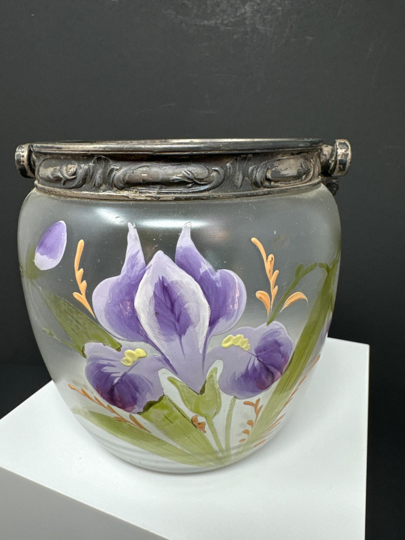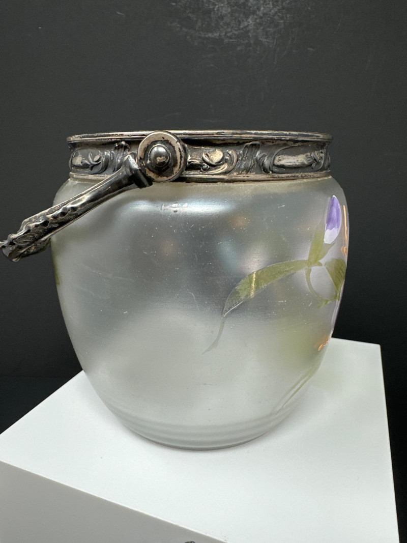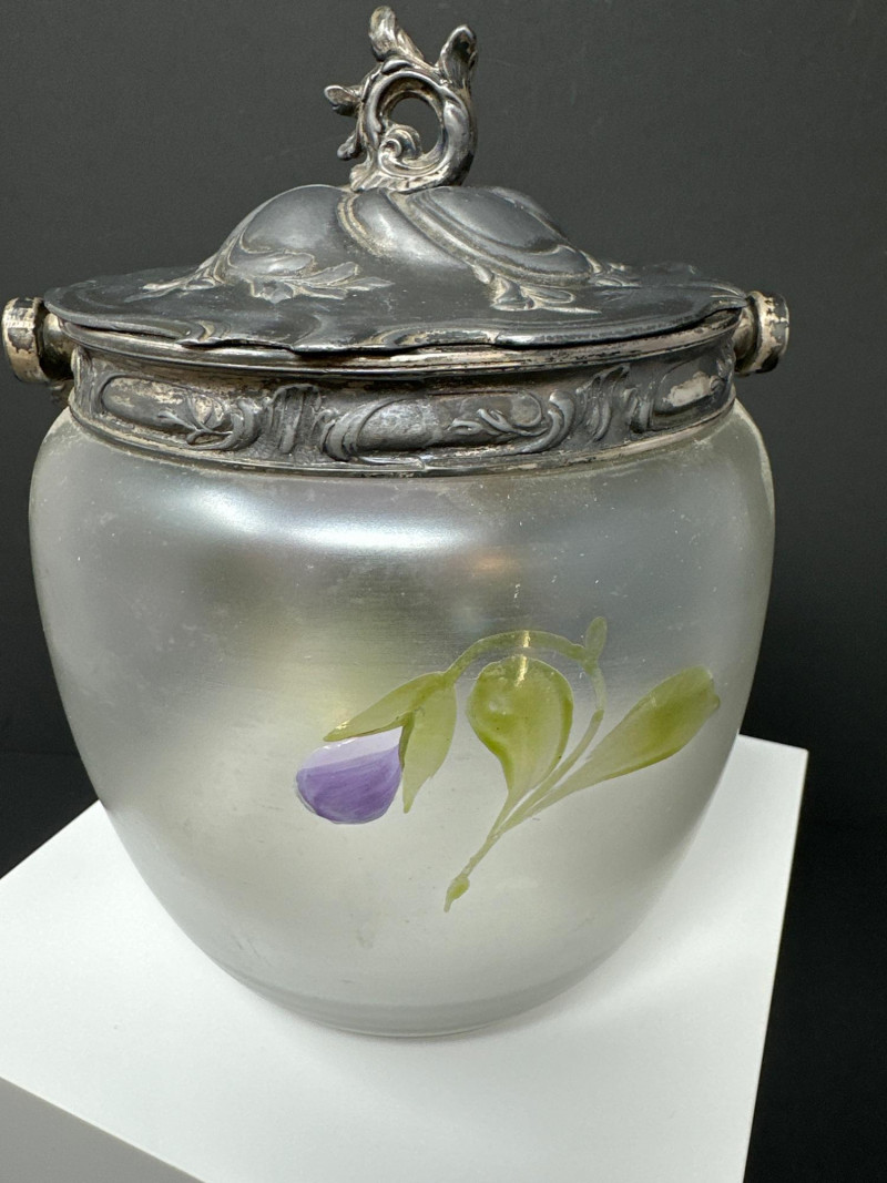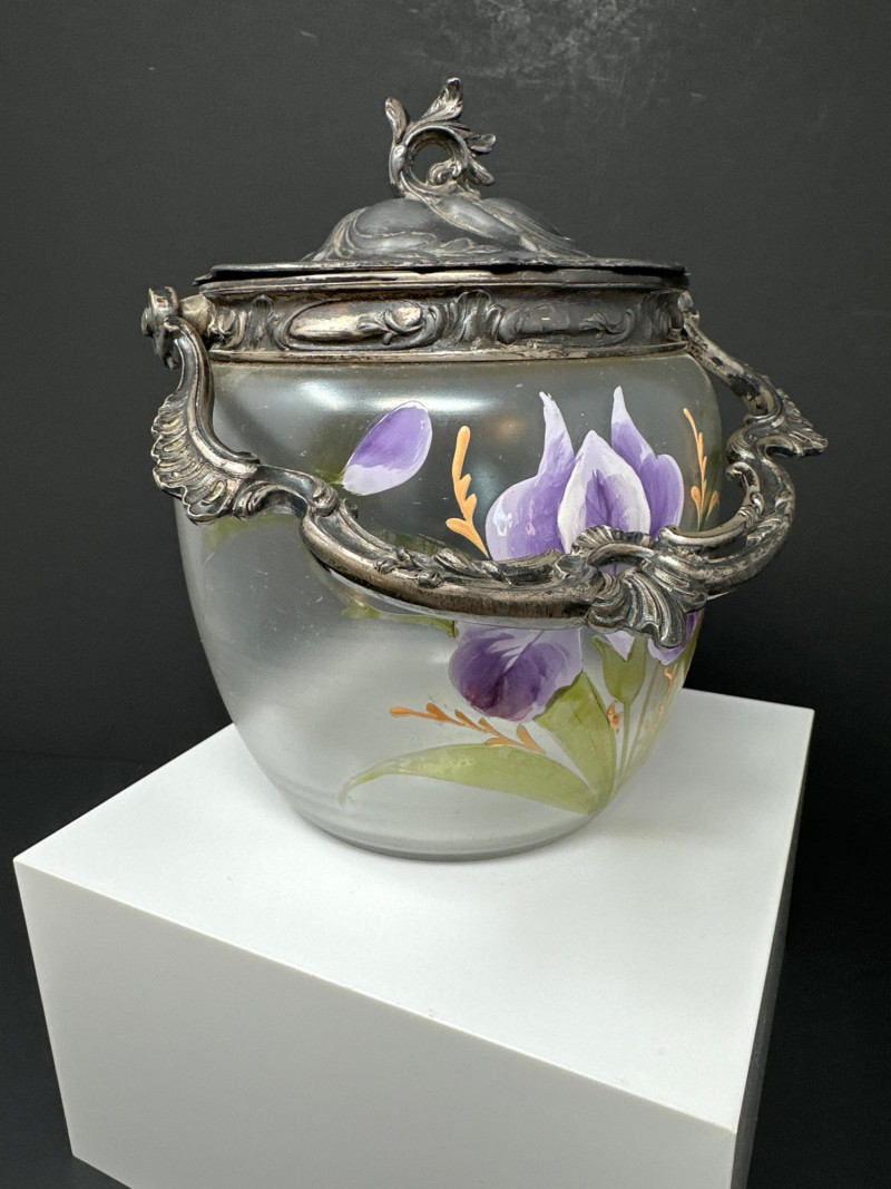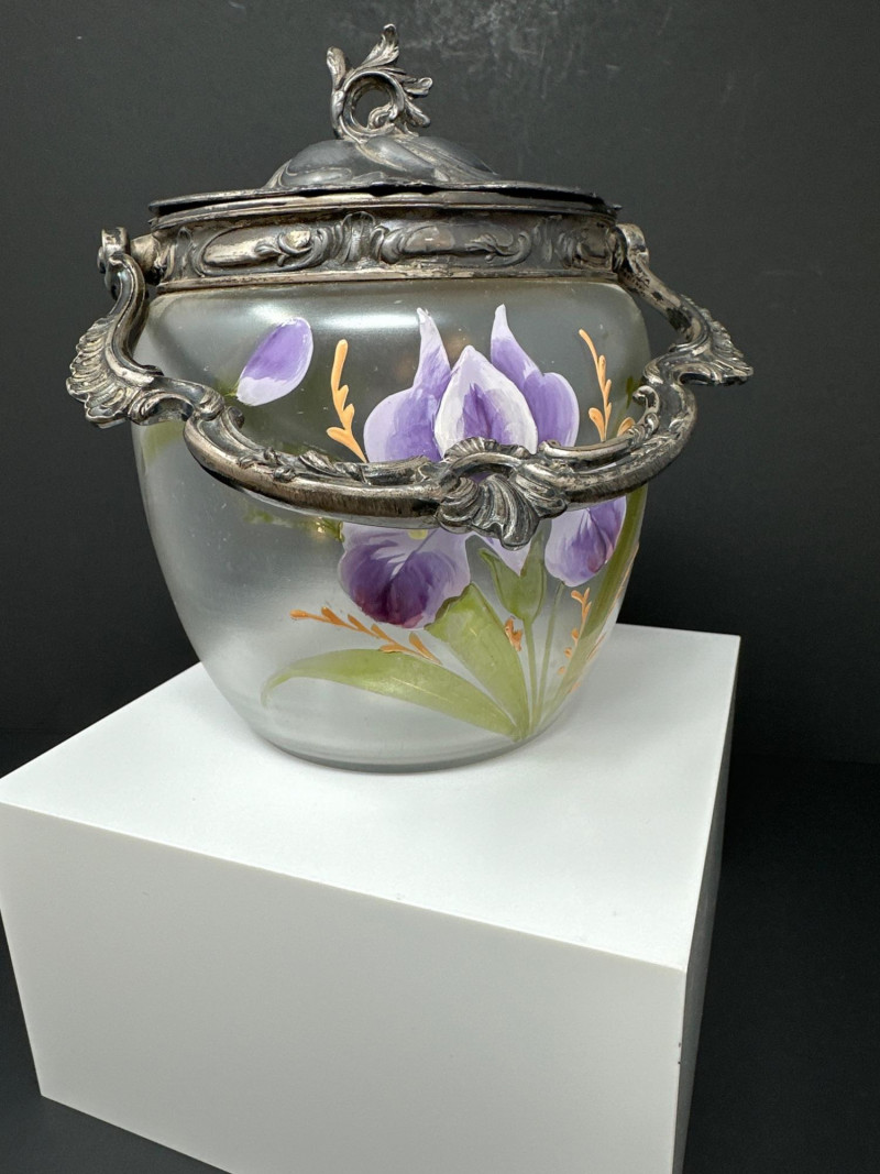 Elegant Victorian biscuit jar crafted from frosted glass and adorned with hand-painted purple iris blossoms, green foliage, and orange accents. The jar features an intricately cast metal lid and handle with floral and scrollwork detailing, typical of late 19th-century decorative metalwork. The sculptural handle and domed lid suggest English or continental European origin, blending botanical artistry with refined craftsmanship. Originally used for serving biscuits or sweets in a formal parlor setting, this piece now serves as a collectible example of Victorian glass and metalware