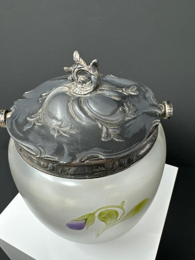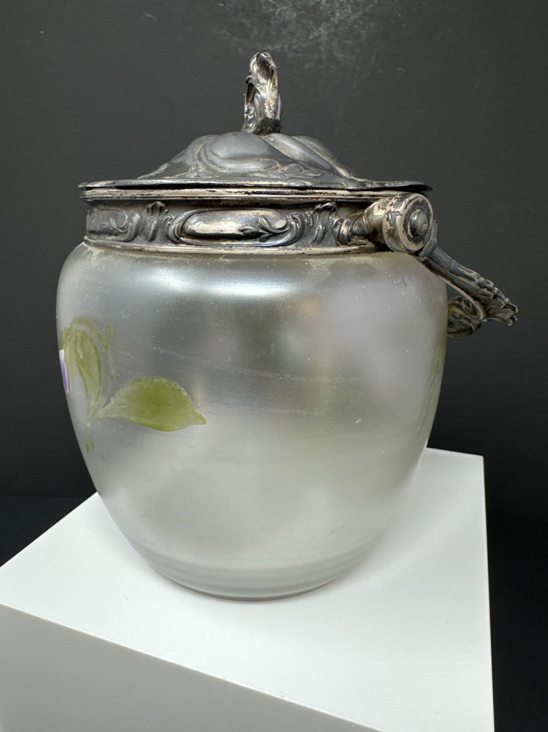 Lot # 101 - Victorian Hand-Painted Frosted Glass Biscuit Jar with Ornate Metal Lid