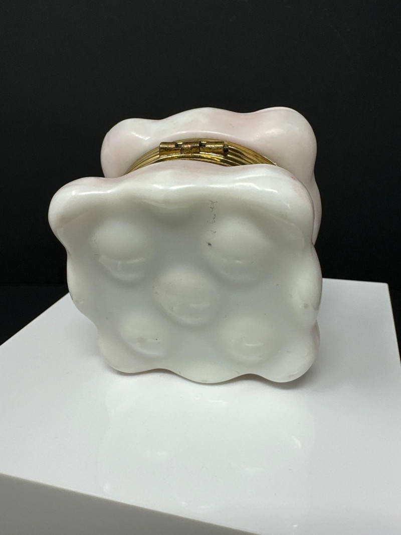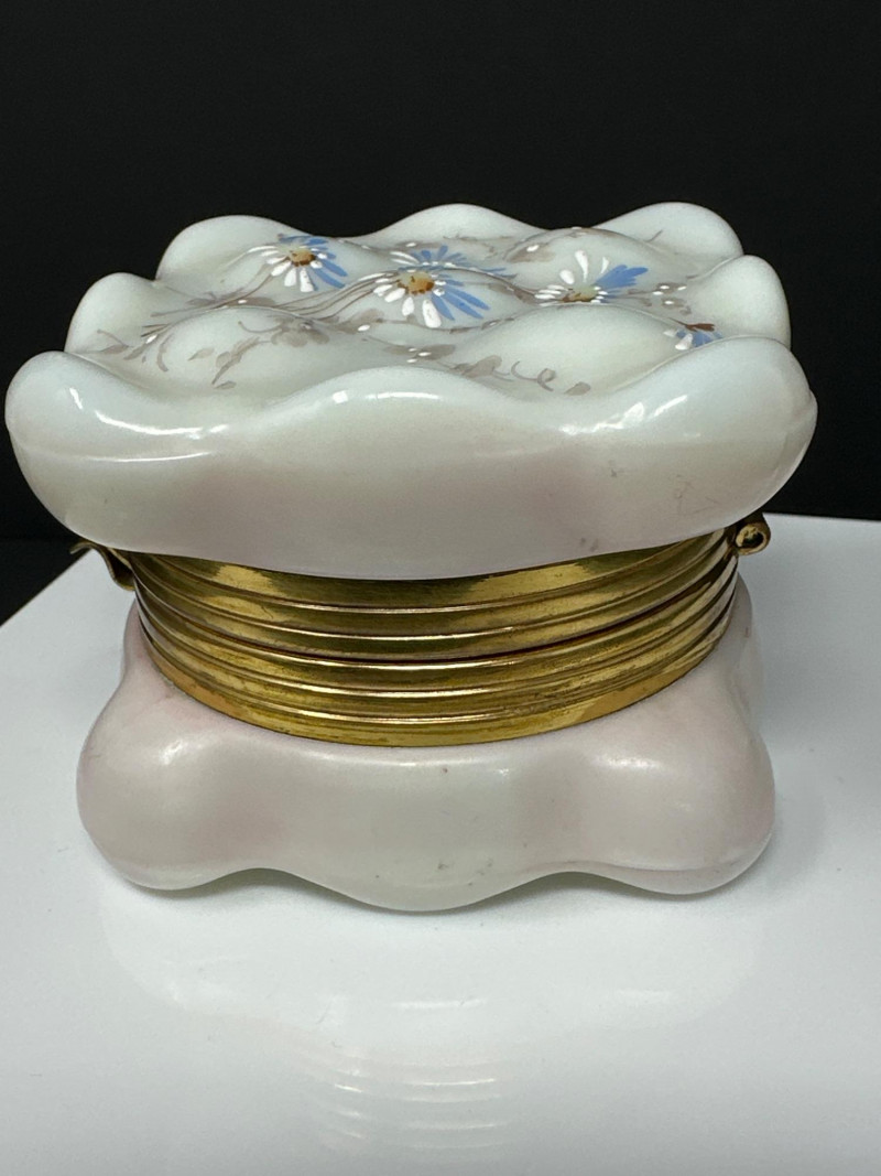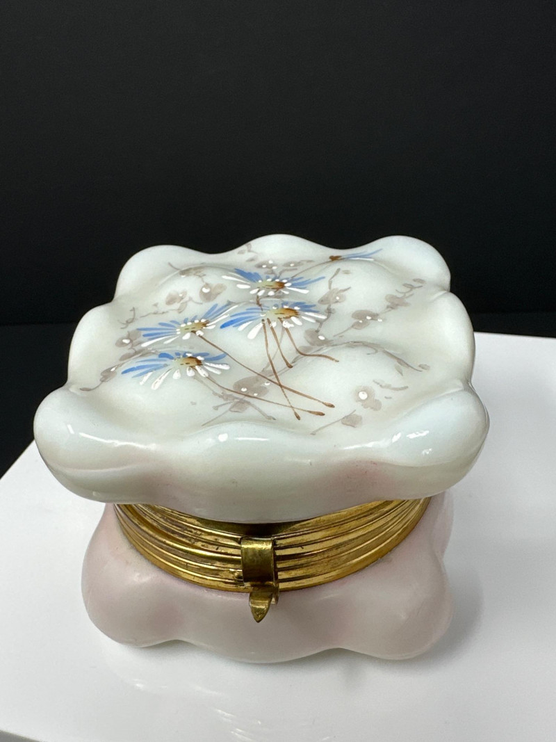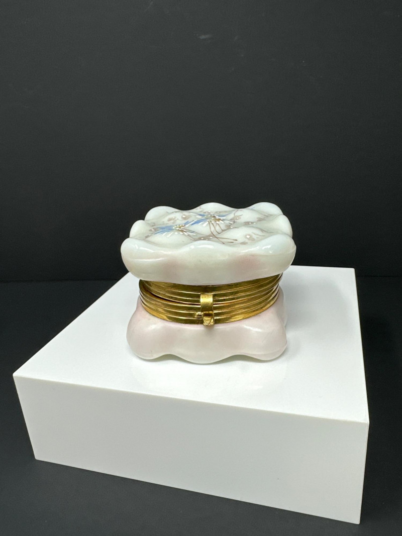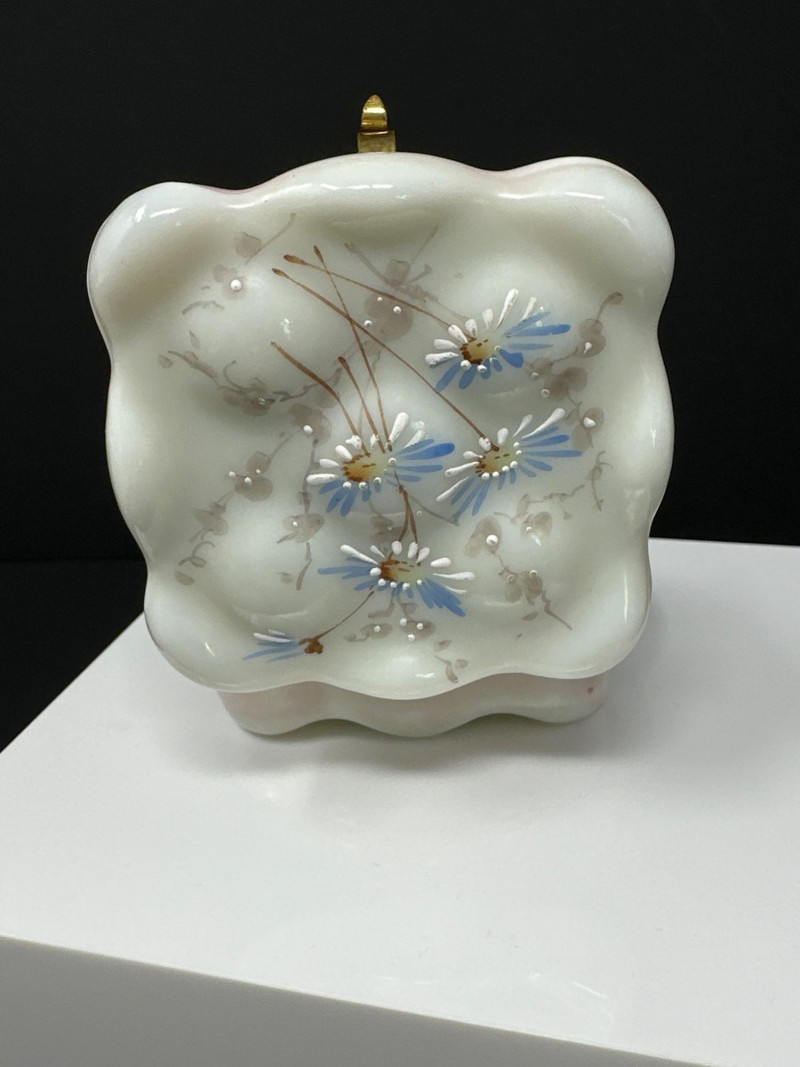 Lot # 102 - C.F. Monroe Wavecrest Dresser Box – Opal Glass with Enameled Florals