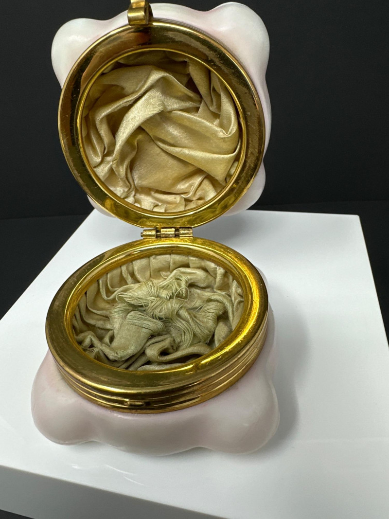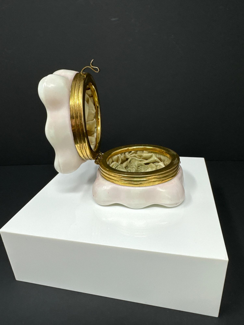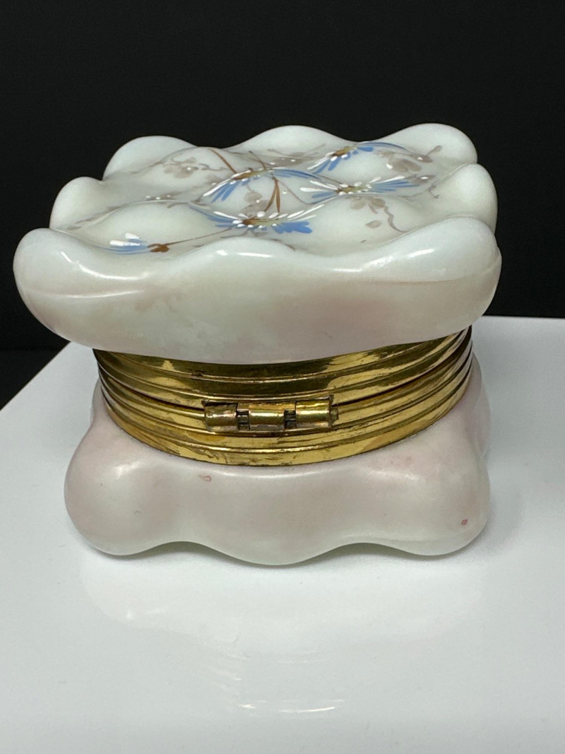 An elegant antique dresser box by C.F. Monroe Co., crafted in opal glass with a soft blush pink hue and scalloped lid. The surface is adorned with hand‑enameled floral sprays in blue and white, accented with gold detailing and delicate brown stems — a hallmark of Monroe’s romantic decorative style. The box retains its original fabric lining, a rare survival that enhances its collector appeal. Fitted with a gilt metal hinge and clasp, the hardware remains intact and functional. Dating to circa 1890, this piece exemplifies the refined craftsmanship and feminine aesthetic of Victorian vanity ware.