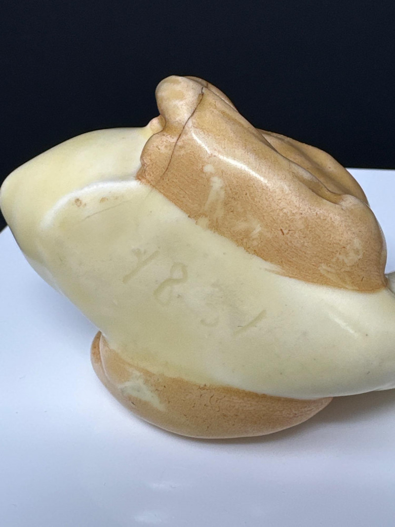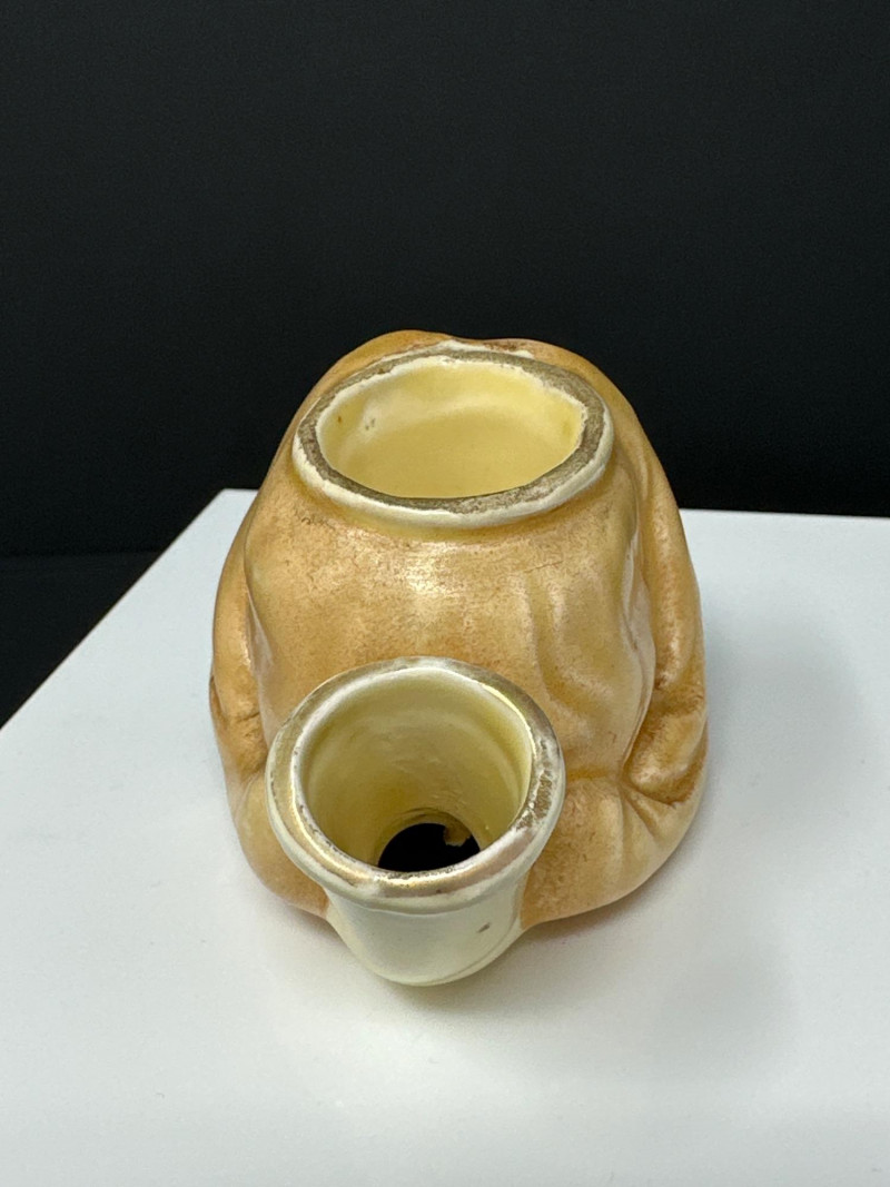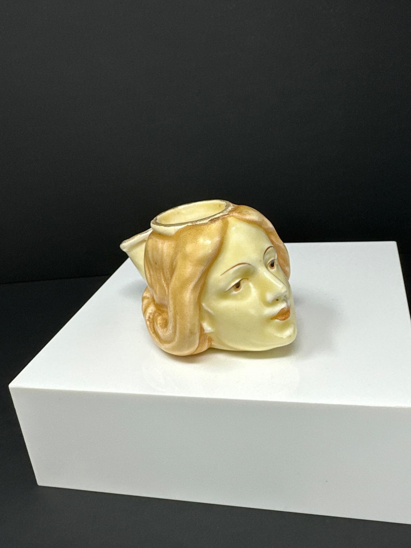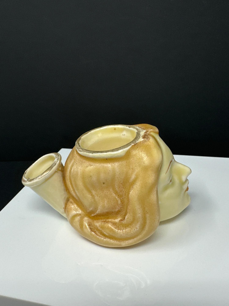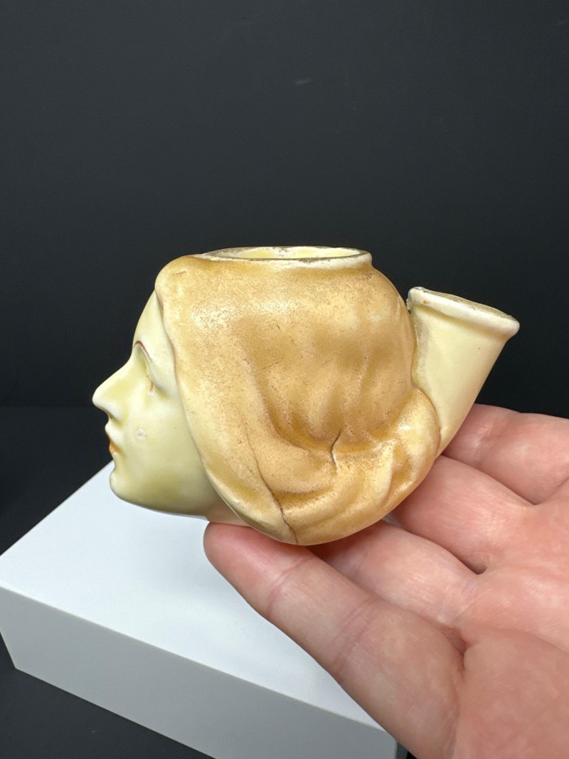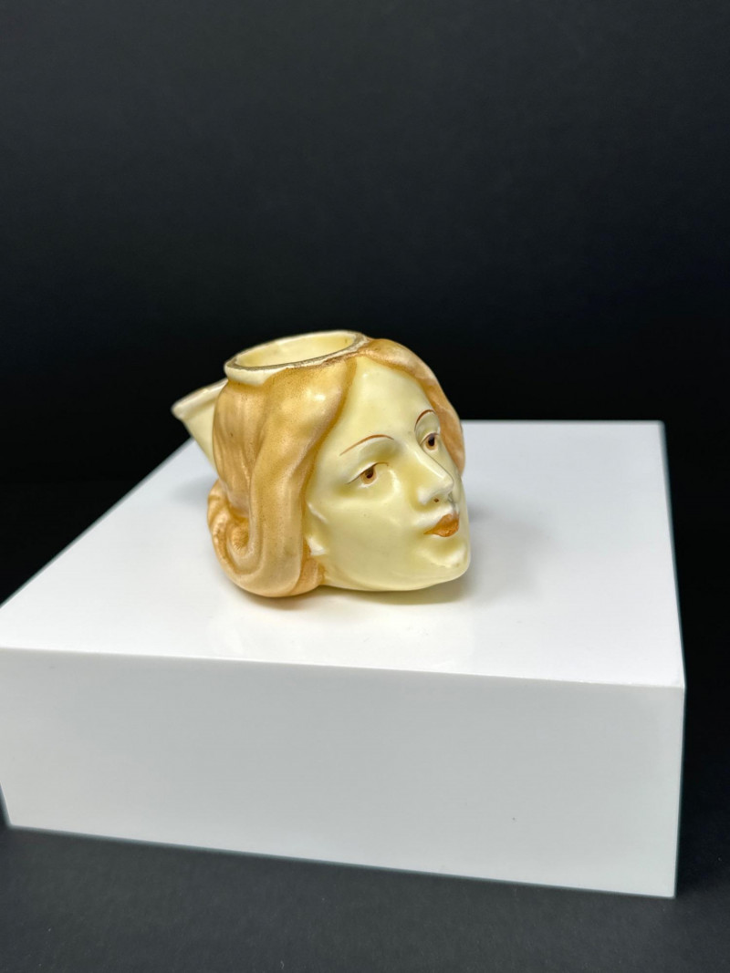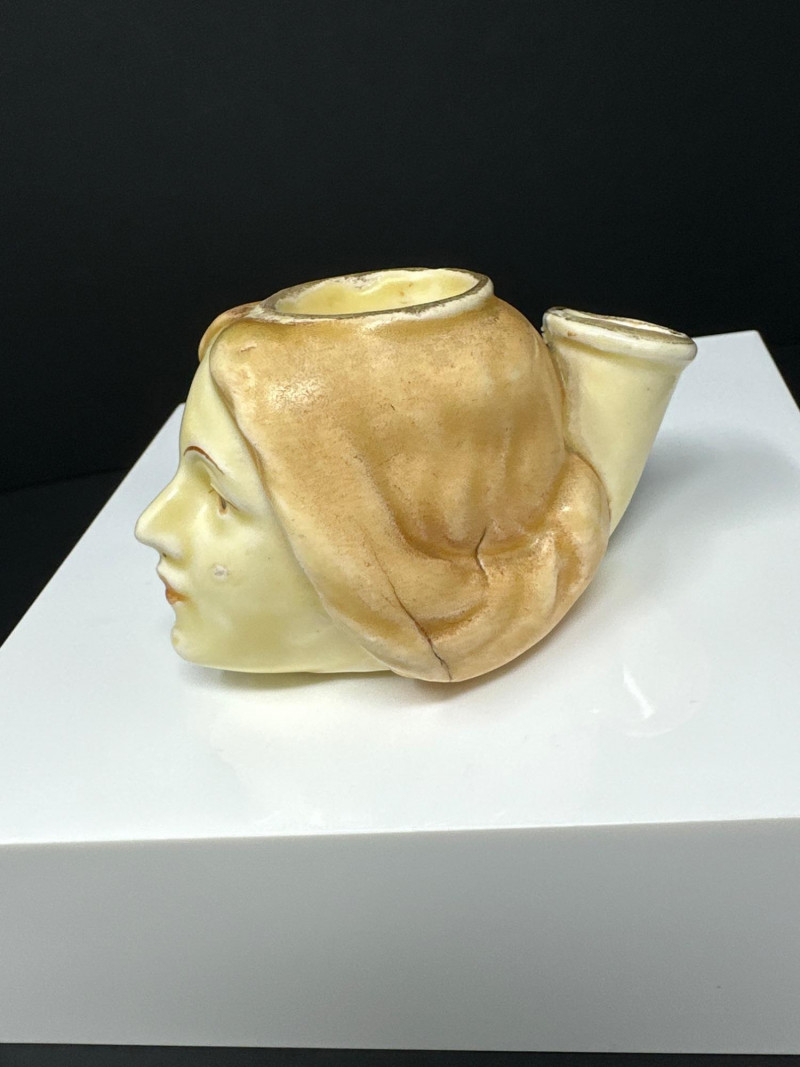 A sculptural figural pipe bowl depicting a stylized woman’s head with long flowing hair, rendered in glazed ceramic or porcelain. The vessel features a top opening for tobacco and is shaped with expressive facial features and golden hair cascading down the sides. Likely produced in the late 19th to early 20th century, this piece blends decorative artistry with functional design. The form suggests European origin, possibly German or Austrian, and may have been part of a novelty or portrait pipe series.