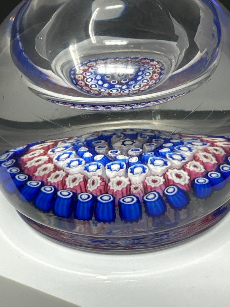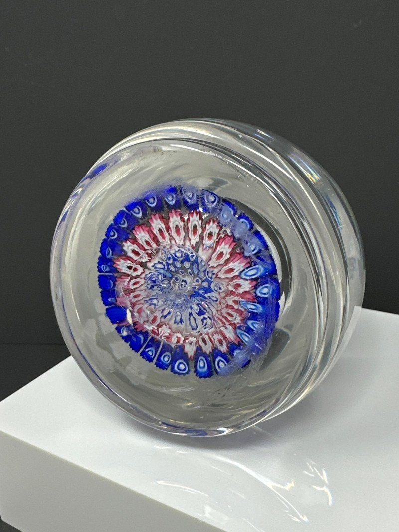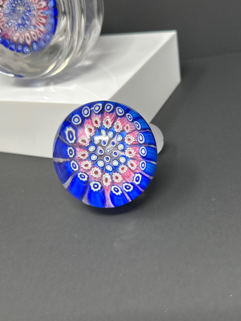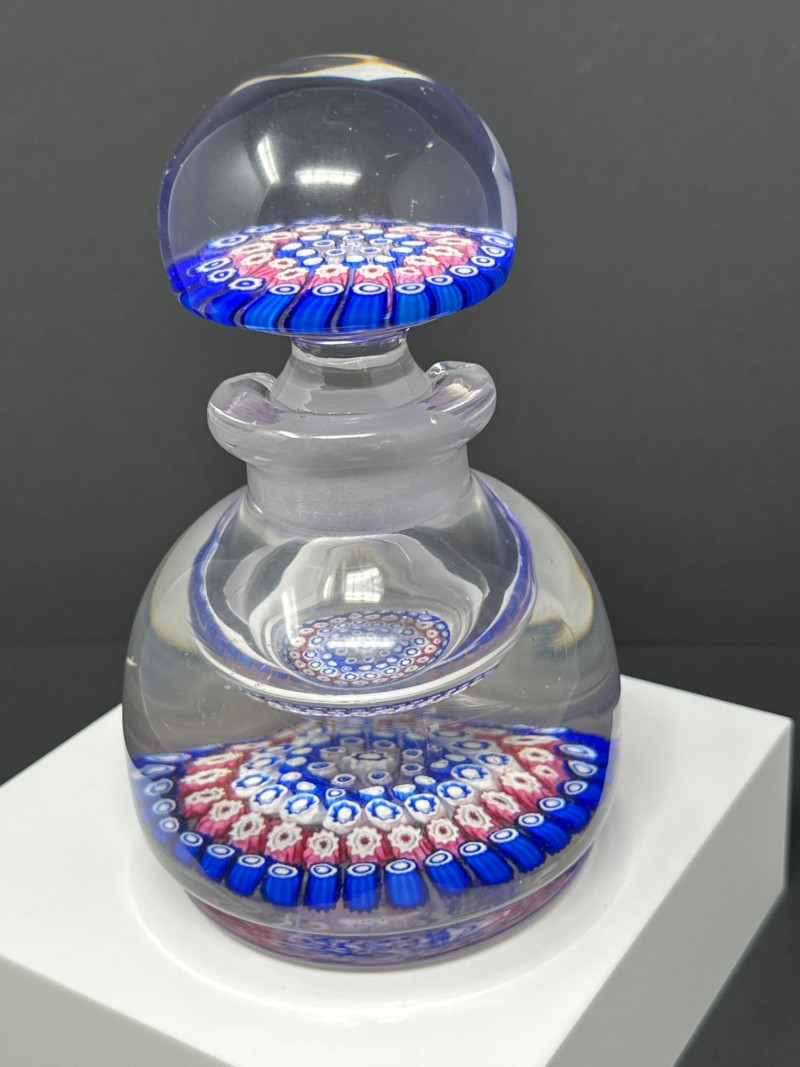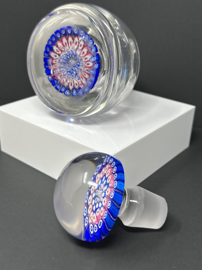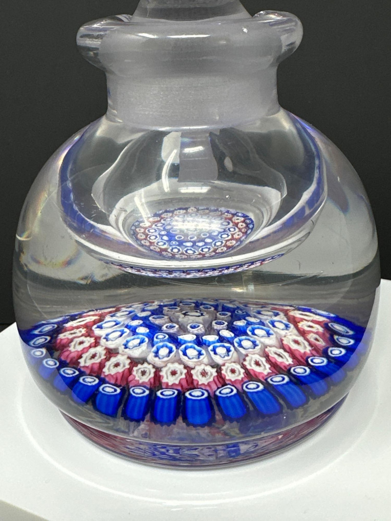A striking Murano glass inkwell bottle attributed to H.G. Richardson’s Starbridge studio, featuring a dense millefiori pattern in vibrant blues, whites, and pinks. The spherical lid and rounded base are crafted in clear glass, encasing tightly packed floral canes arranged in concentric rings. The millefiori technique — a hallmark of Venetian glass artistry — creates a kaleidoscopic effect that shifts with light and angle. Likely produced mid‑20th century, this piece blends British studio glass sensibility with classic Murano craftsmanship. A rare and collectible example of cross‑influence in decorative glass, ideal for display or connoisseur collections.