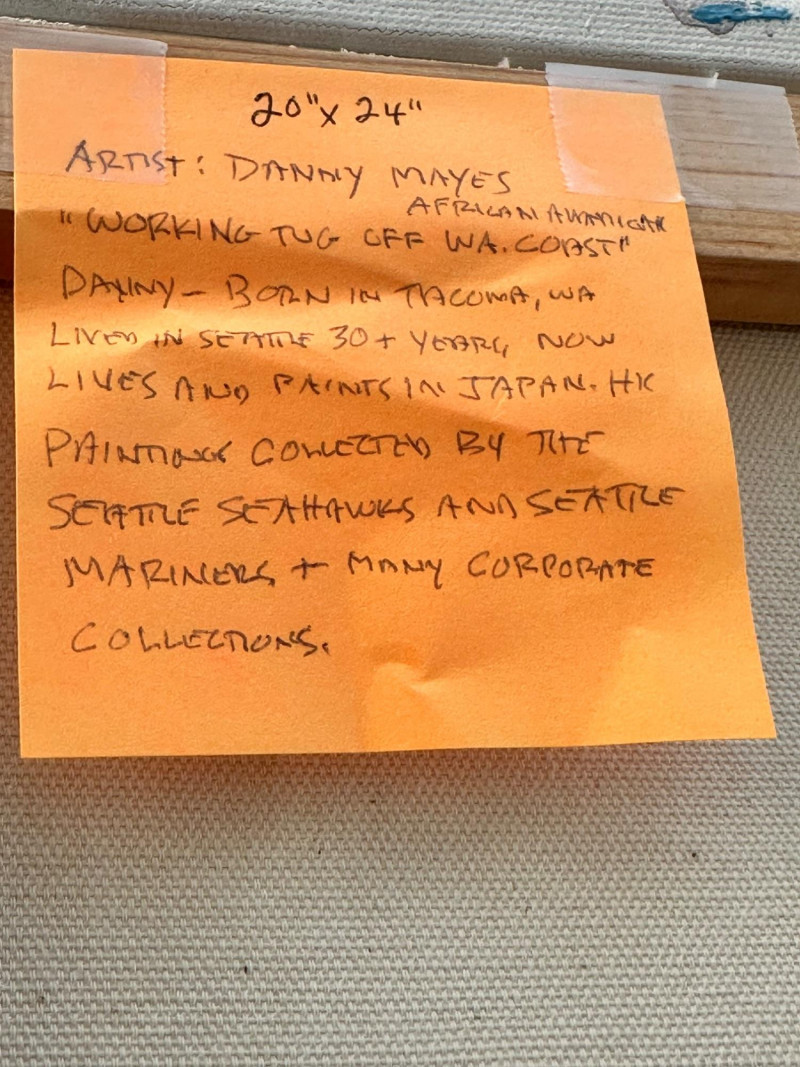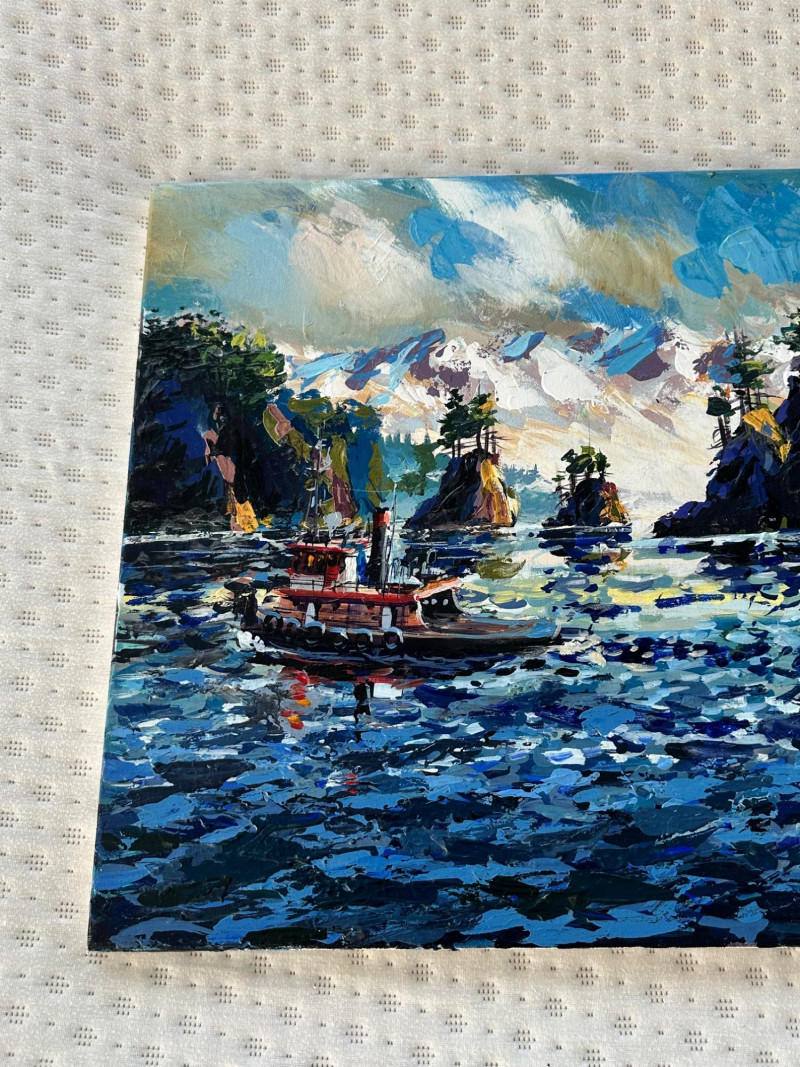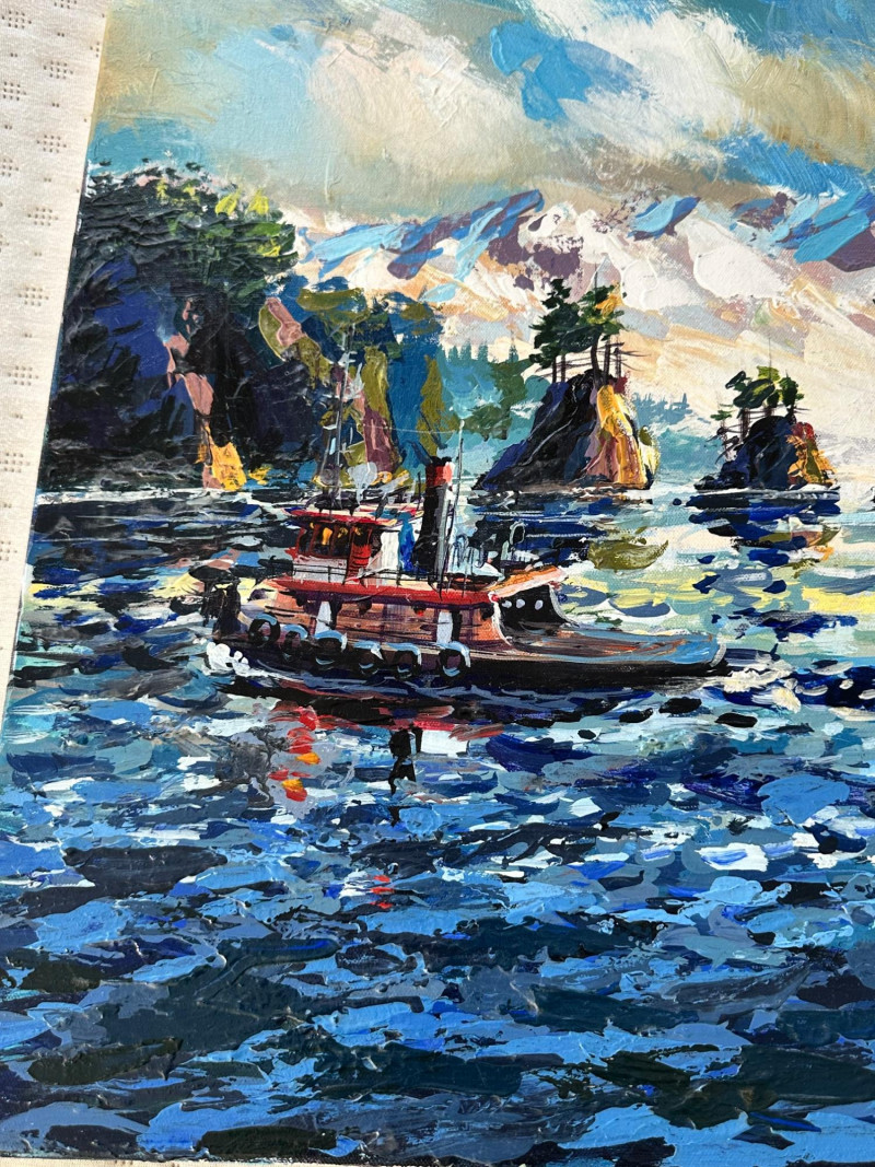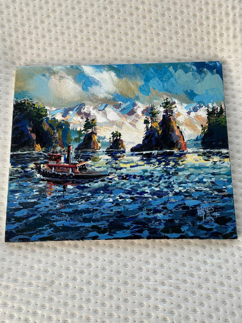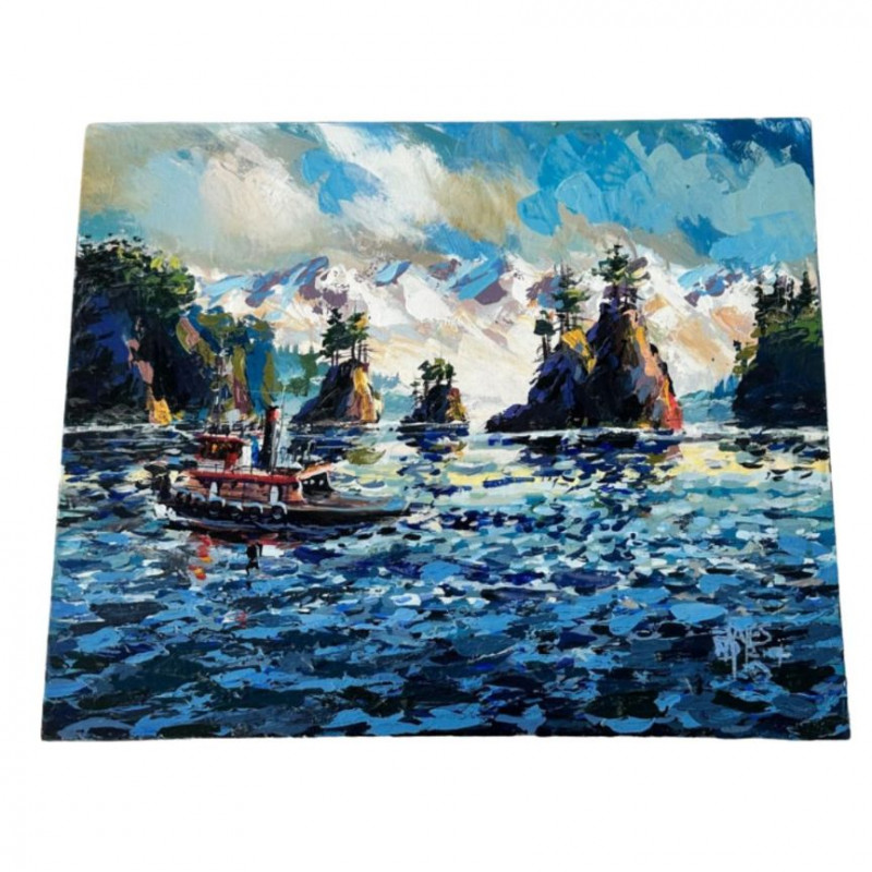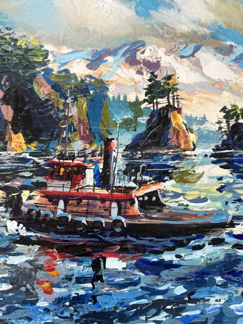 A vibrant coastal scene by Northwest artist Danny Mayes, this painting captures a working tugboat navigating the dynamic waters off Washington’s rugged shoreline. The vessel, with its bold red cabin, floats amid swirling blues and whites, framed by rocky islets and towering evergreens. Snow-capped mountains rise in the distance beneath a dramatic sky, evoking both the power and solitude of maritime life. Mayes’ expressive brushwork and vivid palette celebrate the rhythm of work and nature, blending realism with impressionistic energy. Danny Mayes is a Seattle-based painter known for his emotionally resonant depictions of Pacific Northwest life—street scenes, landscapes, and portraits of civil rights leaders and sports icons. A former boxer turned artist, he studied at the Burnley School of Commercial Art under Northwest master William Cumming. His preferred mediums are acrylic and watercolor, often applied with intuitive spontaneity and warmth. Mayes’ work has been collected by the Seattle Seahawks, Seattle Mariners, and numerous corporate collections, reflecting his deep connection to the region’s cultural and civic identity. His paintings have been exhibited at Kirsten Gallery and featured in local restaurants, galleries, and private homes throughout the Puget Sound.