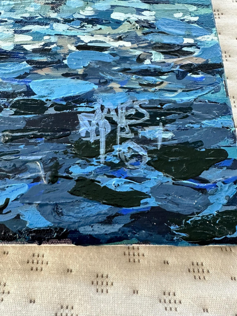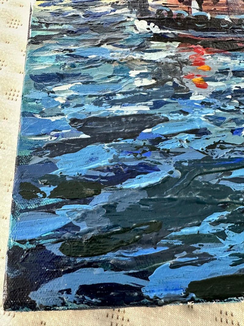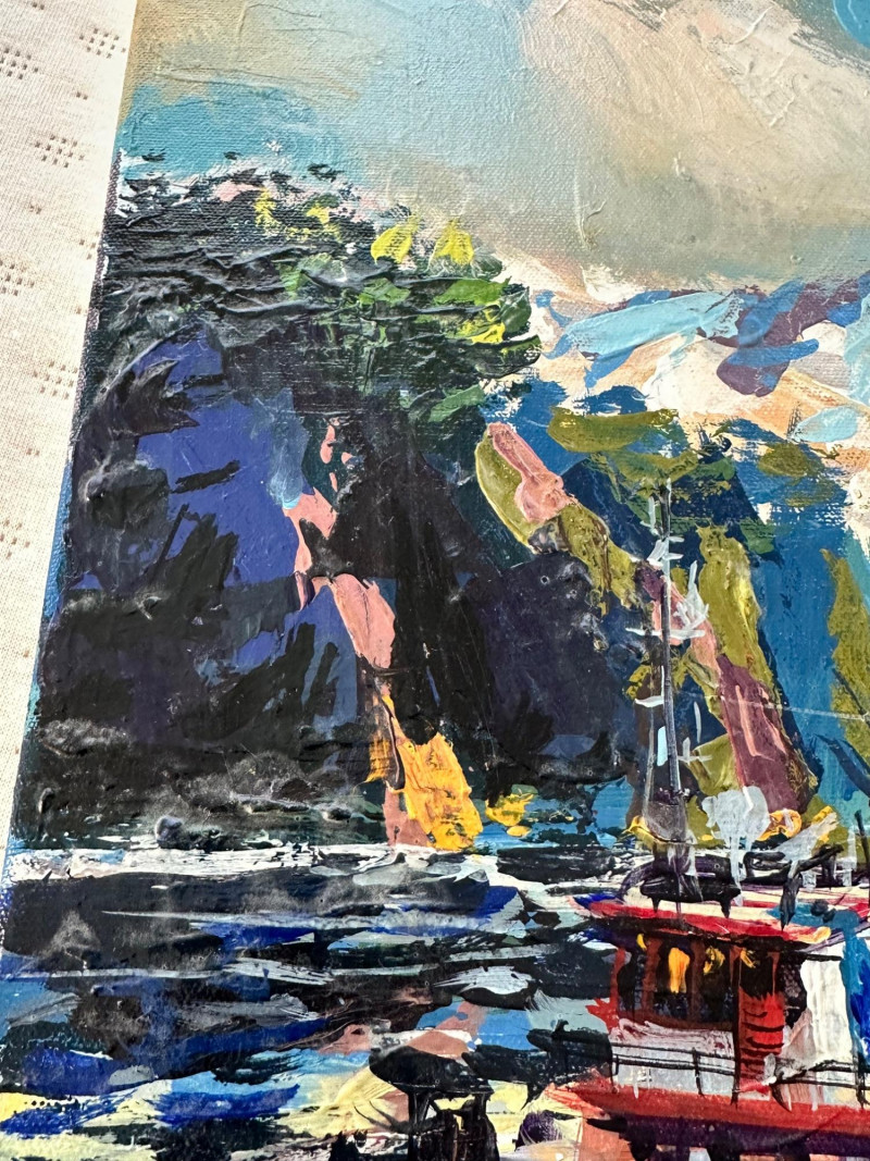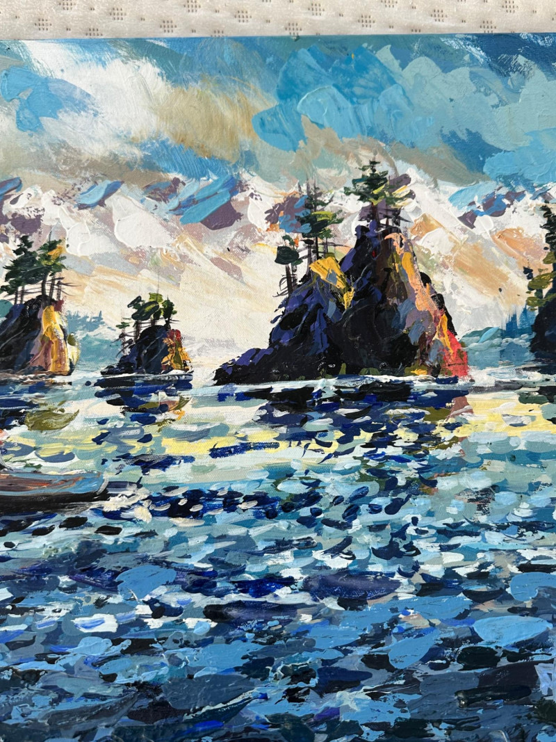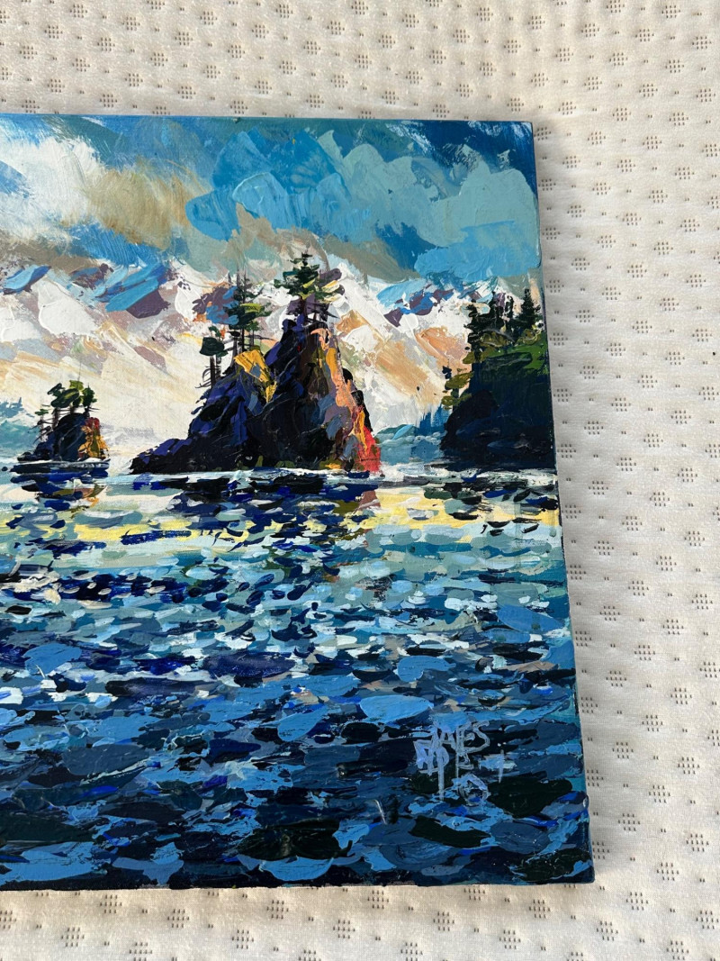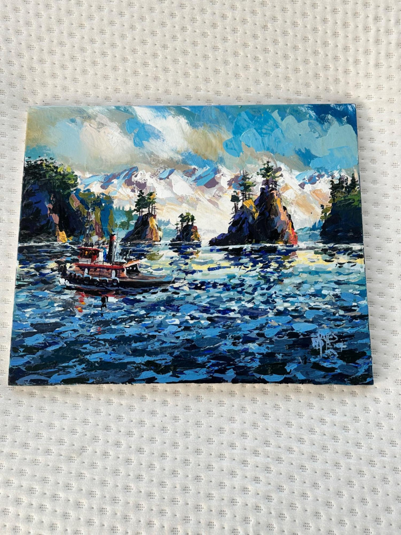 A vibrant coastal scene by Northwest artist Danny Mayes, this painting captures a working tugboat navigating the dynamic waters off Washington’s rugged shoreline. The vessel, with its bold red cabin, floats amid swirling blues and whites, framed by rocky islets and towering evergreens. Snow-capped mountains rise in the distance beneath a dramatic sky, evoking both the power and solitude of maritime life. Mayes’ expressive brushwork and vivid palette celebrate the rhythm of work and nature, blending realism with impressionistic energy. Danny Mayes is a Seattle-based painter known for his emotionally resonant depictions of Pacific Northwest life—street scenes, landscapes, and portraits of civil rights leaders and sports icons. A former boxer turned artist, he studied at the Burnley School of Commercial Art under Northwest master William Cumming. His preferred mediums are acrylic and watercolor, often applied with intuitive spontaneity and warmth. Mayes’ work has been collected by the Seattle Seahawks, Seattle Mariners, and numerous corporate collections, reflecting his deep connection to the region’s cultural and civic identity. His paintings have been exhibited at Kirsten Gallery and featured in local restaurants, galleries, and private homes throughout the Puget Sound.