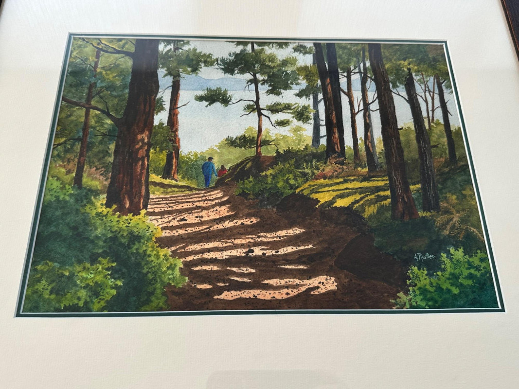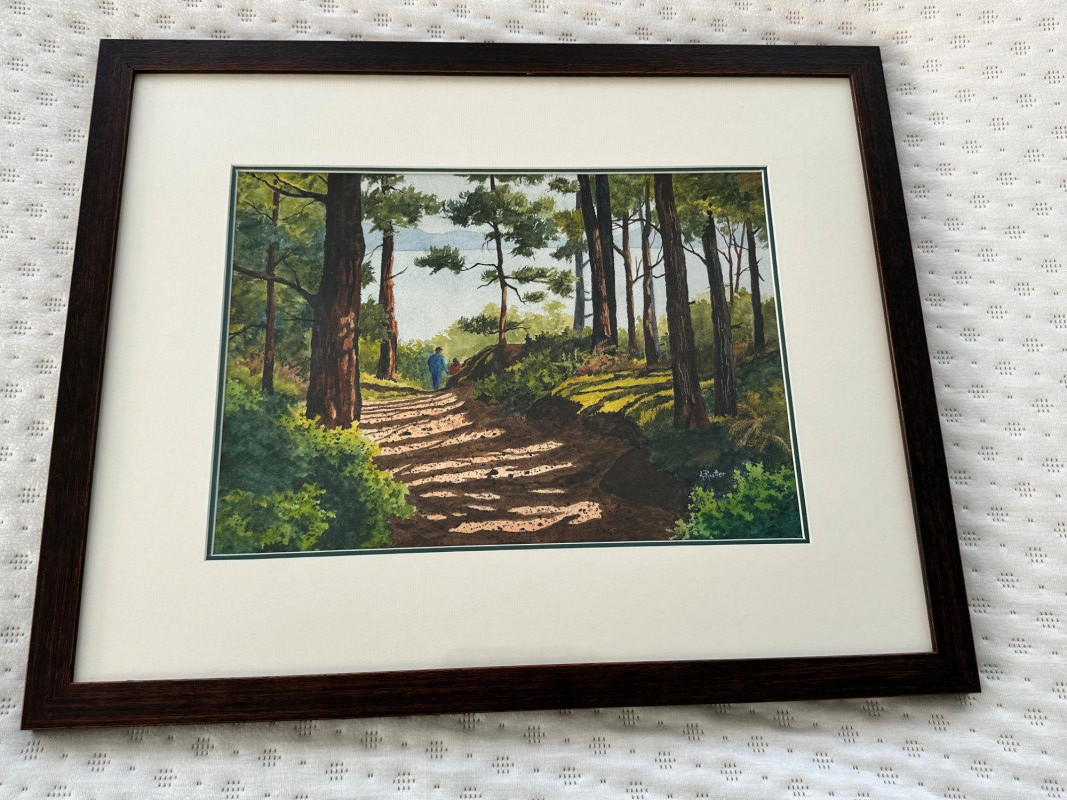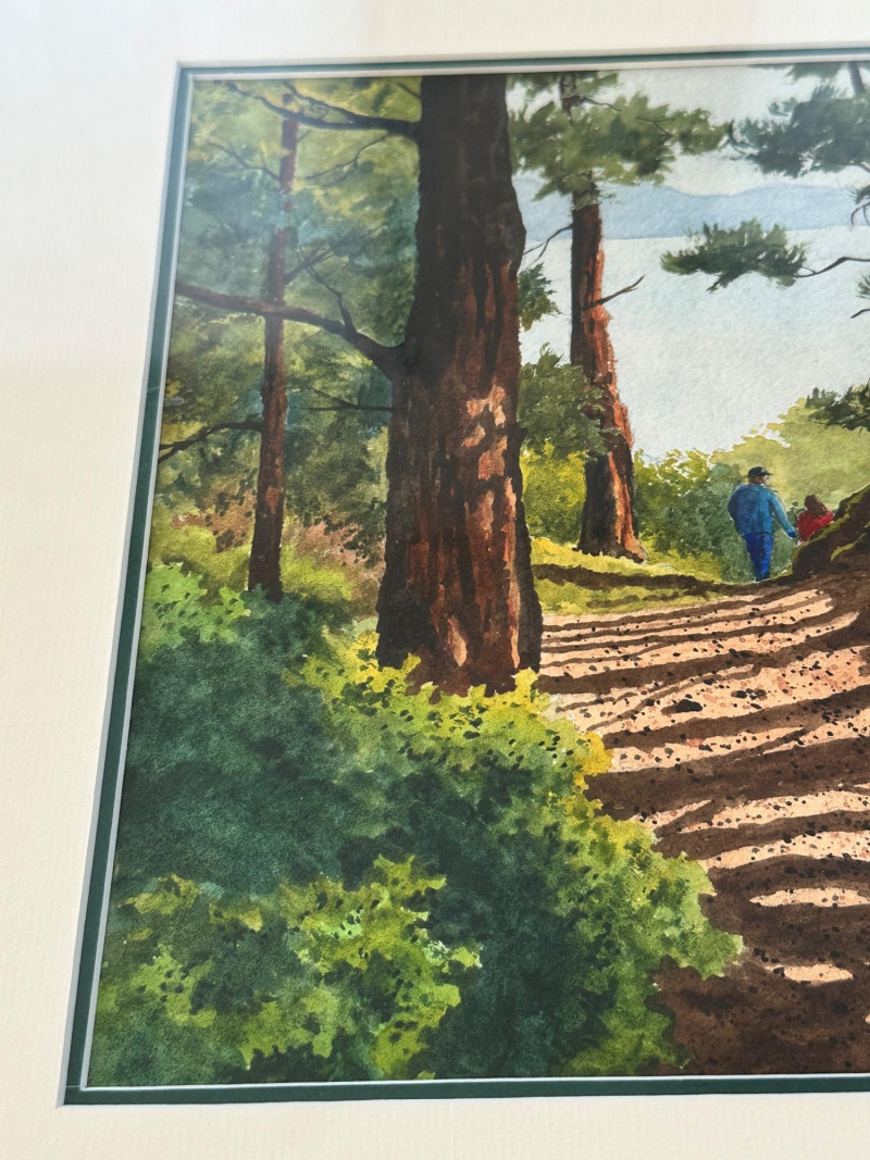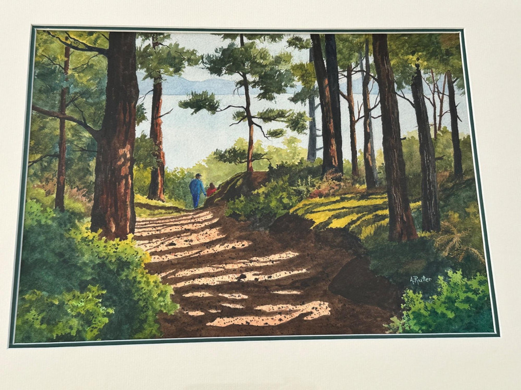 A peaceful forest path bathed in afternoon light, this watercolor by Washington artist Ann Rutter captures the quiet beauty of Lopez Island. Two distant figures walk beneath towering trees, their shadows stretching across the sun-dappled trail. Rutter’s brushwork balances realism with softness, using layered washes and warm earth tones to evoke the stillness and intimacy of a shared walk in nature. Ann Rutter (1933–2014) was a self-taught watercolorist based in Edmonds, Washington. Over a forty-year career, she became known for her Northwest landscapes—coastal scenes, island trails, and Skagit Valley farms—painted with sensitivity and grace. Her work was honored by the Seattle Boat Show and the Edmonds Art Festival, and is held in numerous corporate and private collections. Rutter began painting after taking a class at Edmonds Community College and developed a distinctive style rooted in place and memory