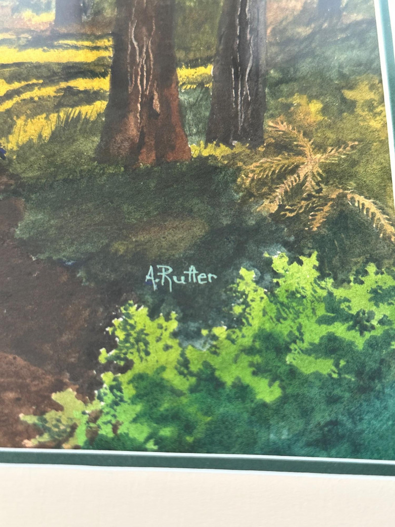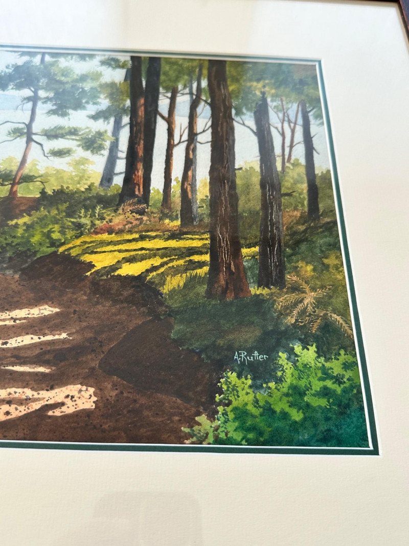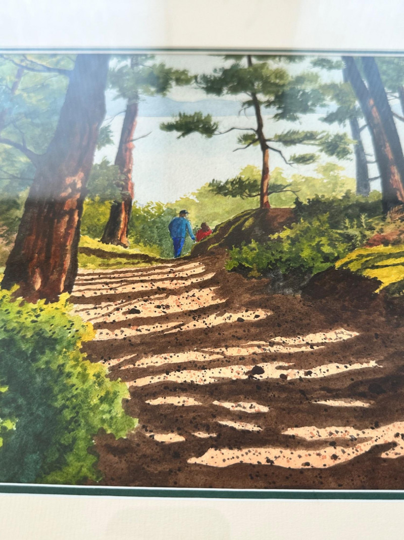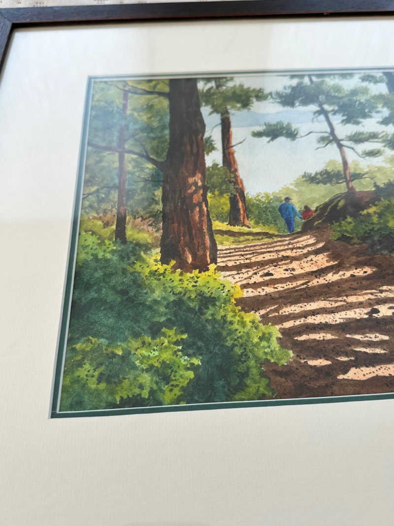 A peaceful forest path bathed in afternoon light, this watercolor by Washington artist Ann Rutter captures the quiet beauty of Lopez Island. Two distant figures walk beneath towering trees, their shadows stretching across the sun-dappled trail. Rutter’s brushwork balances realism with softness, using layered washes and warm earth tones to evoke the stillness and intimacy of a shared walk in nature. Ann Rutter (1933–2014) was a self-taught watercolorist based in Edmonds, Washington. Over a forty-year career, she became known for her Northwest landscapes—coastal scenes, island trails, and Skagit Valley farms—painted with sensitivity and grace. Her work was honored by the Seattle Boat Show and the Edmonds Art Festival, and is held in numerous corporate and private collections. Rutter began painting after taking a class at Edmonds Community College and developed a distinctive style rooted in place and memory
