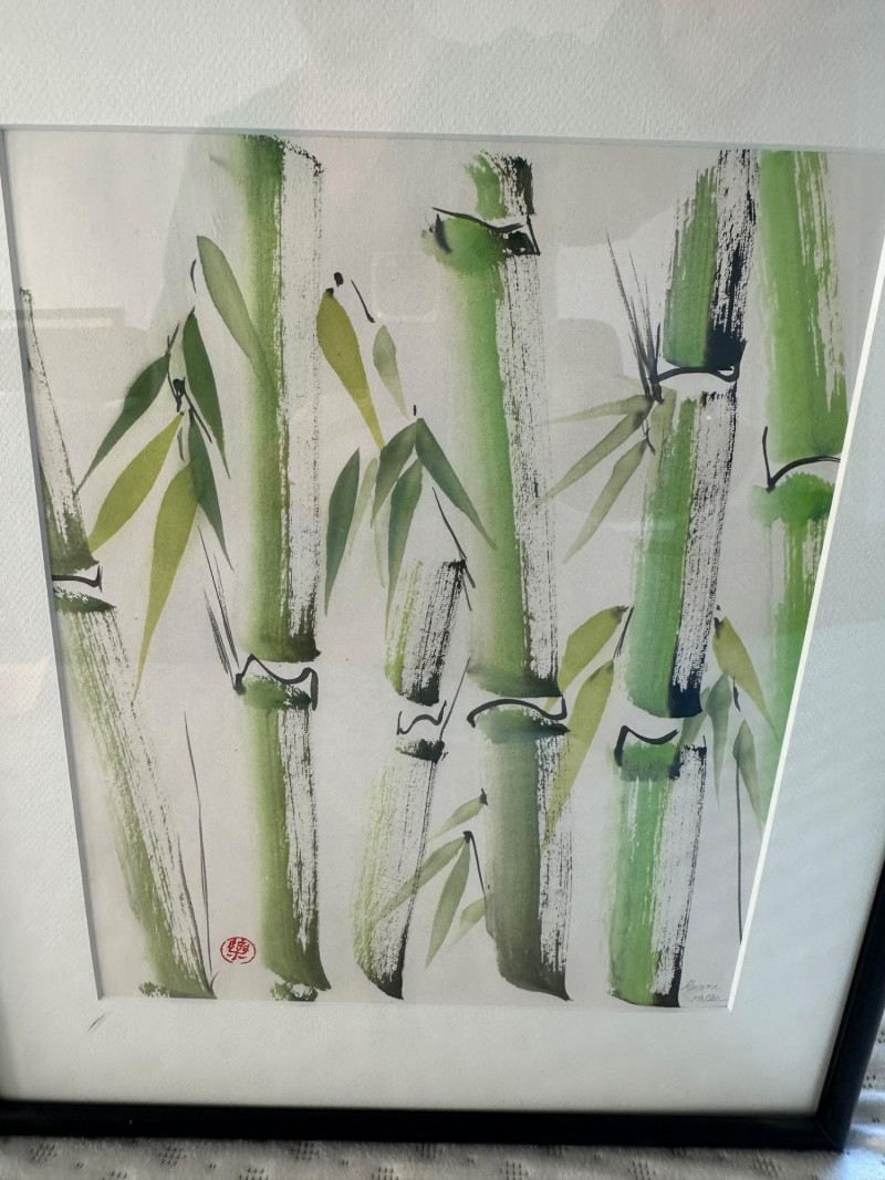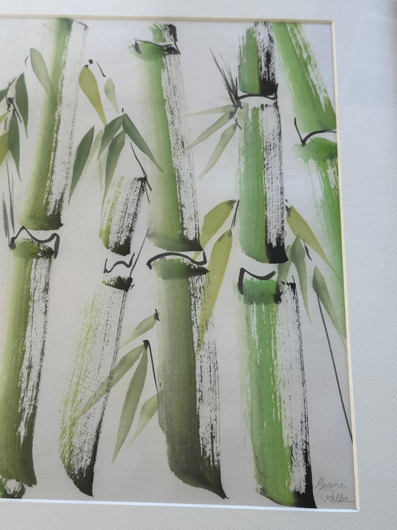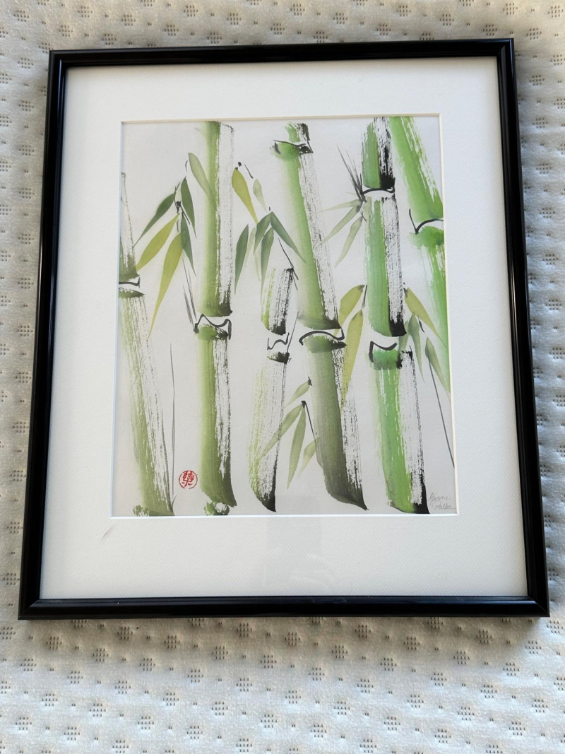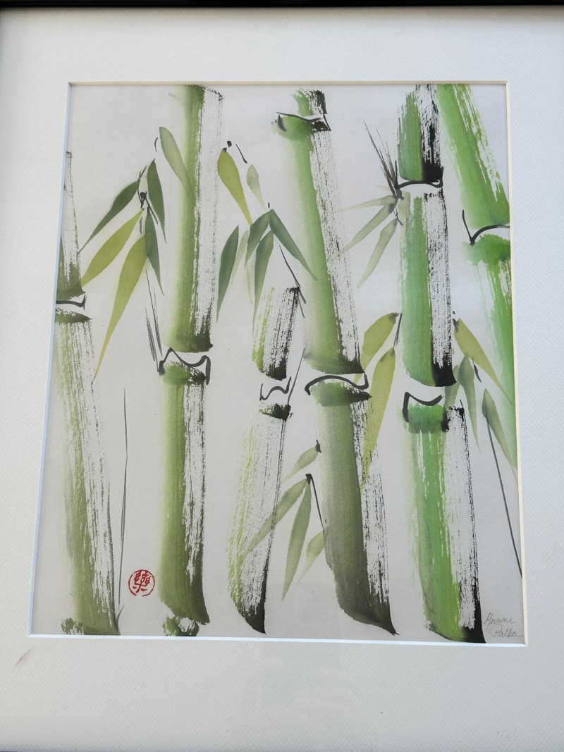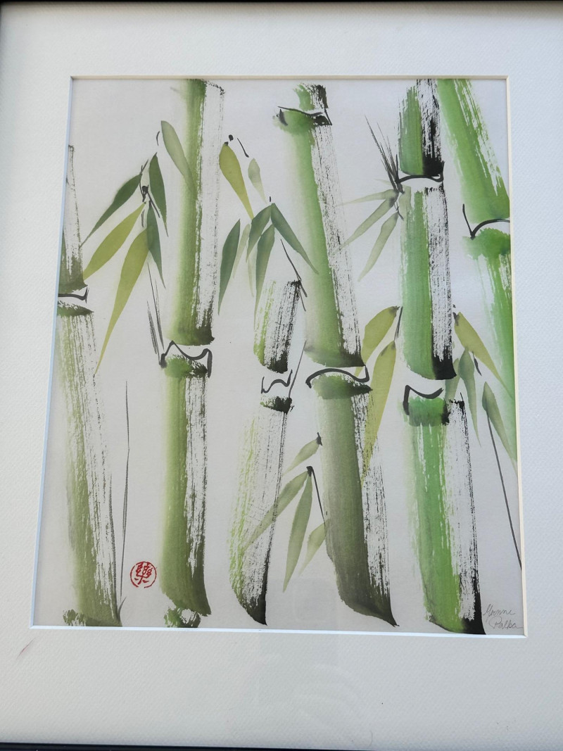 A graceful composition in the East Asian brush painting tradition, this work by Yvonne Palka features vibrant green bamboo stalks and leaves rendered in expressive sumi ink and color. The vertical rhythm of the stalks is softened by fluid brushwork and delicate tonal variation, evoking both strength and serenity. A red seal stamp and handwritten signature anchor the piece in tradition, while the museum quality framing on clean matting and black frame offer a contemporary presentation. Yvonne Palka was a Seattle-area artist and educator whose work blended spiritual reflection, nature reverence, and East Asian aesthetics. She authored Super Simple Sumi-e: Easy Asian Brush Painting for All Ages and illustrated several award-winning books, including The Brush Dances & the Light Sings, a collaborative tribute to her life and art. Her paintings often explore the quiet power of nature—bamboo, dragons, and coastal landscapes—through meditative brushwork and poetic simplicity. Palka lived in Langley, Washington, and taught at Antioch University Seattle for over two decades