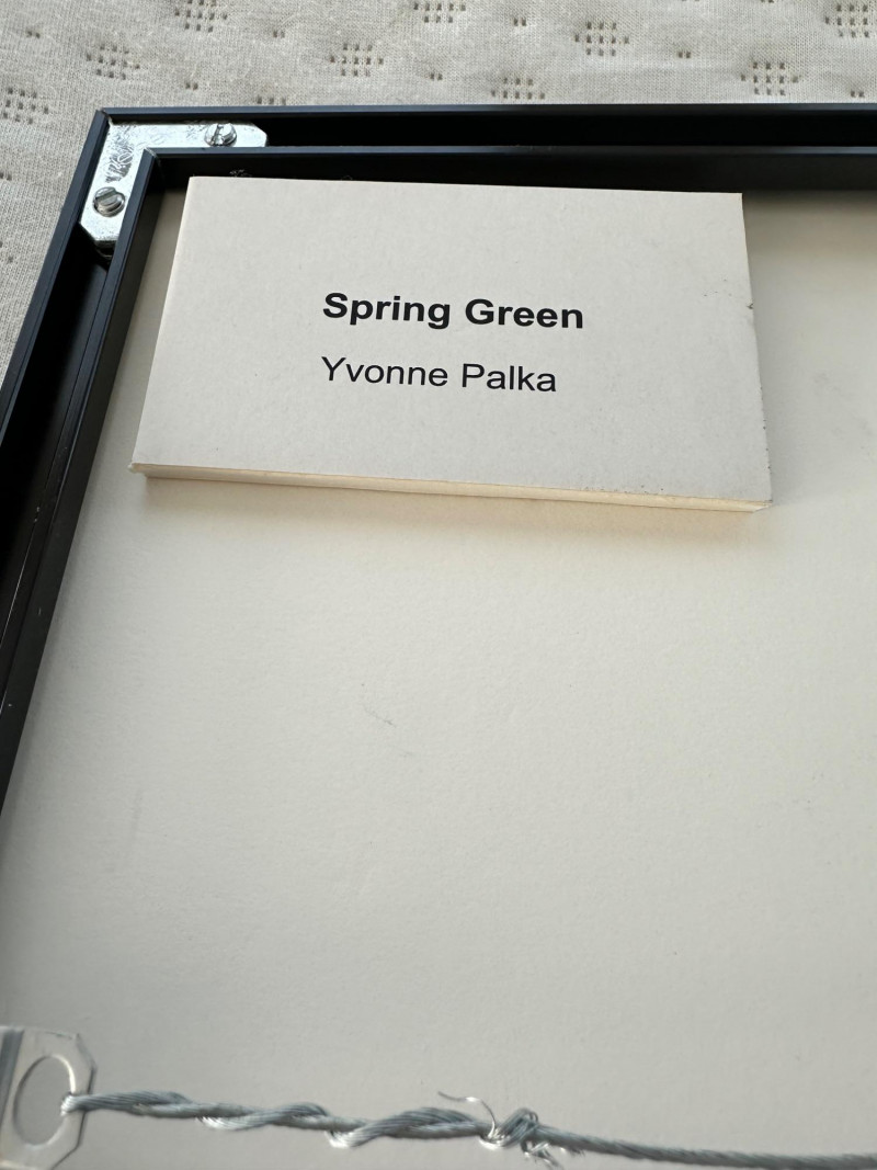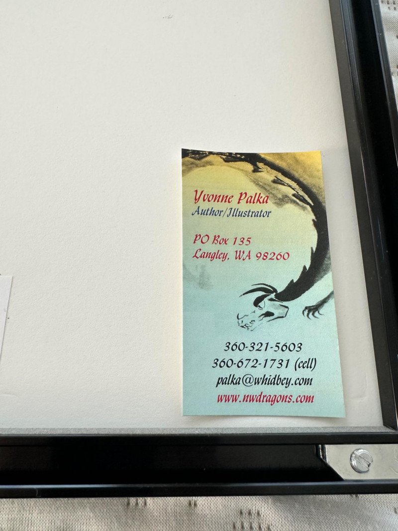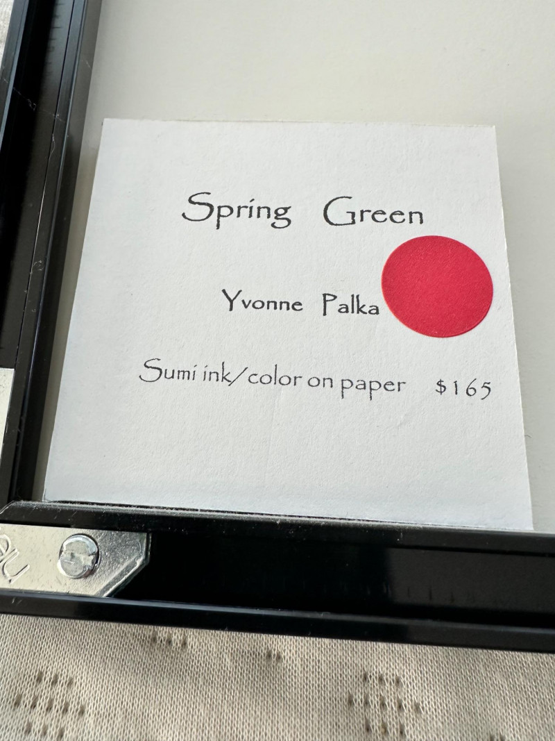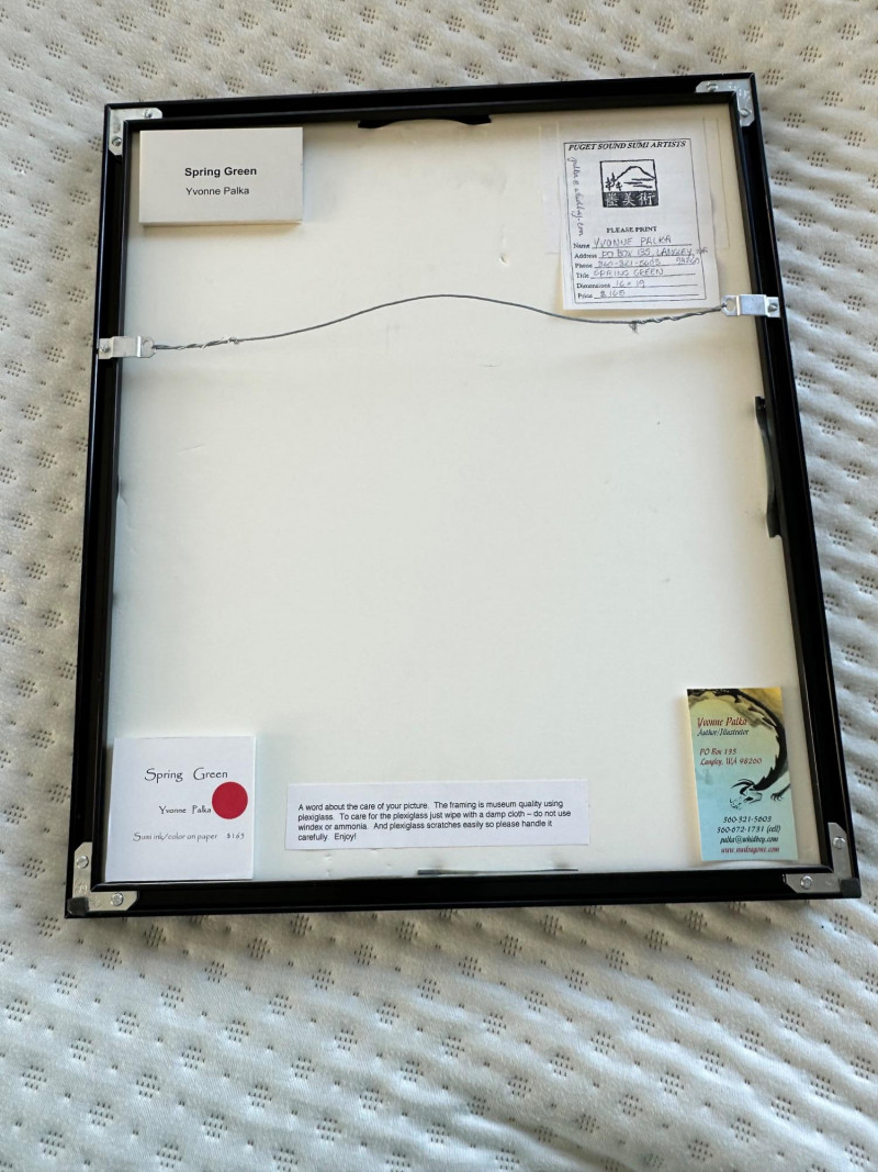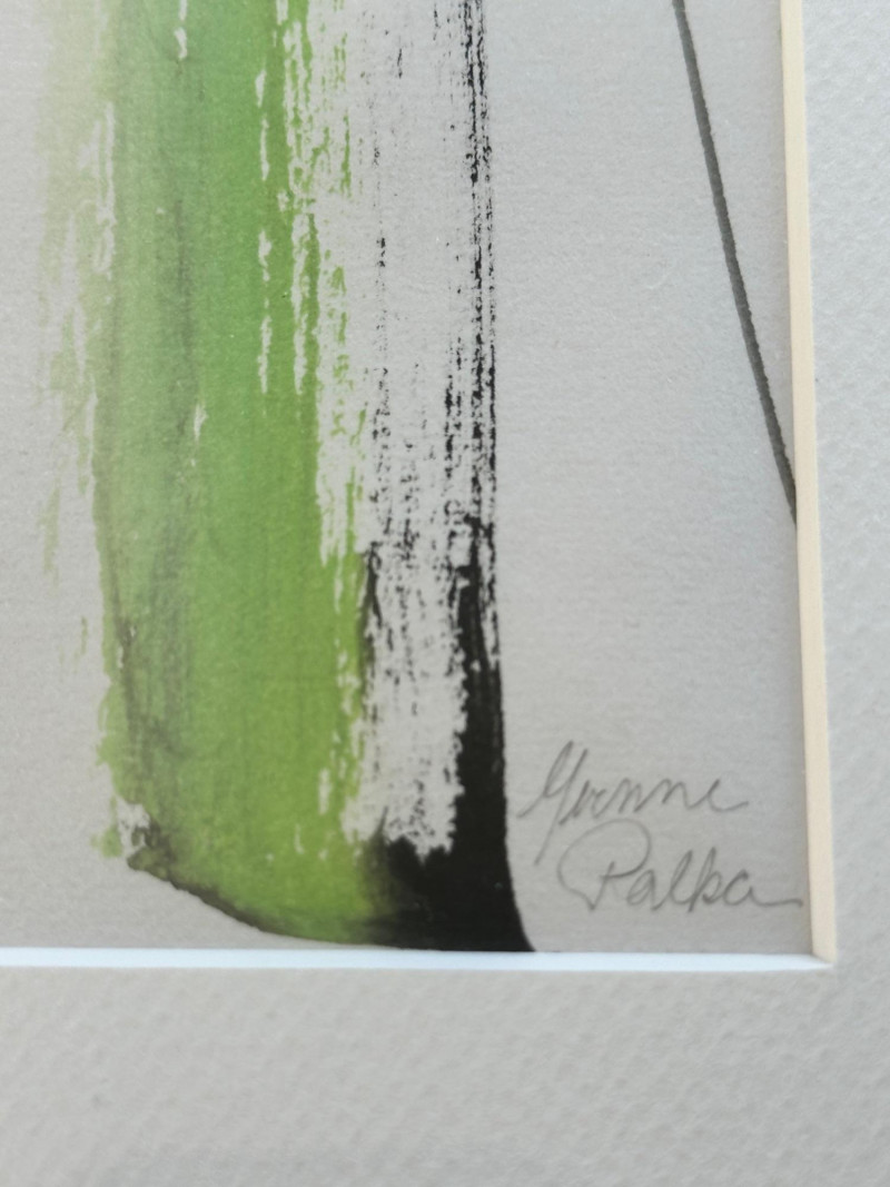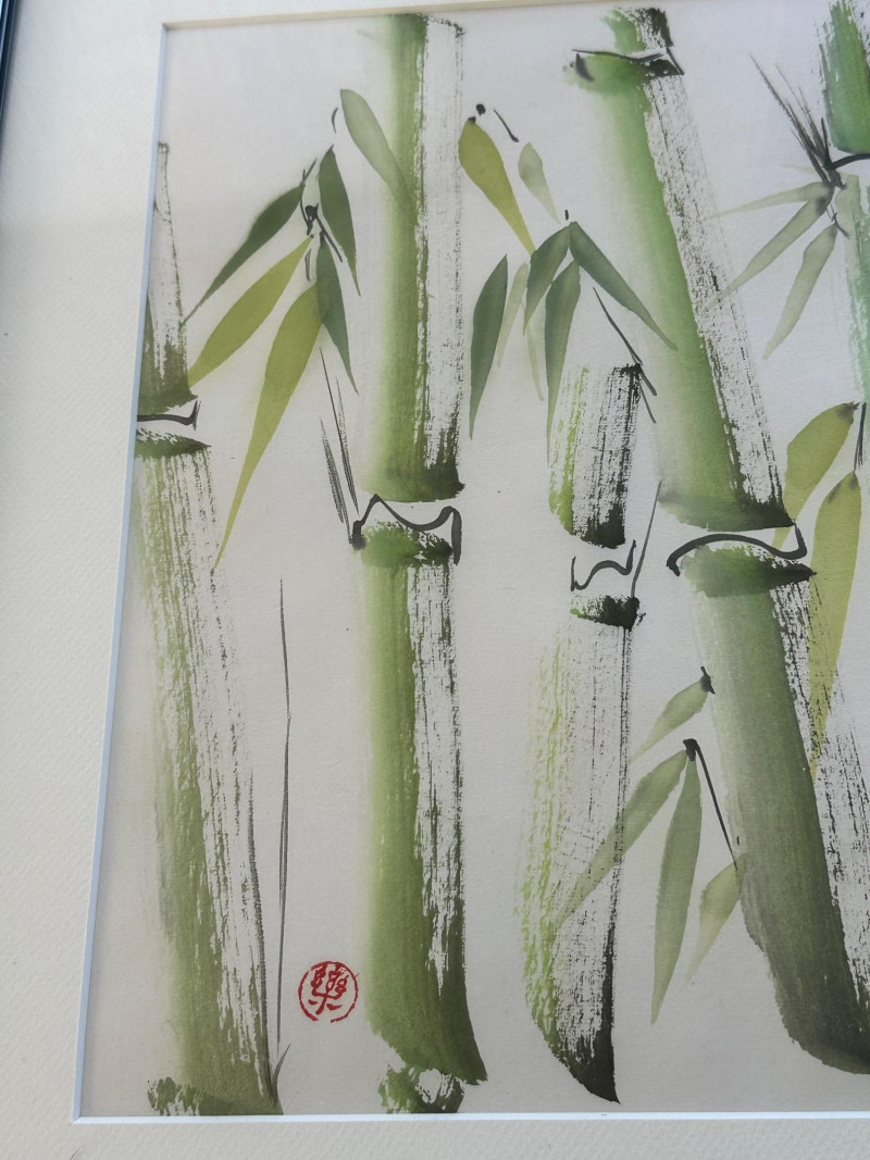 A graceful composition in the East Asian brush painting tradition, this work by Yvonne Palka features vibrant green bamboo stalks and leaves rendered in expressive sumi ink and color. The vertical rhythm of the stalks is softened by fluid brushwork and delicate tonal variation, evoking both strength and serenity. A red seal stamp and handwritten signature anchor the piece in tradition, while the museum quality framing on clean matting and black frame offer a contemporary presentation. Yvonne Palka was a Seattle-area artist and educator whose work blended spiritual reflection, nature reverence, and East Asian aesthetics. She authored Super Simple Sumi-e: Easy Asian Brush Painting for All Ages and illustrated several award-winning books, including The Brush Dances & the Light Sings, a collaborative tribute to her life and art. Her paintings often explore the quiet power of nature—bamboo, dragons, and coastal landscapes—through meditative brushwork and poetic simplicity. Palka lived in Langley, Washington, and taught at Antioch University Seattle for over two decades