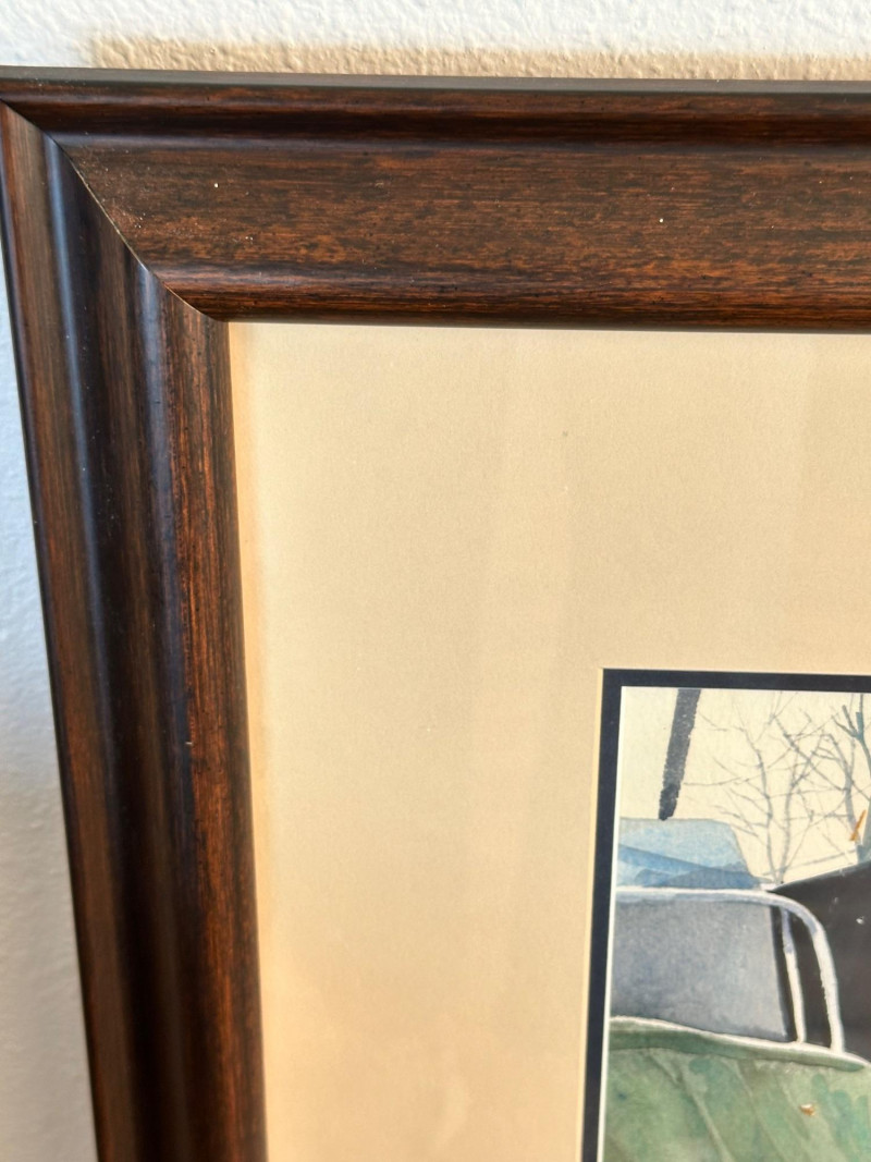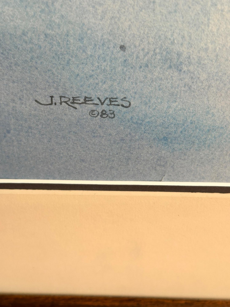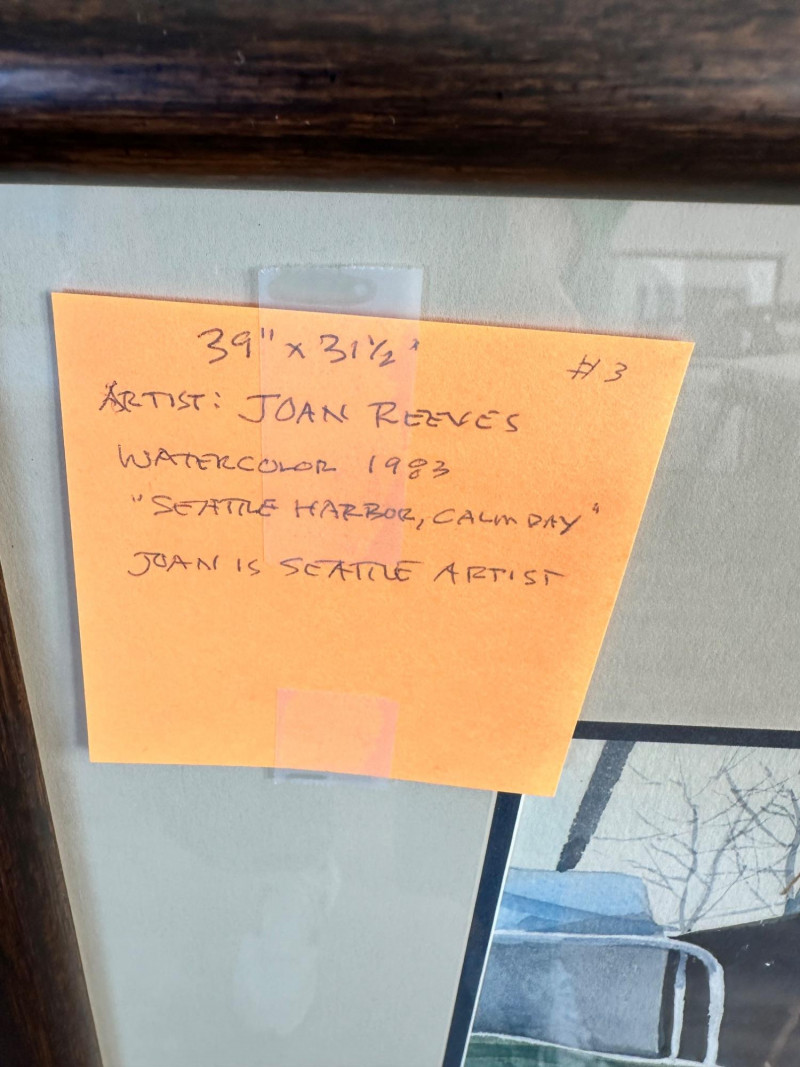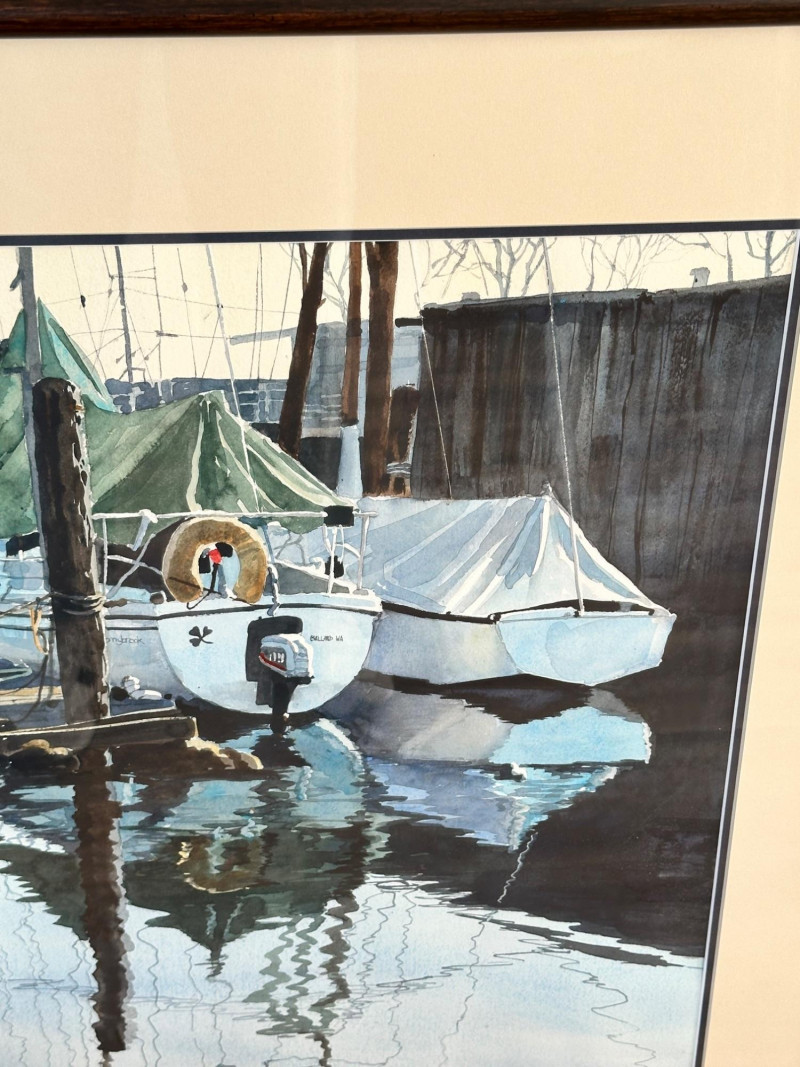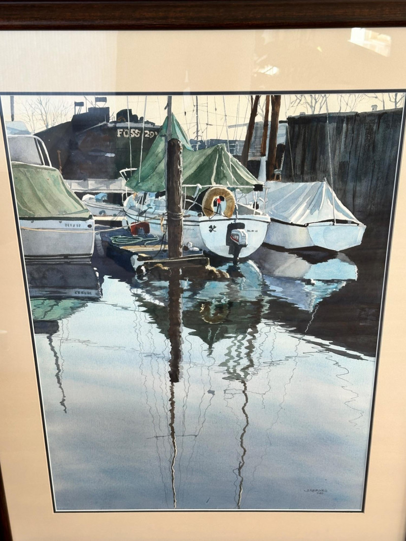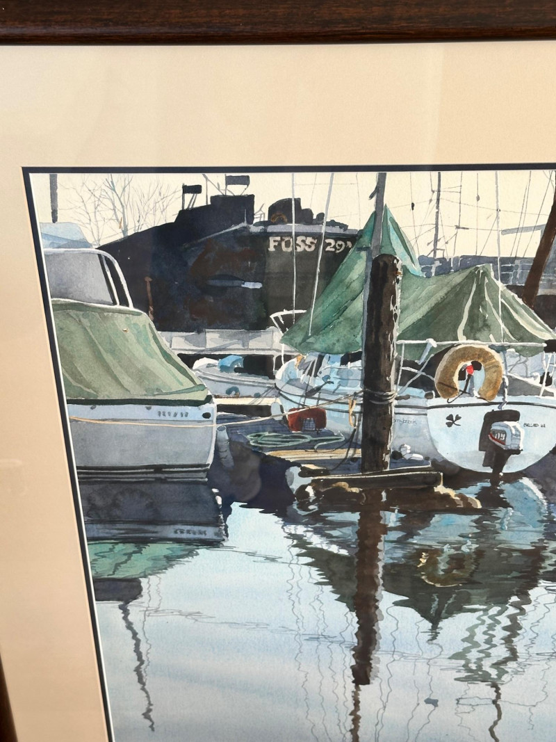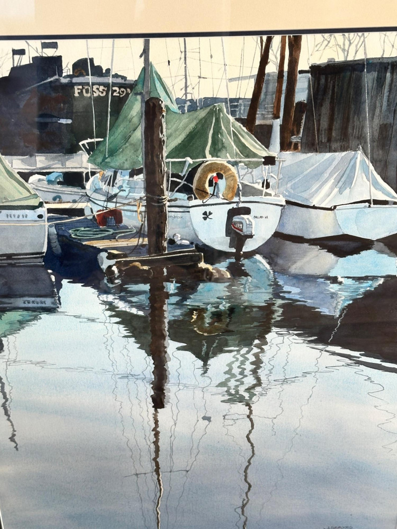 A tranquil harbor scene rendered in soft watercolor by Seattle artist Joan Reeves. Painted in 1983, this work captures the quiet rhythm of docked boats and their mirrored reflections on still water. The vessel “FOSS 29” anchors the composition, framed by green and white tarps and subtle dockside textures. Reeves’ delicate brushwork and muted palette evoke the serenity of a calm day on Seattle’s waterfront, offering a timeless glimpse into maritime life. Joan Reeves is a longtime Seattle-based artist known for her sensitive interpretations of Pacific Northwest landscapes and urban scenes. This piece reflects her signature blend of realism and atmosphere, honoring the quiet beauty of everyday moments.