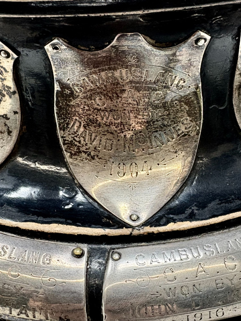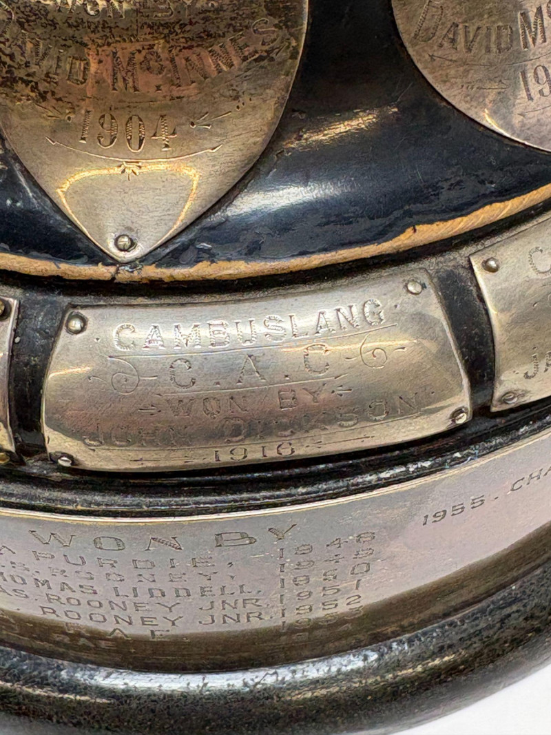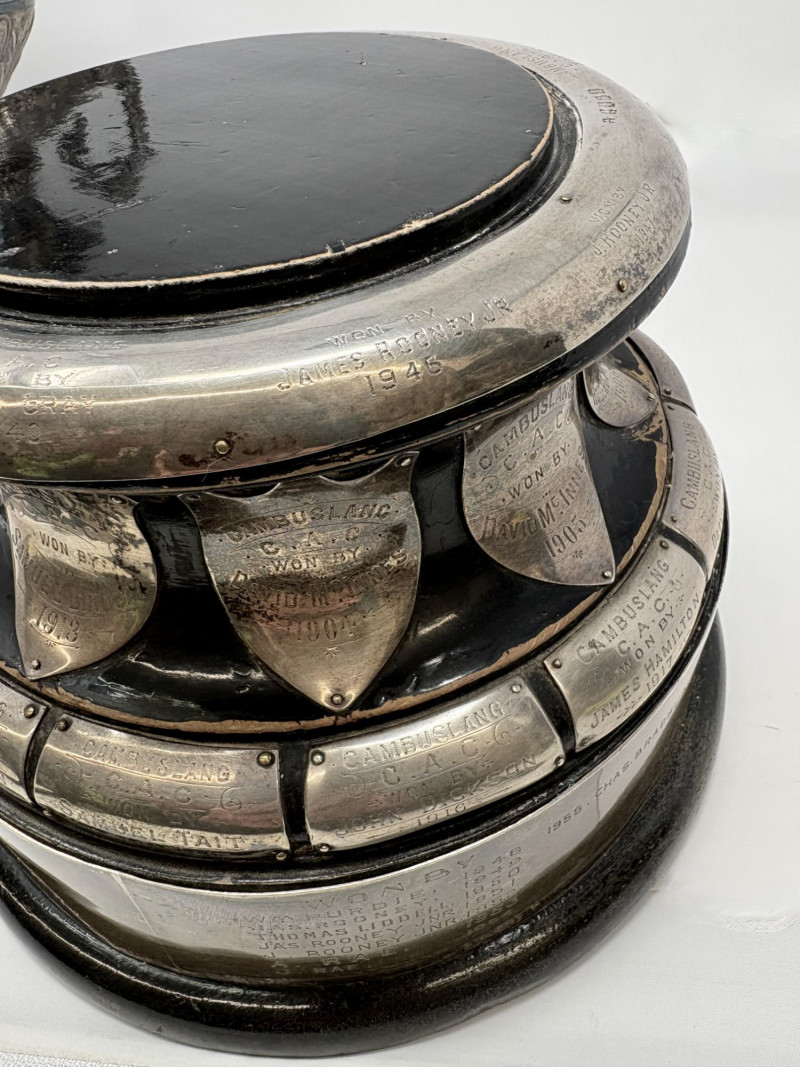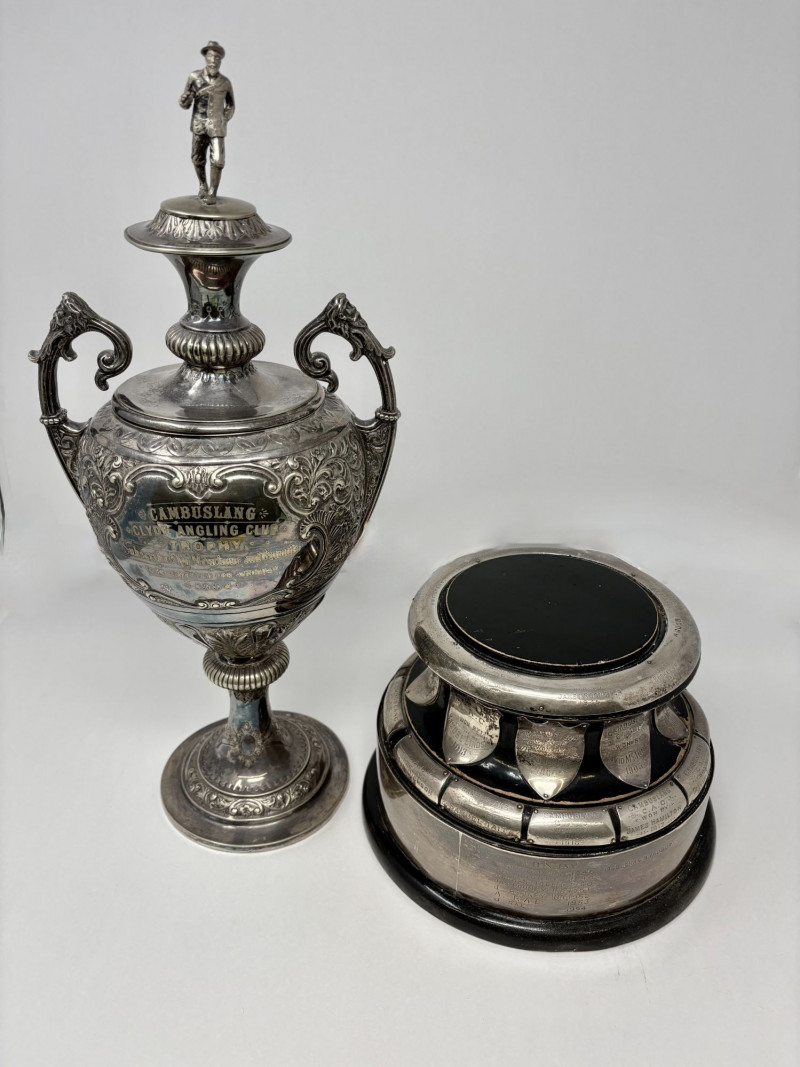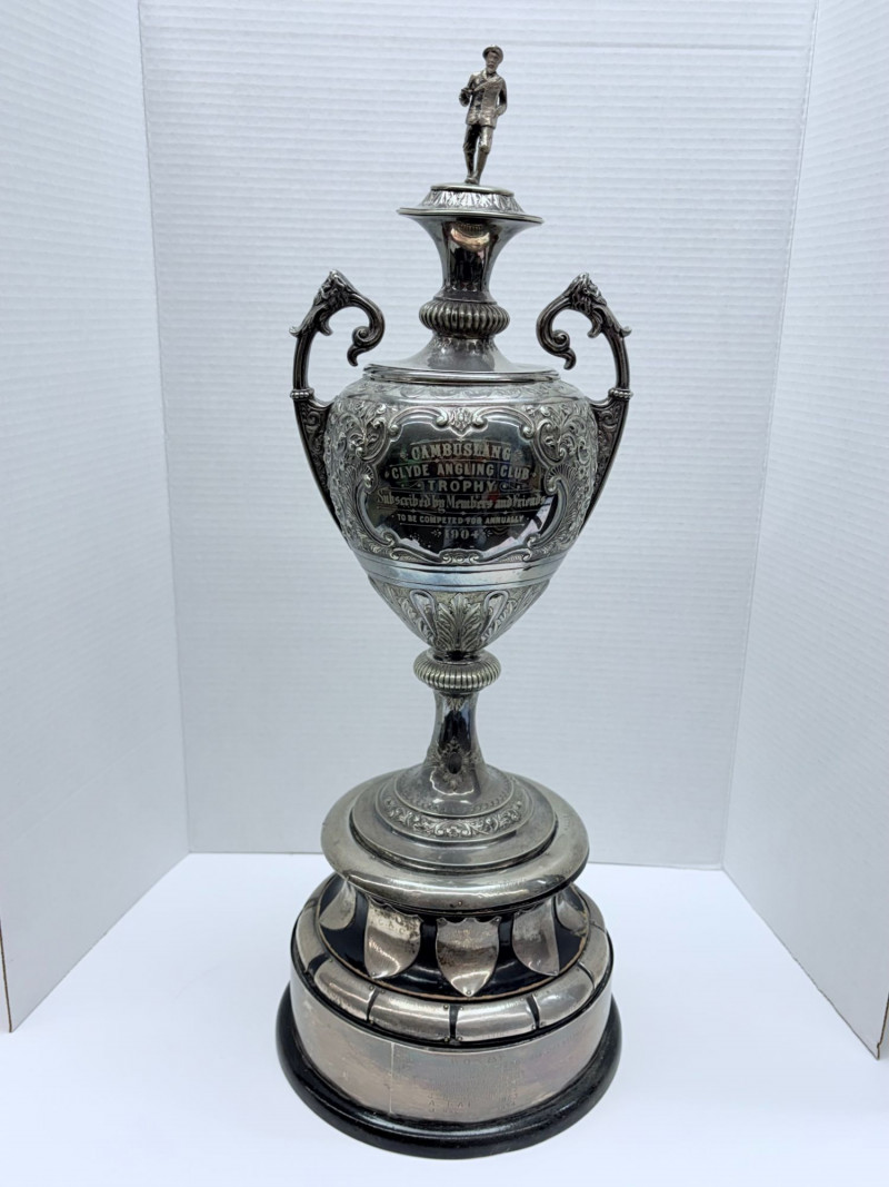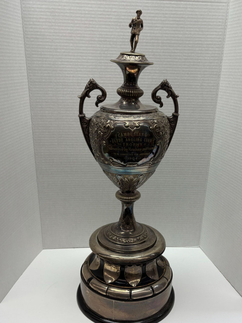 Cambuslang Clyde Angling Club Trophy is a rare and historically significant piece. Rich patina and detailed craftsmanship highlight its early 20th‑century Scottish origins. Inscribed by members and friends to be competed for annually since 1906. A flared cup with ornate scroll handles, a stepped base, and a finely sculpted angler mounted on the lid. These silver‑tone plates and shields feature hand‑engraved names, dates, and club identifiers, offering a rare glimpse into sporting and community traditions spanning more than fifty years. This piece show age‑appropriate wear, patina, and surface marks consistent with their age and use. Engravings range from crisp to partially worn, adding to their authentic historical character. Ideal for collectors of antique trophies, historical sporting memorabilia, or those interested in Cambuslang C.A.C. and early 20th‑century club competitions. These plates present beautifully in a display case or shadowbox. This trophy was purchased at a museum quality antique gallery in Edinburgh.