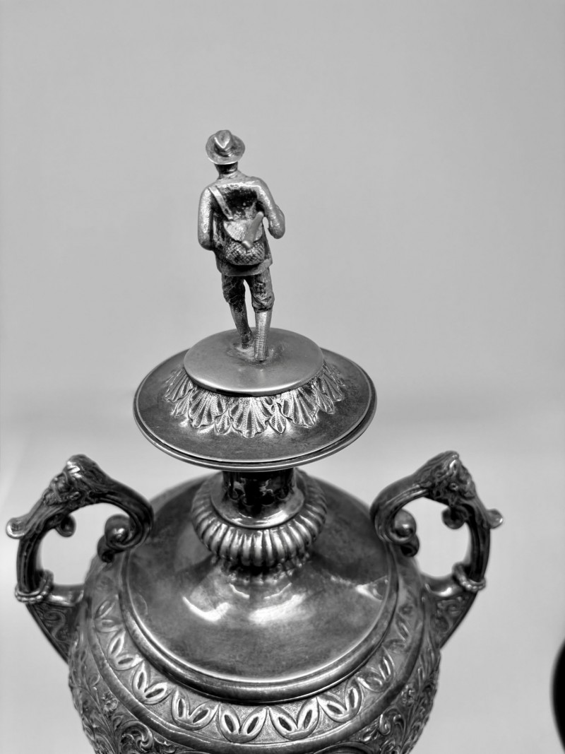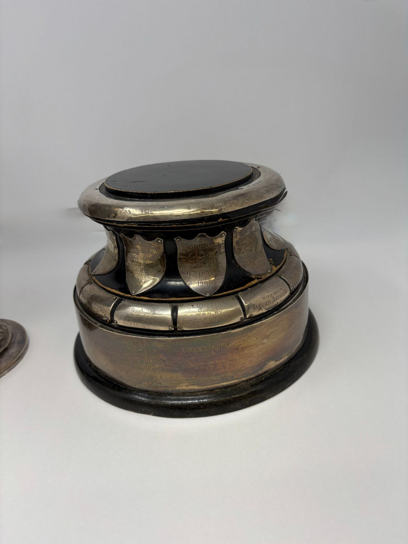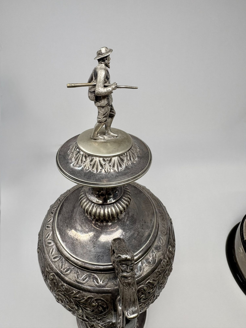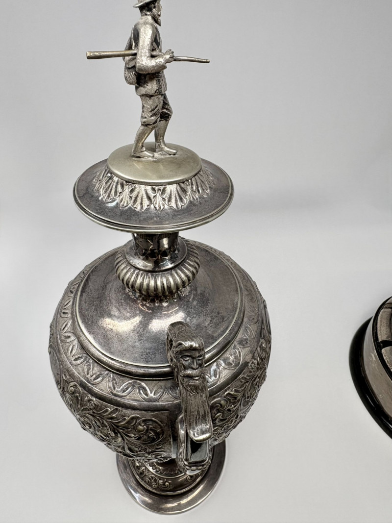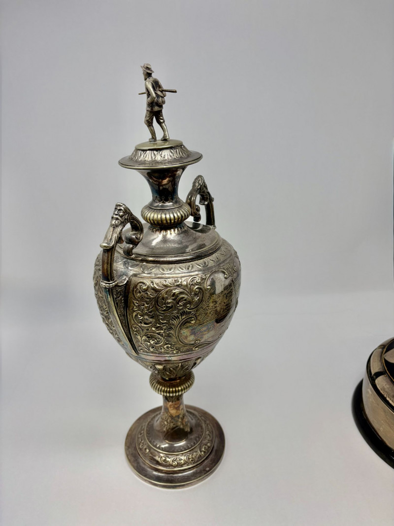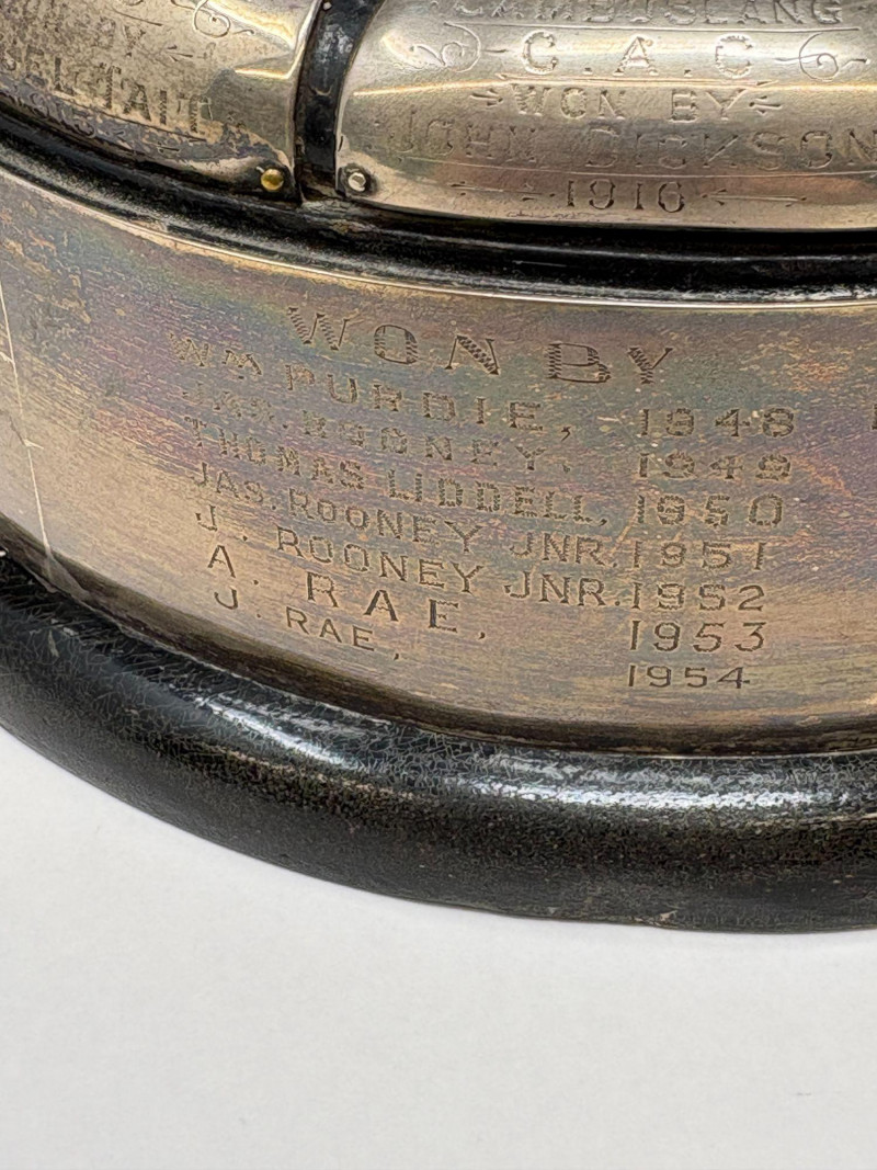Cambuslang Clyde Angling Club Trophy is a rare and historically significant piece. Rich patina and detailed craftsmanship highlight its early 20th‑century Scottish origins. Inscribed by members and friends to be competed for annually since 1906. A flared cup with ornate scroll handles, a stepped base, and a finely sculpted angler mounted on the lid. These silver‑tone plates and shields feature hand‑engraved names, dates, and club identifiers, offering a rare glimpse into sporting and community traditions spanning more than fifty years. This piece show age‑appropriate wear, patina, and surface marks consistent with their age and use. Engravings range from crisp to partially worn, adding to their authentic historical character. Ideal for collectors of antique trophies, historical sporting memorabilia, or those interested in Cambuslang C.A.C. and early 20th‑century club competitions. These plates present beautifully in a display case or shadowbox. This trophy was purchased at a museum quality antique gallery in Edinburgh.