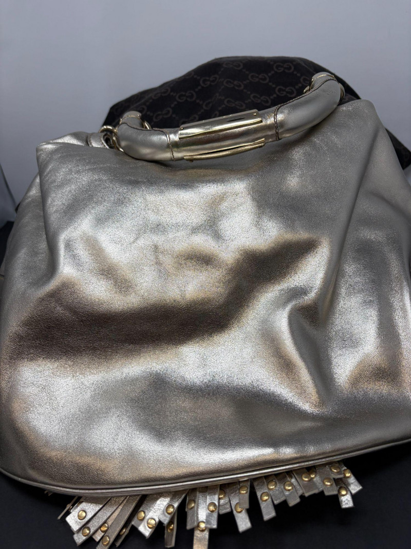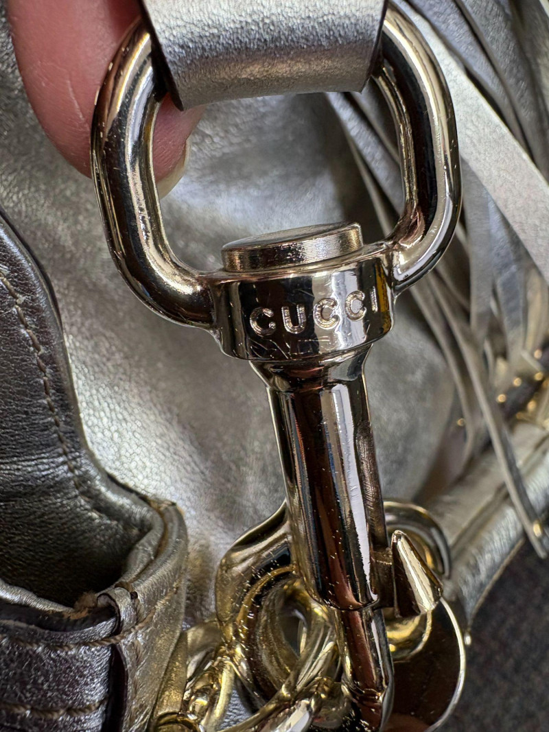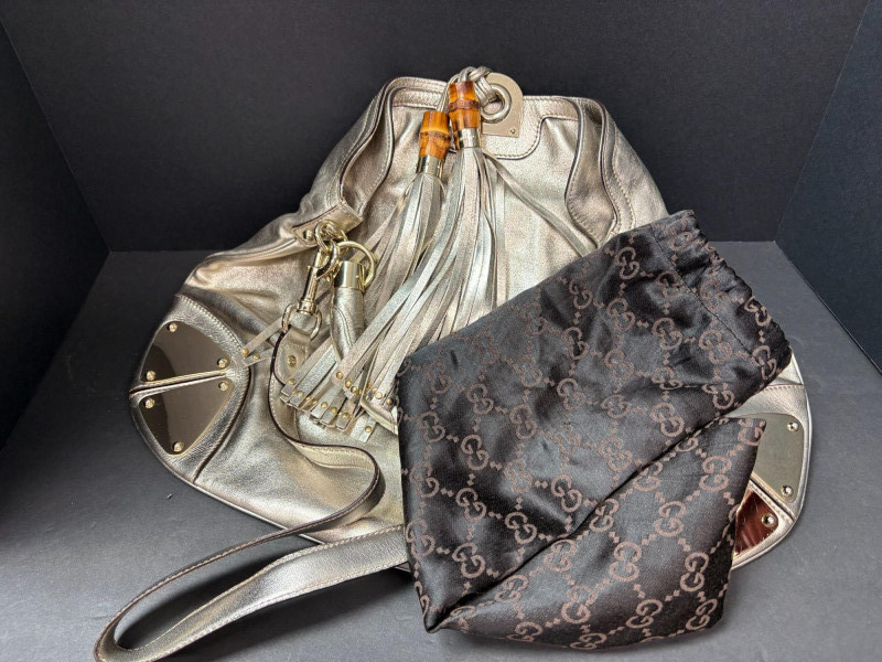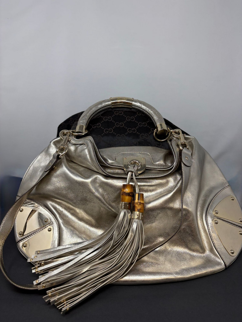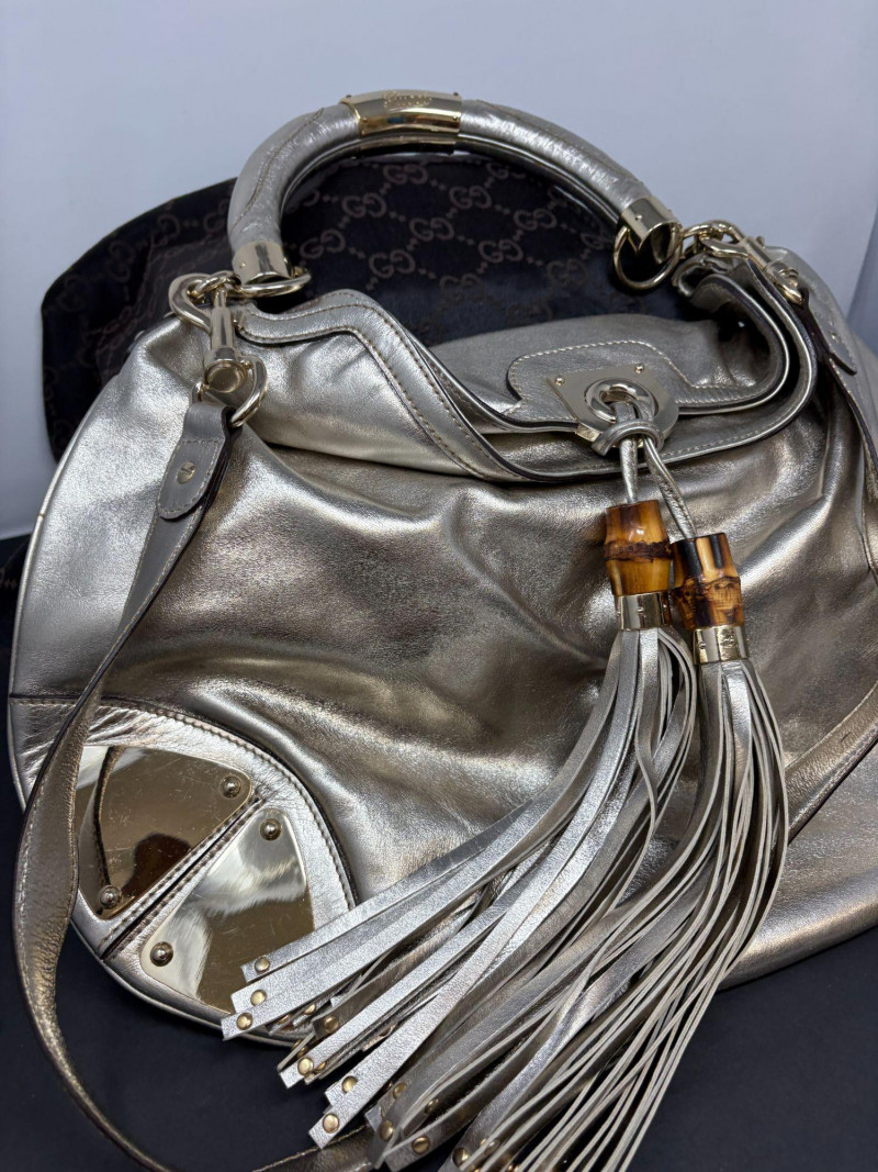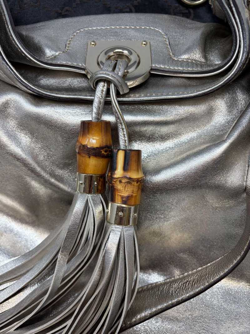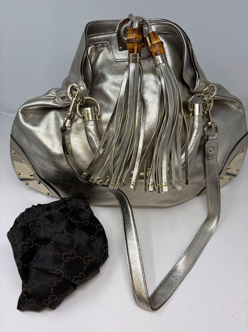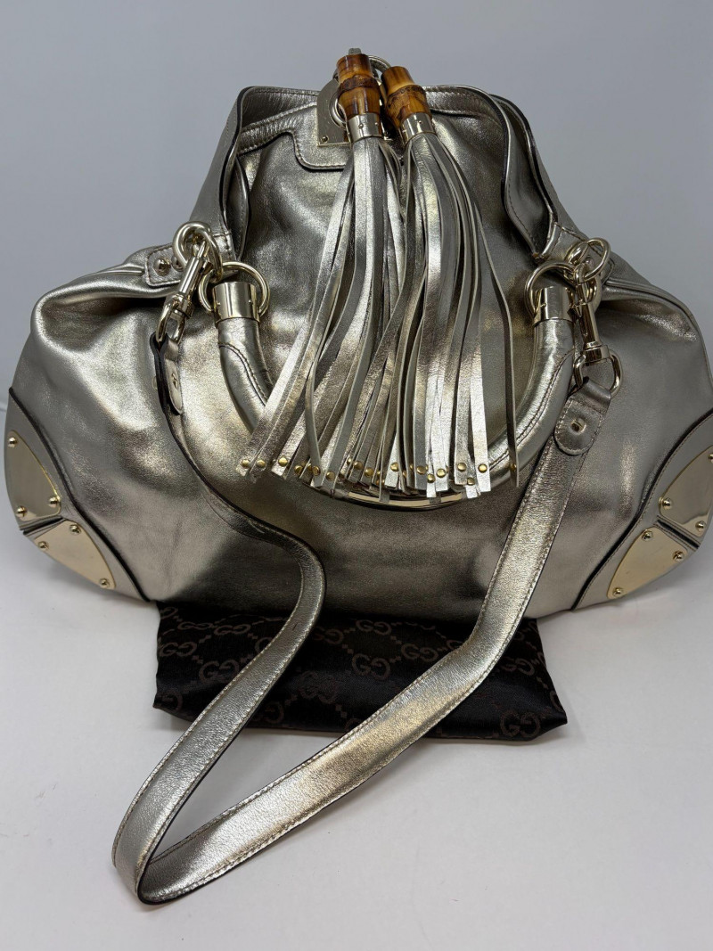 Gucci designer handbags for women embody refined elegance and enduring craftsmanship, Factory code #177088/203998. Crafted from luxurious silver metalic leather. This stunning bag is adorned with distinctive bamboo accents and stylish tassels that bring a touch of sophistication to any outfit. Exterior: Very Good – the leather remains in excellent shape with only minor black marks and slight signs of wear on the handle. Interior: Very Good – clean and well-maintained with minimal signs of use. Handle: 5" drop for easy carrying. Shoulder Strap: 16" drop for versatile shoulder or crossbody wear. Dust bag included *Please note the photo showing the slight wear on the shoulder strap.