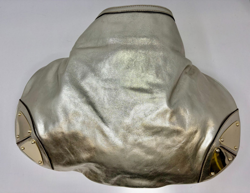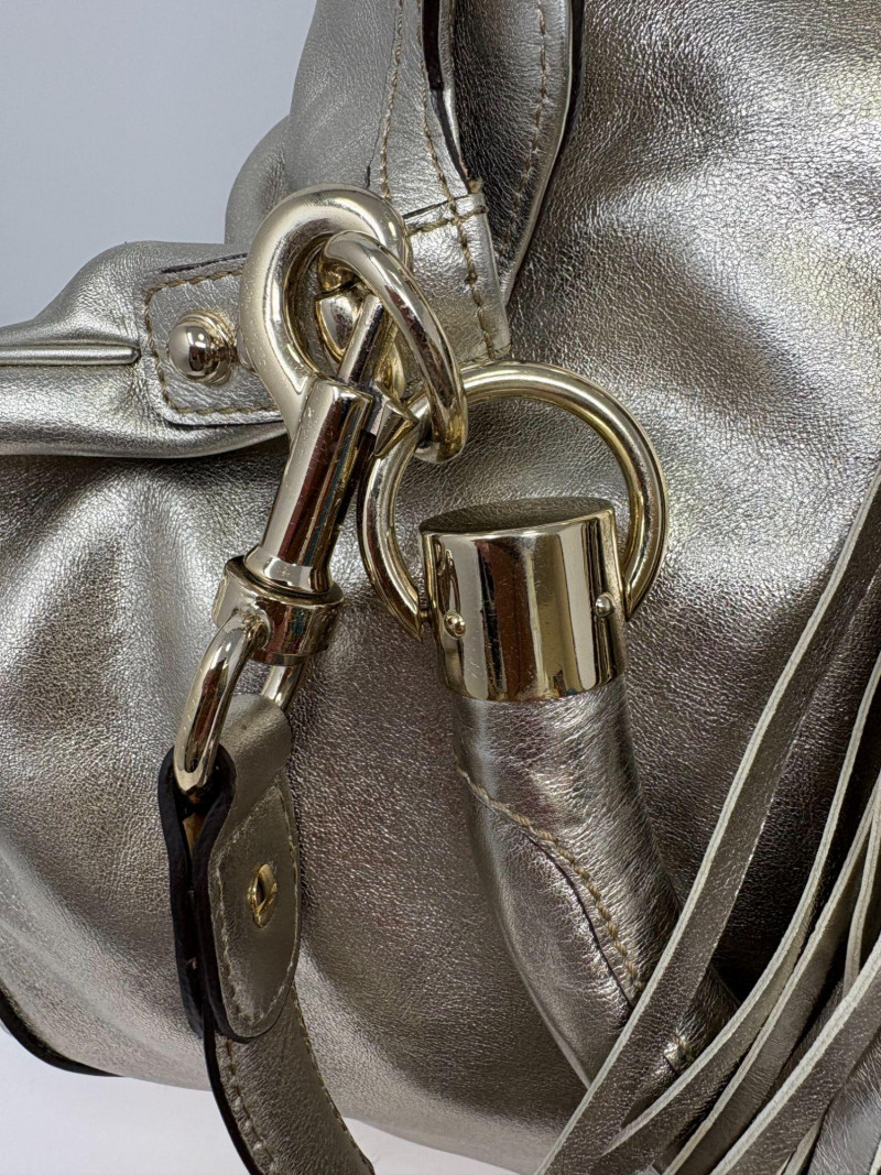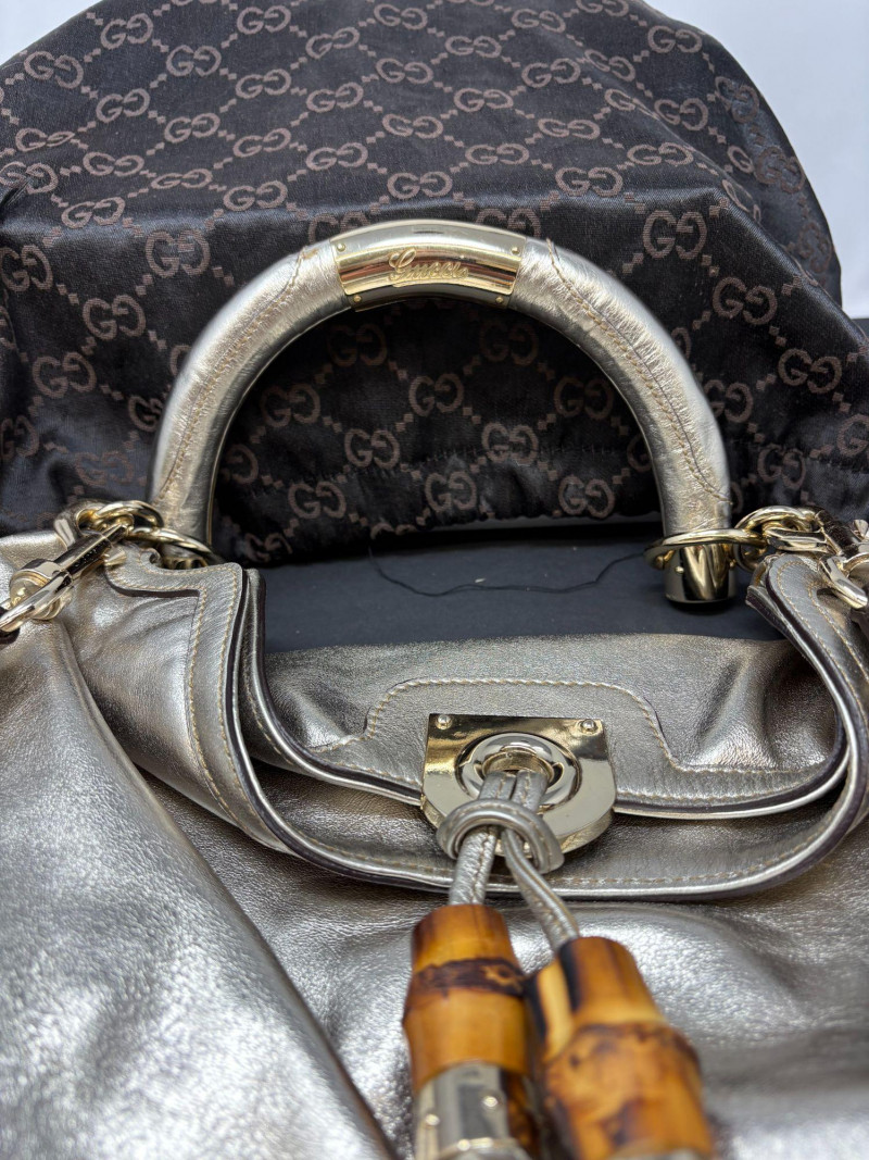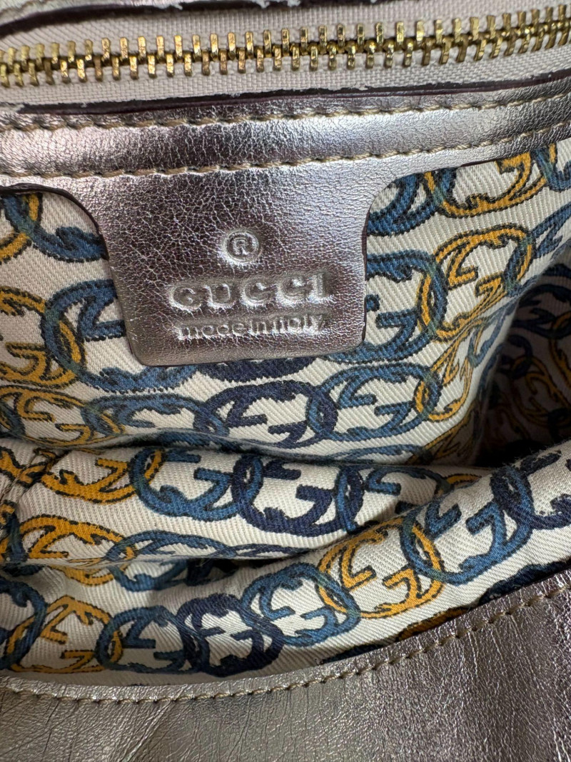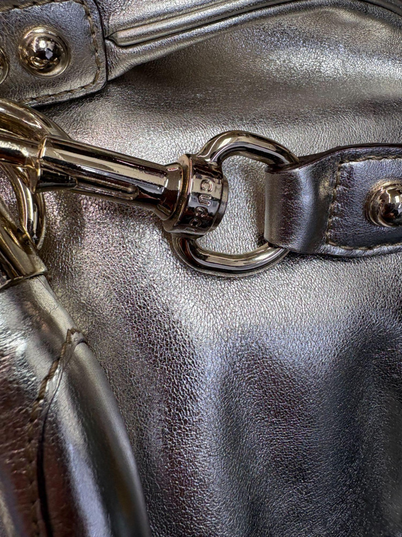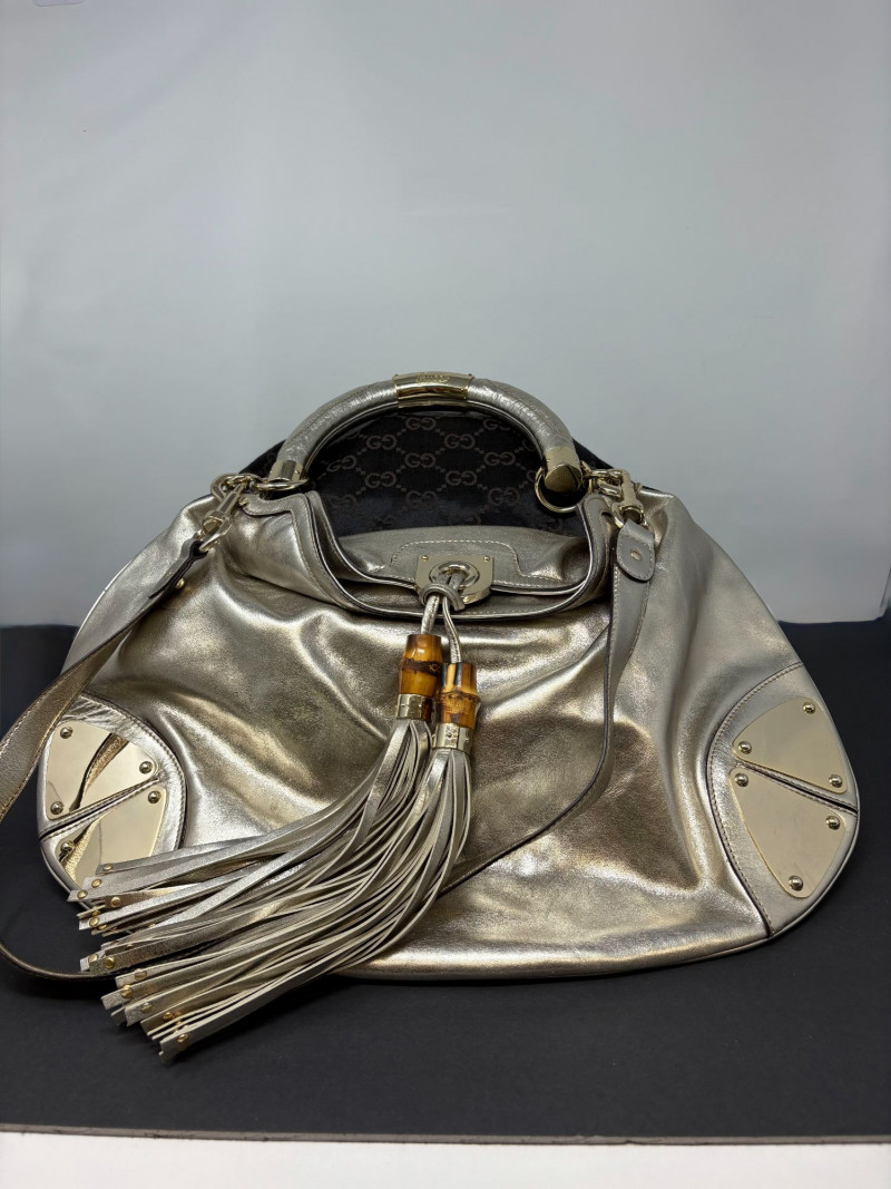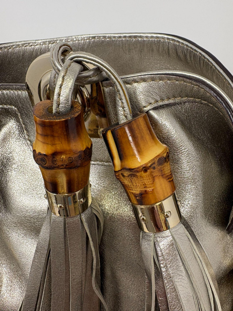 Gucci designer handbags for women embody refined elegance and enduring craftsmanship, Factory code #177088/203998. Crafted from luxurious silver metalic leather. This stunning bag is adorned with distinctive bamboo accents and stylish tassels that bring a touch of sophistication to any outfit. Exterior: Very Good – the leather remains in excellent shape with only minor black marks and slight signs of wear on the handle. Interior: Very Good – clean and well-maintained with minimal signs of use. Handle: 5" drop for easy carrying. Shoulder Strap: 16" drop for versatile shoulder or crossbody wear. Dust bag included *Please note the photo showing the slight wear on the shoulder strap.