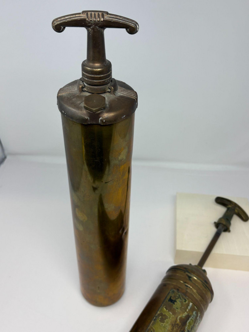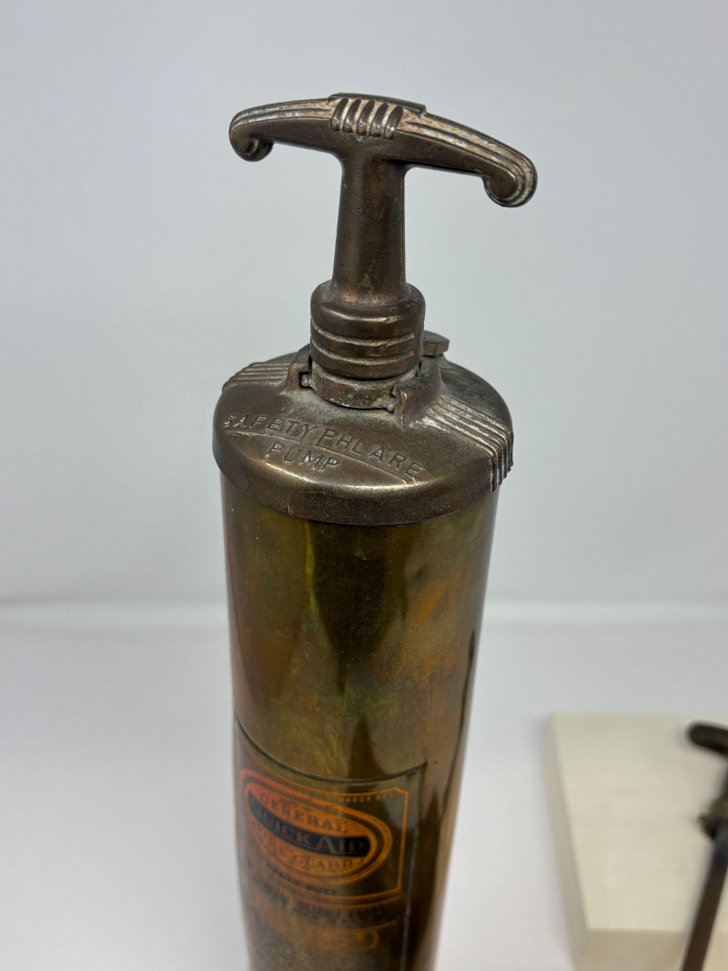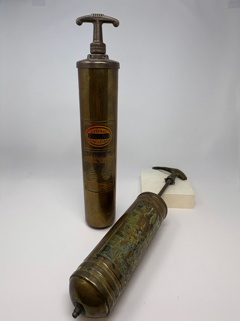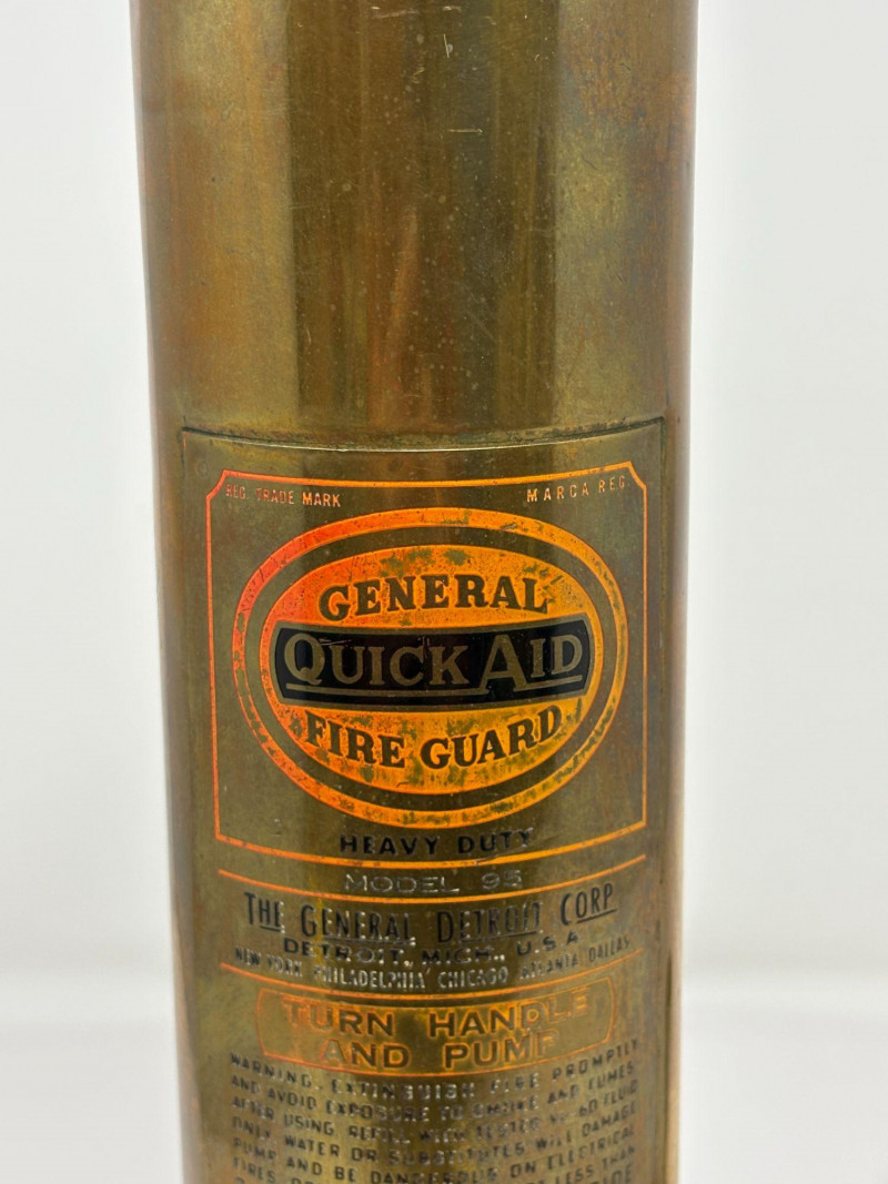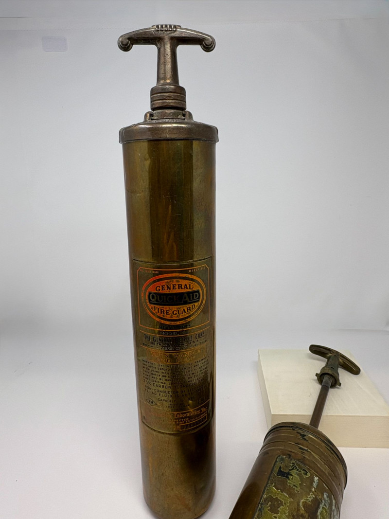 General Detroit Fire Guard 17.5 high; Solid brass Pyrene hand pump fire extinguisher 14.5 high Pair of vintage solid‑brass fire extinguishers, including a 17.5" General Detroit Fire Guard and a 14.5" Pyrene hand‑pump model. Strong industrial character, warm patina, and excellent decorative appeal.
