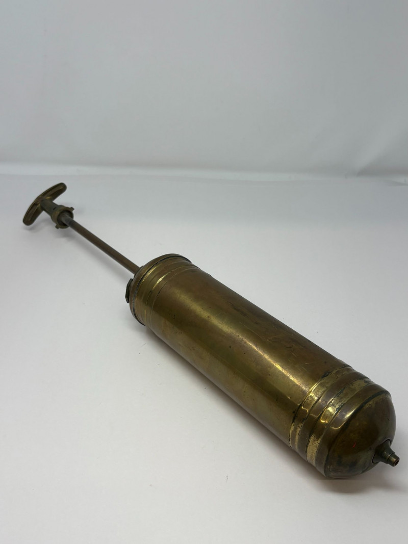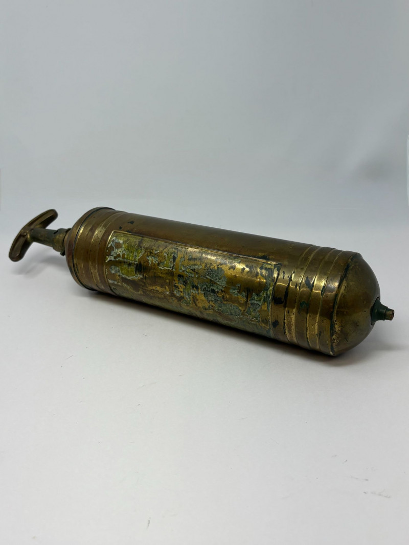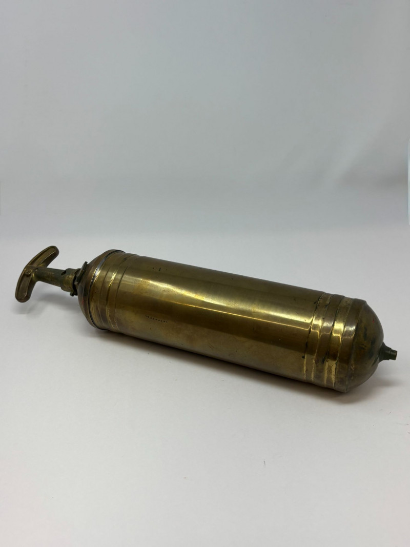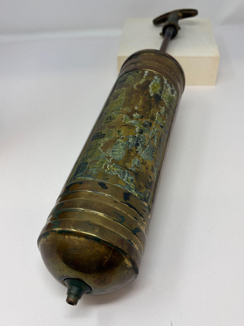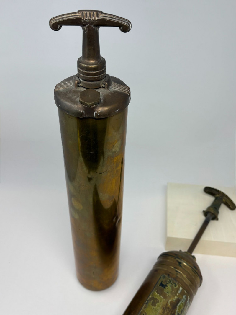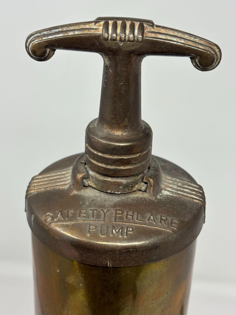 General Detroit Fire Guard 17.5 high; Solid brass Pyrene hand pump fire extinguisher 14.5 high Pair of vintage solid‑brass fire extinguishers, including a 17.5" General Detroit Fire Guard and a 14.5" Pyrene hand‑pump model. Strong industrial character, warm patina, and excellent decorative appeal.