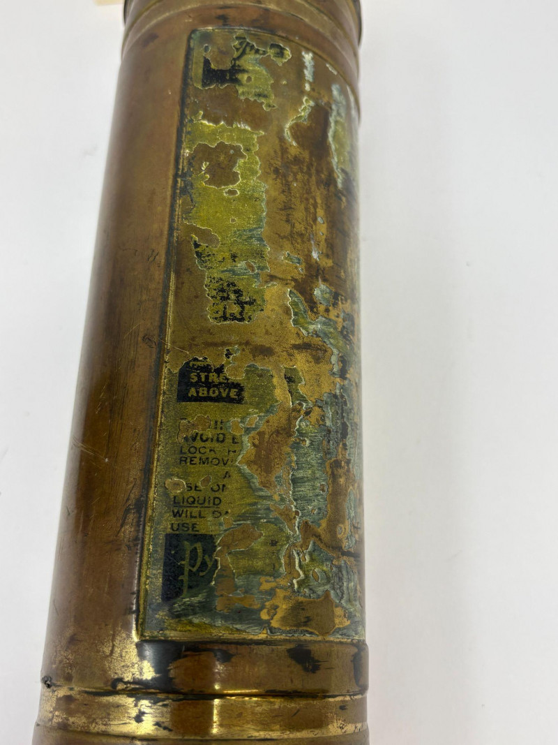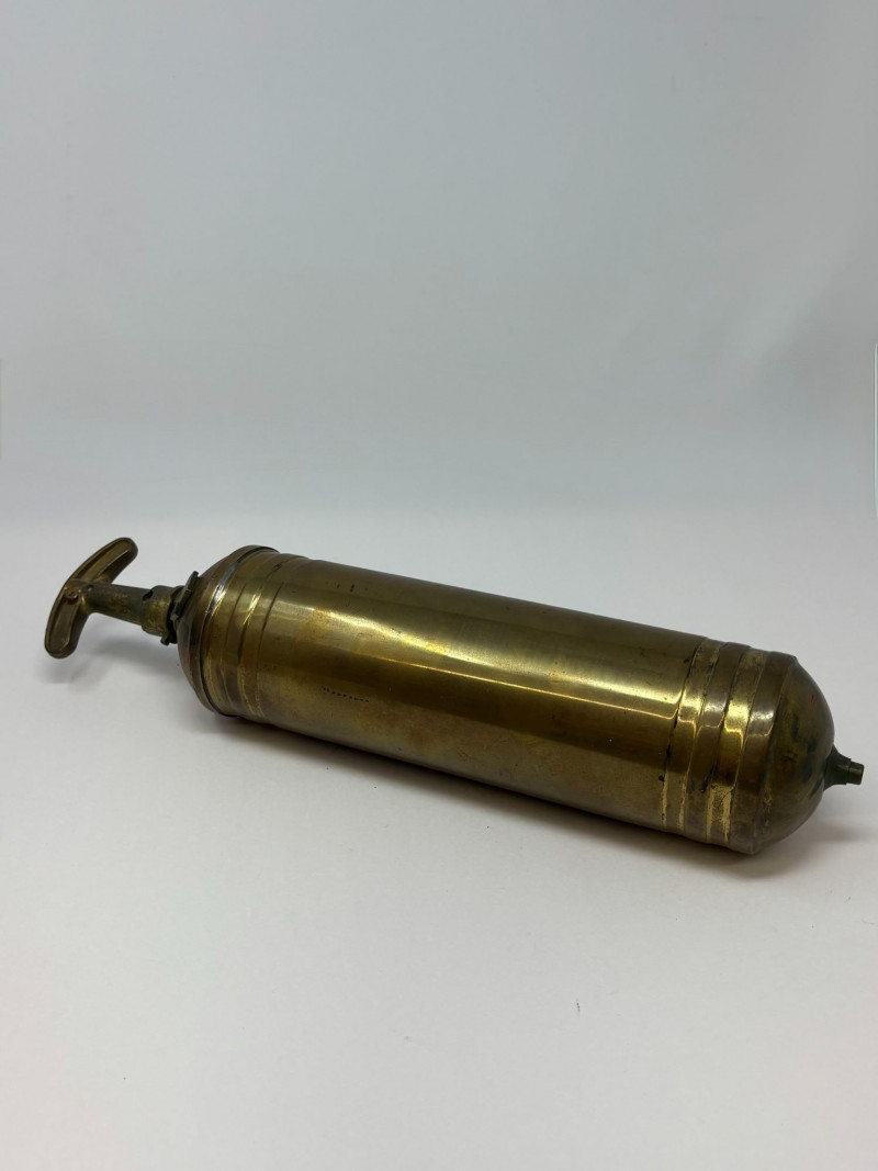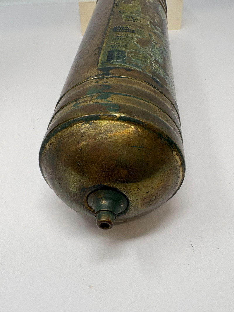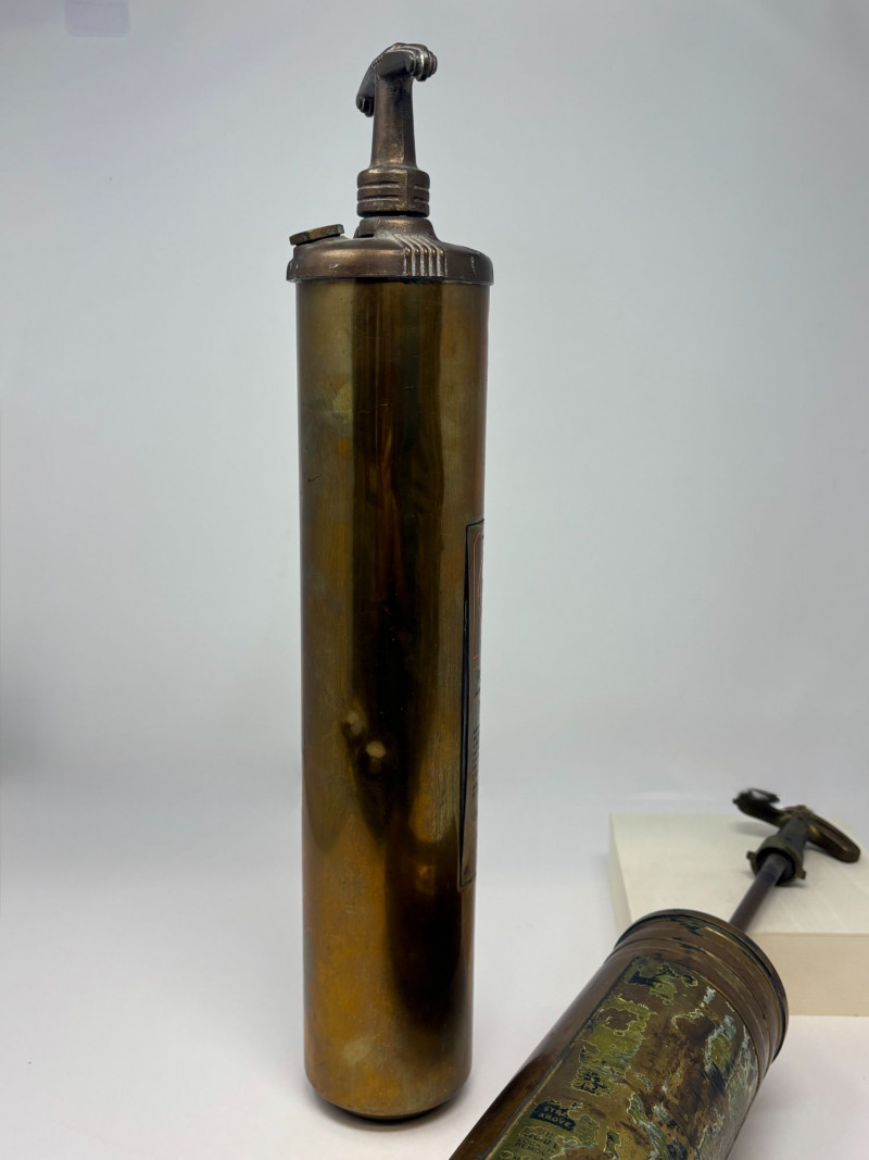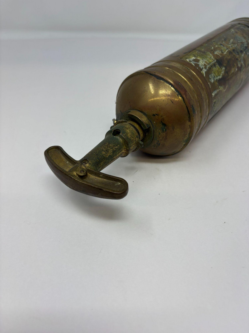 General Detroit Fire Guard 17.5 high; Solid brass Pyrene hand pump fire extinguisher 14.5 high Pair of vintage solid‑brass fire extinguishers, including a 17.5" General Detroit Fire Guard and a 14.5" Pyrene hand‑pump model. Strong industrial character, warm patina, and excellent decorative appeal.